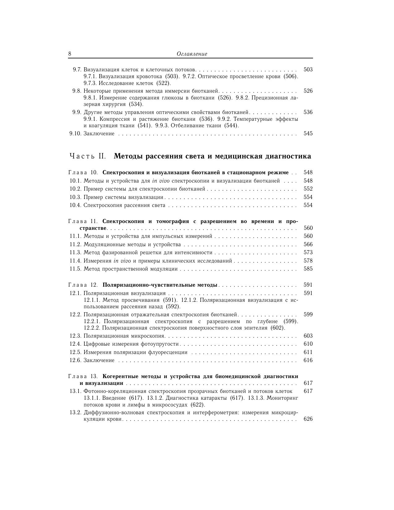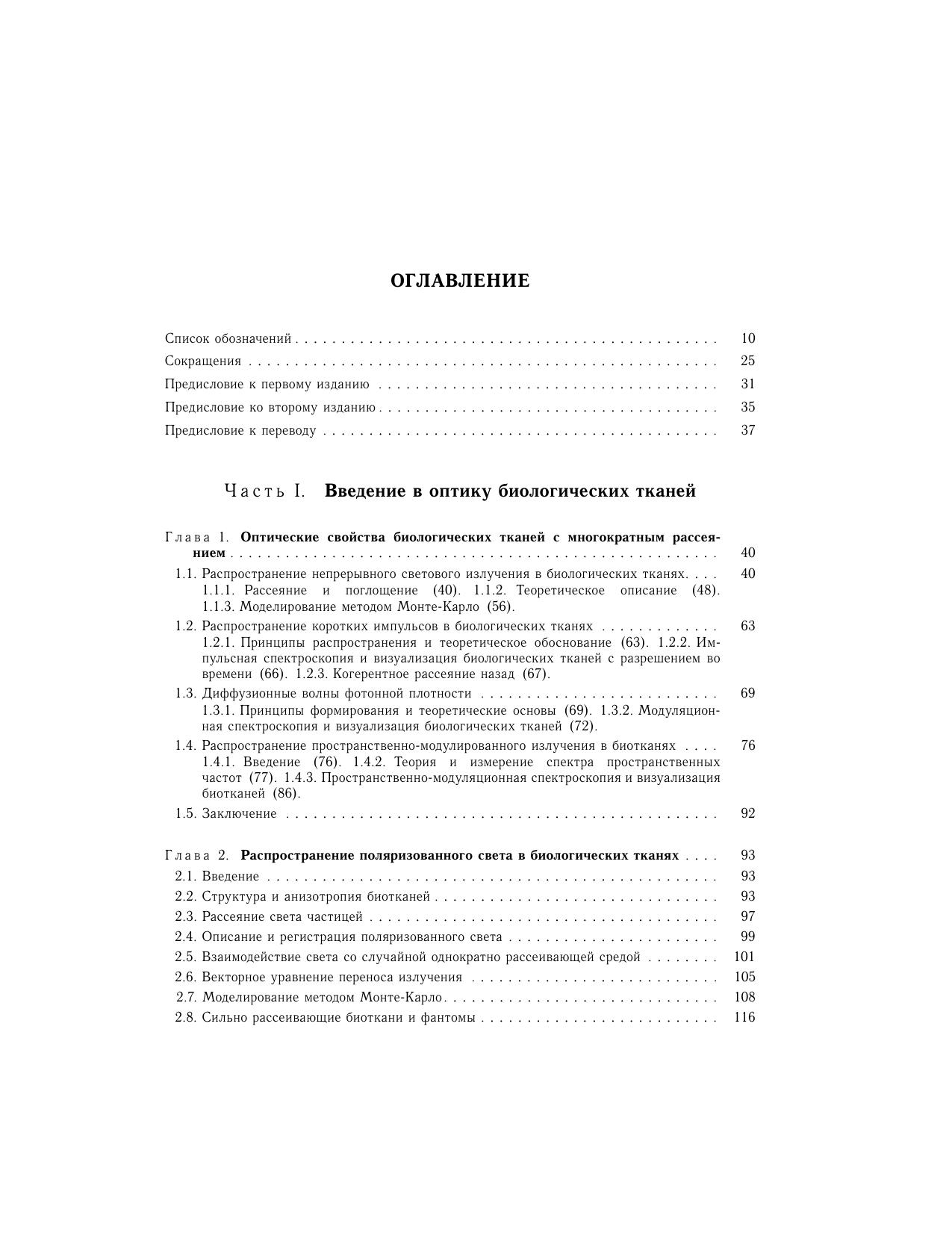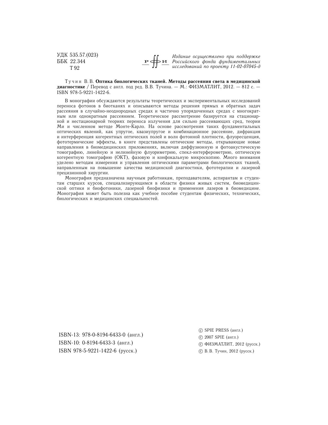 В монографии обсуждаются результаты теоретических и экспериментальных исследований переноса фотонов в биотканях и описываются методы решения прямых и обратных задач рассеяния в случайно-неоднородных средах и частично упорядоченных средах с многократным или однократным рассеянием. Теоретическое рассмотрение базируется на стационарной и нестационарной теориях переноса излучения для сильно рассеивающих сред, теории Ми и численном методе Монте-Карло. На основе рассмотрения таких фундаментальных оптических явлений, как упругое, квазиупругое и комбинационное рассеяние, дифракция и интерференция когерентных оптических полей и волн фотонной плотности, флуоресценция, фототермические эффекты, в книге представлены оптические методы, открывающие новые направления в биомедицинских приложениях, включая диффузионную и фотоакустическую томографию, линейную и нелинейную флуориметрию, спекл-интерферометрию, оптическую когерентную томографию (ОКТ), фазовую и конфокальную микроскопию. Много внимания уделено методам измерения и управления оптическими параметрами биологических тканей, направленным на повышение качества медицинской диагностики, фототерапии и лазерной прецизионной хирургии.