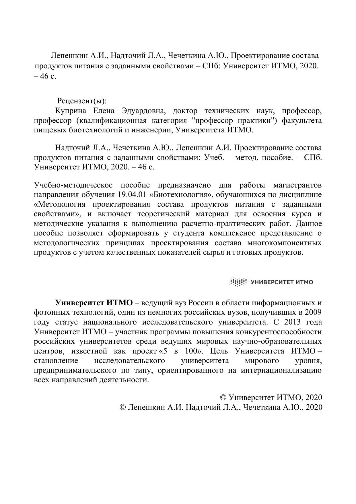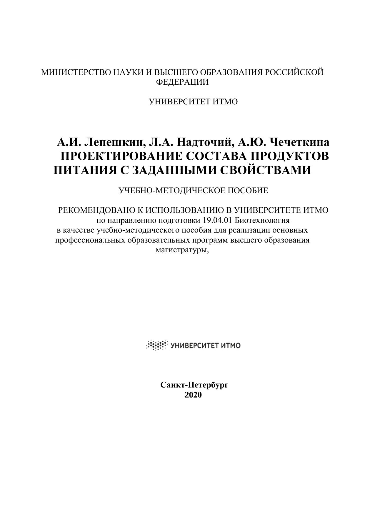 Учебно-методическое пособие предназначено для работы магистрантов направления обучения 19.04.01 «Биотехнология», обучающихся по дисциплине «Методология проектирования состава продуктов питания с заданными свойствами», и включает теоретический материал для освоения курса и методические указания к выполнению расчетно-практических работ. Данное пособие позволяет сформировать у студента комплексное представление о методологических принципах проектирования состава многокомпонентных продуктов с учетом качественных показателей сырья и готовых продуктов.