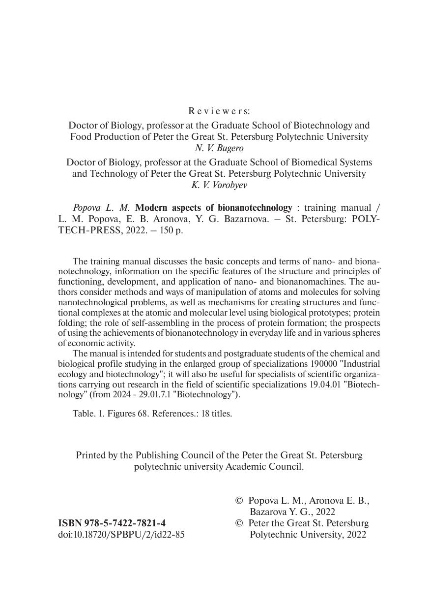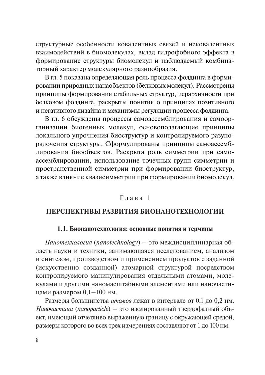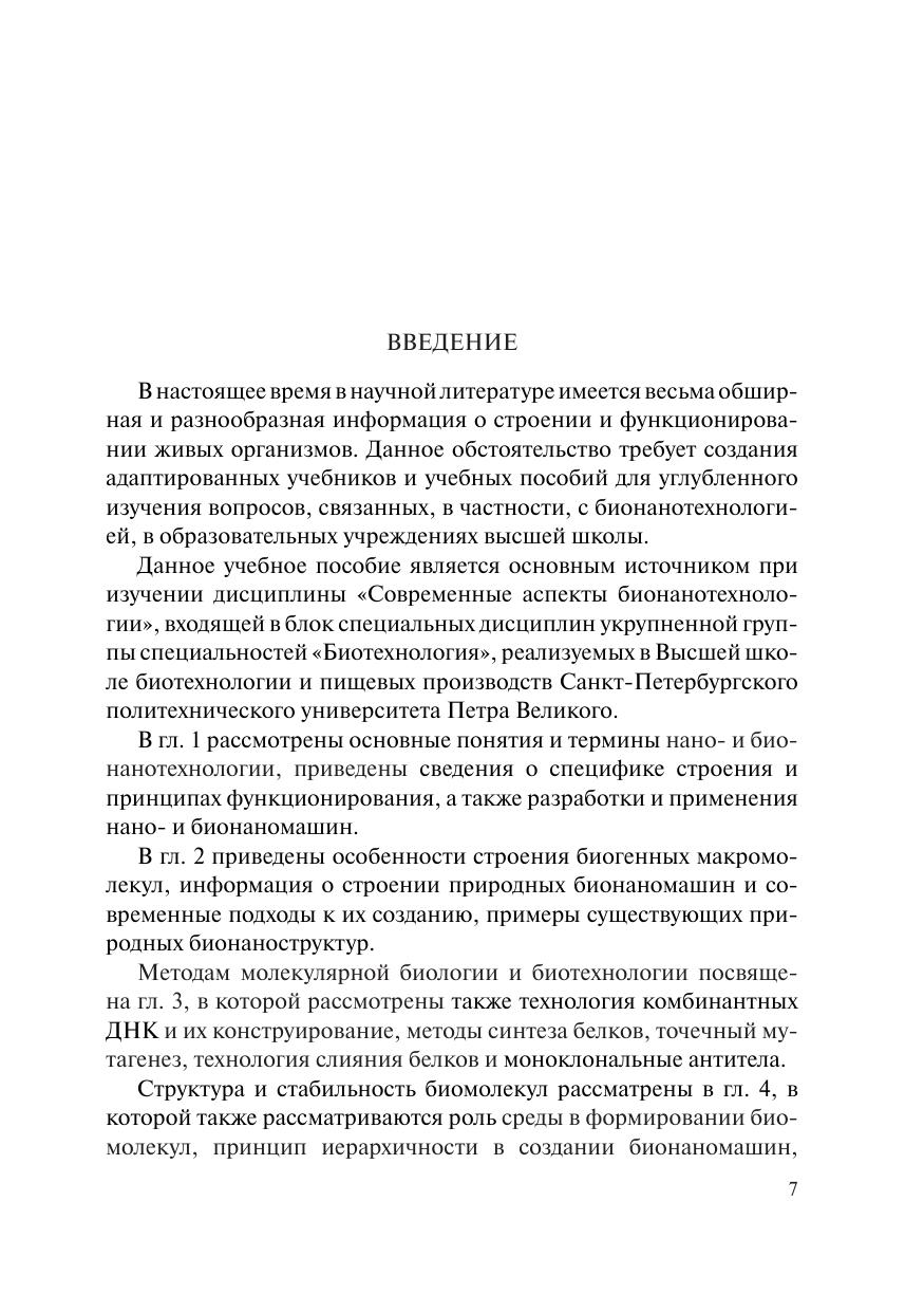 В учебном пособии обсуждаются основные понятия и термины нано- и бионанотехнологии, сведения о специфических особенностях строения и принципах функционирования, разработки и применения нано- и бионаномашин. Рассмотрены методы и способы манипуляции атомами и молекулами для решения нанотехнологических задач, а также механизмы создания структур и функциональных комплексов на атомно-молекулярном уровне с использованием биологических прототипов, фолдинг белков; роль самоассемблирования в процессе формирования белков; перспективы использования достижений бионанотехнологий в повседневной жизни человека и различных областях хозяйственной деятельности. Учебное пособие предназначено для студентов и аспирантов химико-биологического профиля, обучающихся по укрупненной группе специальностей 190000 «Промышленная экология и биотехнологии», а также будет полезно для специалистов научных организаций, выполняющих исследования в сфере научных специальностей 19.04.01 «Биотехнология» (с 2024 г. – 29.01.7.1 «Биотехнология»).