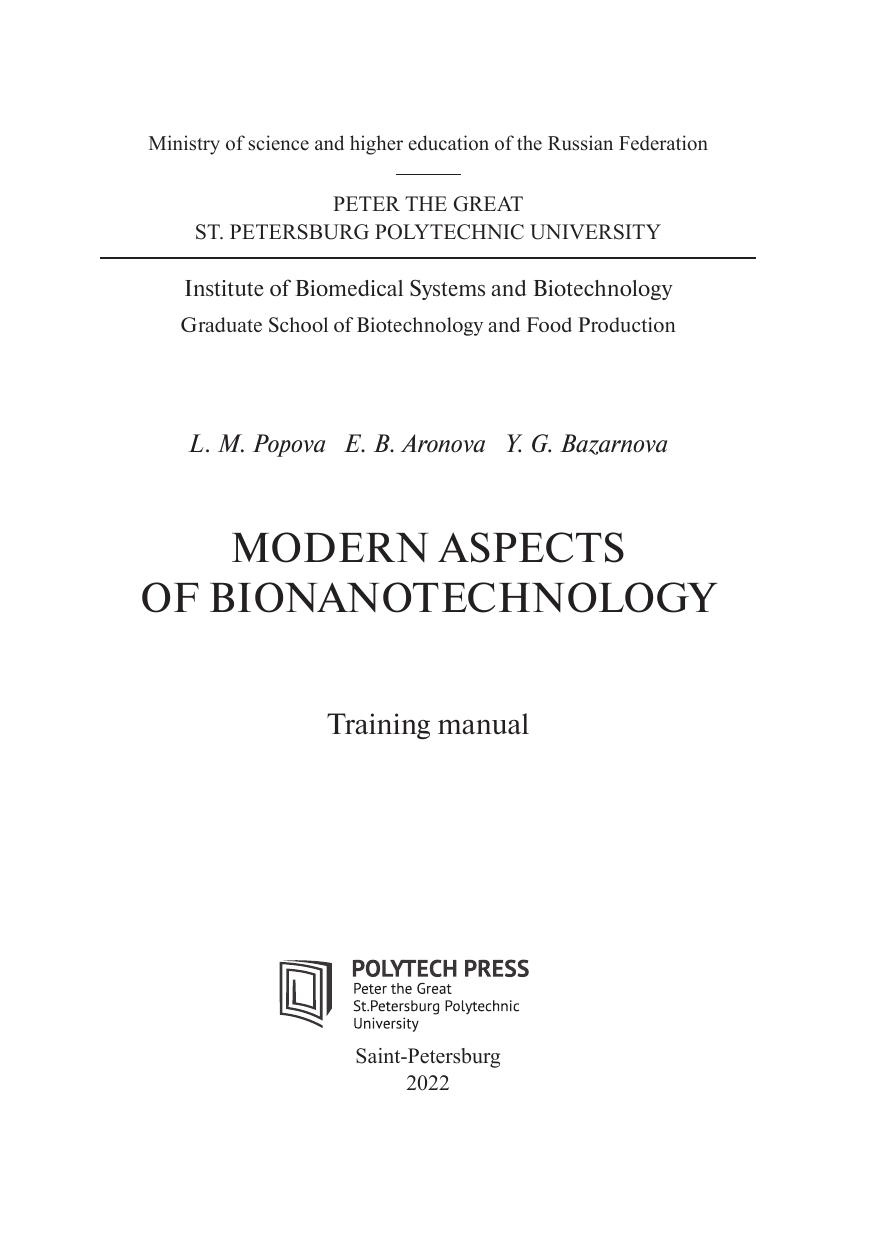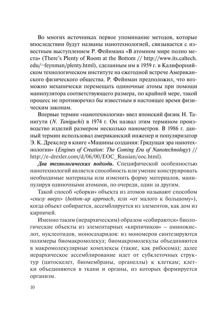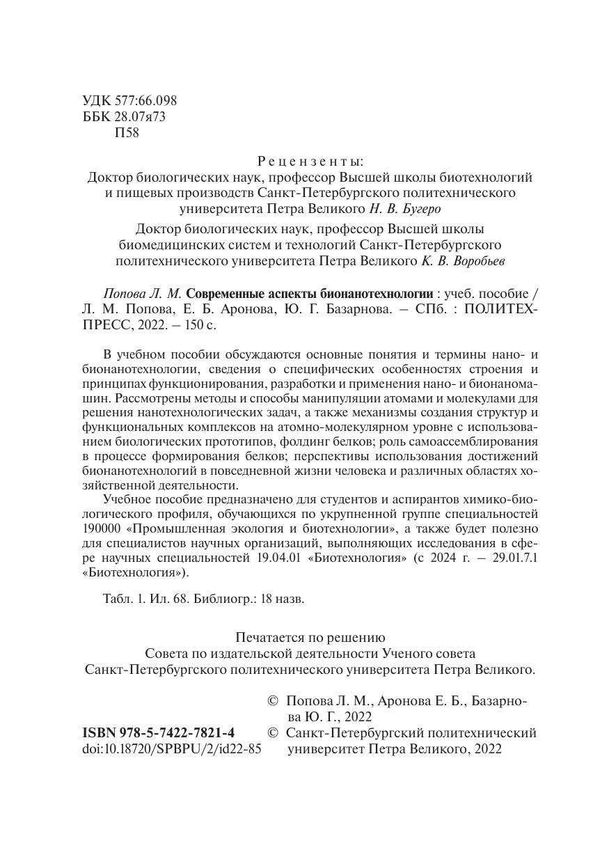 В учебном пособии обсуждаются основные понятия и термины нано- и бионанотехнологии, сведения о специфических особенностях строения и принципах функционирования, разработки и применения нано- и бионаномашин. Рассмотрены методы и способы манипуляции атомами и молекулами для решения нанотехнологических задач, а также механизмы создания структур и функциональных комплексов на атомно-молекулярном уровне с использованием биологических прототипов, фолдинг белков; роль самоассемблирования в процессе формирования белков; перспективы использования достижений бионанотехнологий в повседневной жизни человека и различных областях хозяйственной деятельности. Учебное пособие предназначено для студентов и аспирантов химико-биологического профиля, обучающихся по укрупненной группе специальностей 190000 «Промышленная экология и биотехнологии», а также будет полезно для специалистов научных организаций, выполняющих исследования в сфере научных специальностей 19.04.01 «Биотехнология» (с 2024 г. – 29.01.7.1 «Биотехнология»).