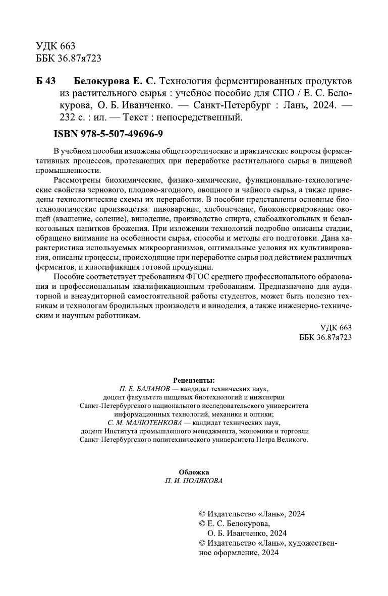 В учебном пособии изложены общетеоретические и практические вопросы ферментативных процессов, протекающих при переработке растительного сырья в пищевой промышленности. Рассмотрены биохимические, физико-химические, функционально-технологические свойства зернового, плодово-ягодного, овощного и чайного сырья, а также приведены технологические схемы их переработки. В пособии представлены основные биотехнологические производства: пивоварение, хлебопечение, биоконсервирование овощей (квашение, соление), виноделие, производство спирта, слабоалкогольных и безалкогольных напитков брожения. При изложении технологий подробно описаны стадии, обращено внимание на особенности сырья, способы и методы его подготовки. Дана характеристика используемых микроорганизмов, оптимальные условия их культивирования, описаны процессы, происходящие при переработке сырья под действием различных ферментов, и классификация готовой продукции. Пособие соответствует требованиям ФГОС среднего профессионального образования и профессиональным квалификационным требованиям. Предназначено для аудиторной и внеаудиторной самостоятельной работы студентов, может быть полезно техникам и технологам бродильных производств и виноделия, а также инженерно-техническим и научным работникам.
