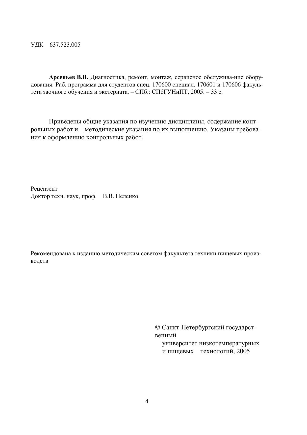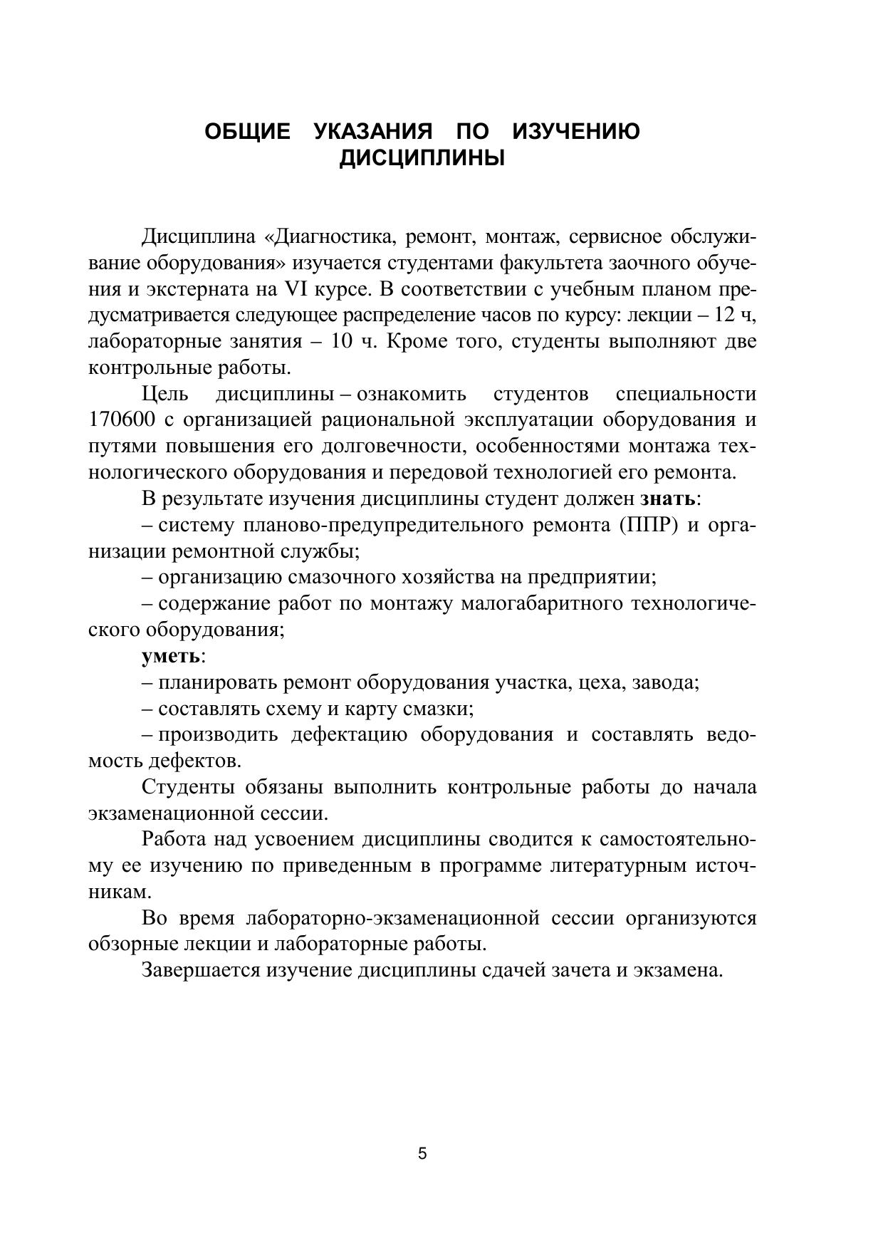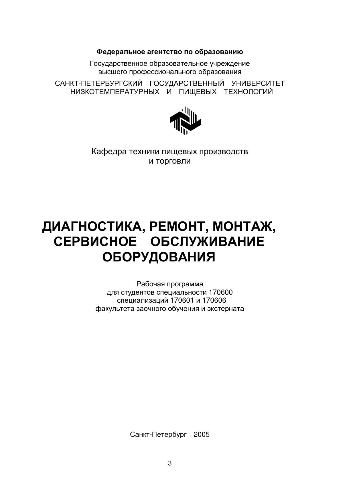 Диагностика, ремонт, монтаж, сервисное обслуживание оборудования: Рабочая программа для студентов спец. 170600 специал. 170601 и 170606 факультета заочного обучения и экстерната