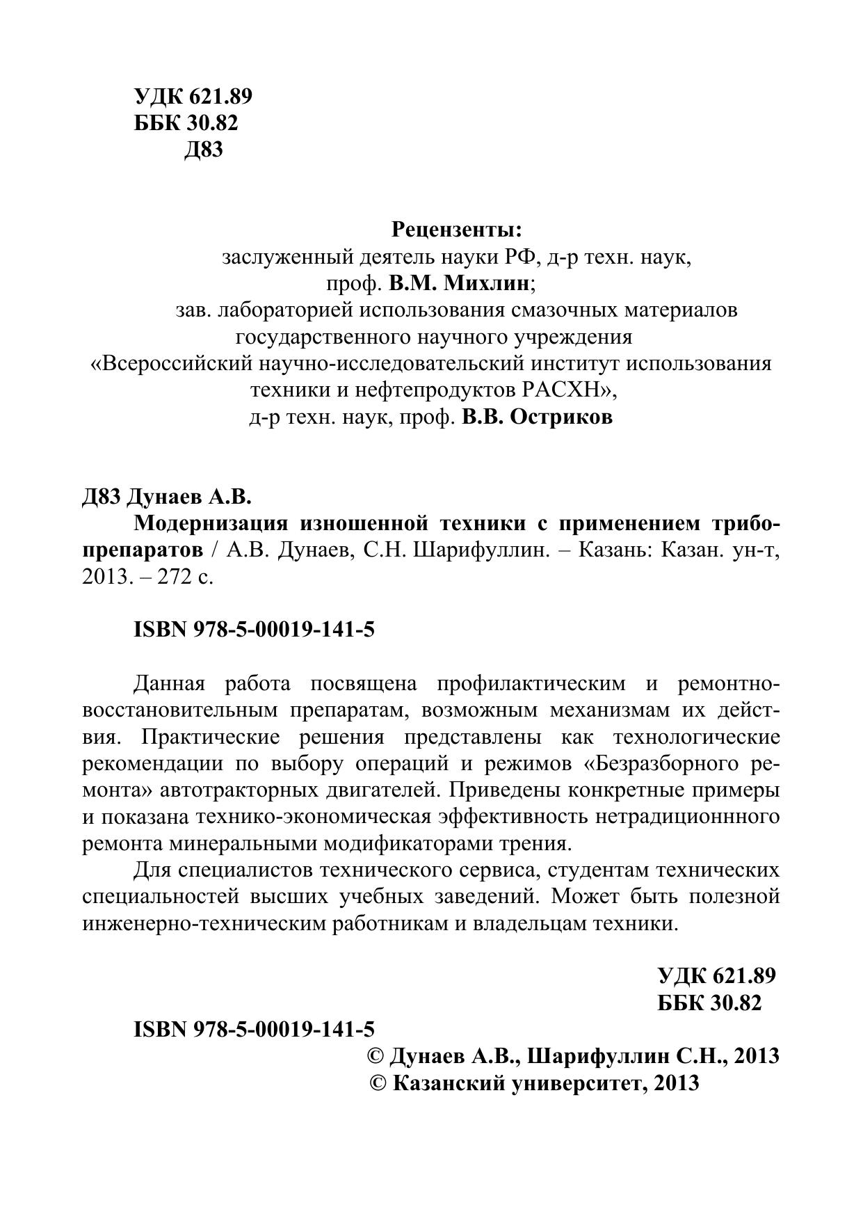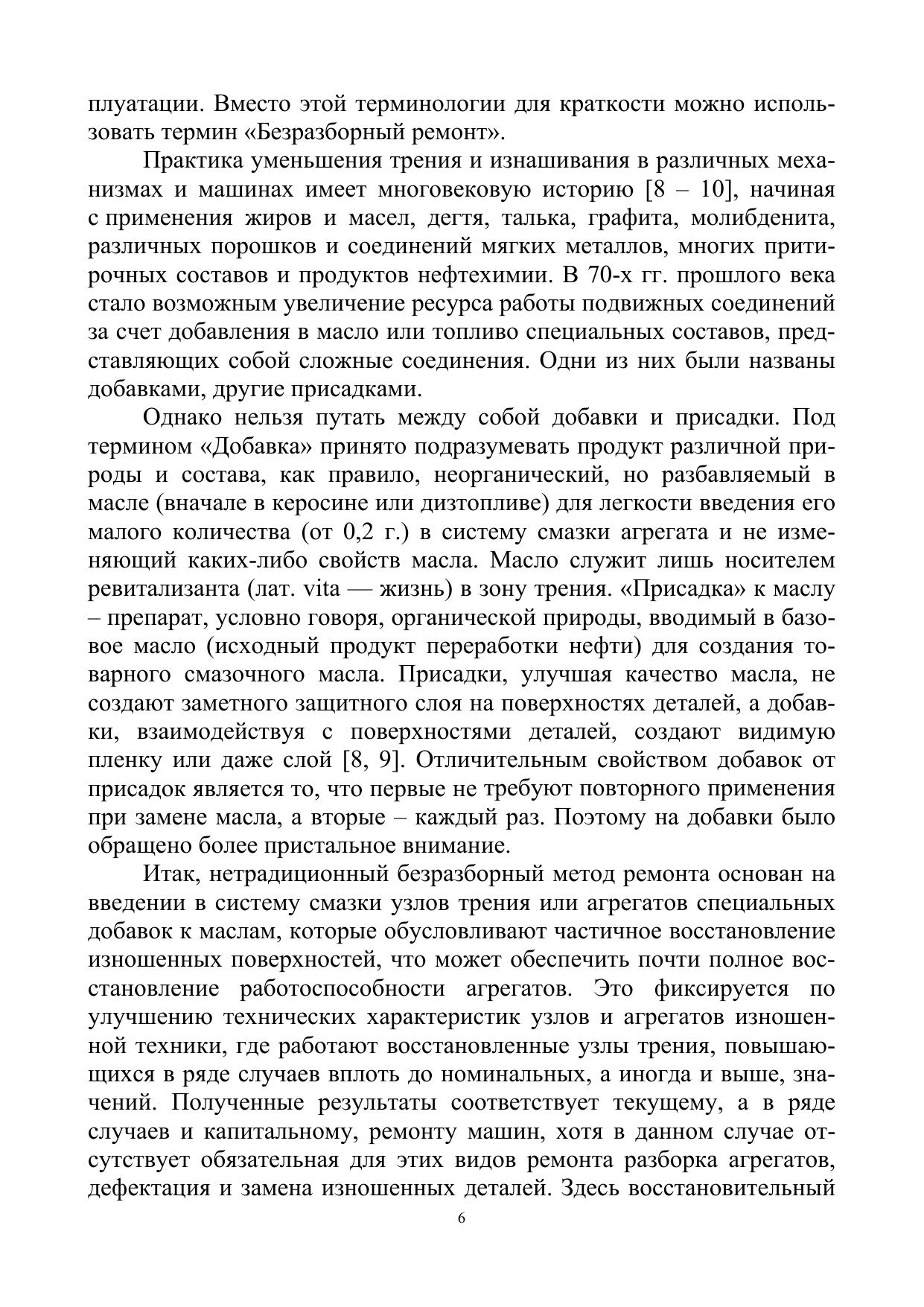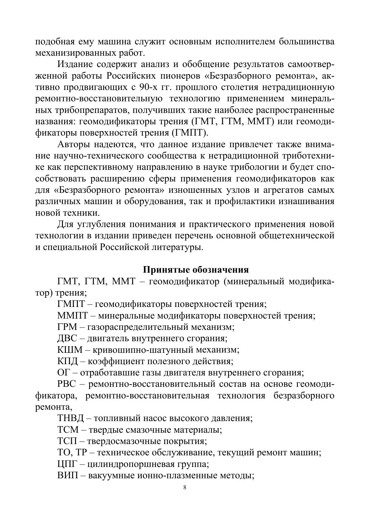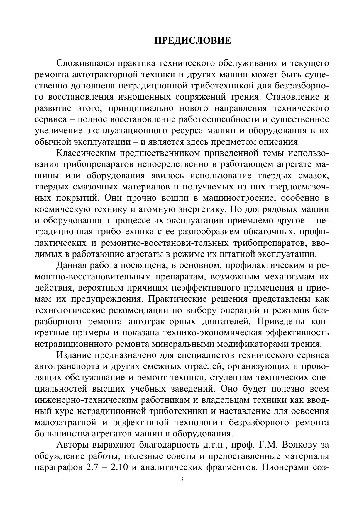 Данная работа посвящена профилактическим и ремонтно-восстановительным препаратам, возможным механизмам их действия. Практические решения представлены как технологические рекомендации по выбору операций и режимов «Безразборного ремонта» автотракторных двигателей. Приведены конкретные примеры и показана технико-экономическая эффективность нетрадиционнного ремонта минеральными модификаторами трения. Для специалистов технического сервиса, студентам технических специальностей высших учебных заведений. Может быть полезной инженерно-техническим работникам и владельцам техники.