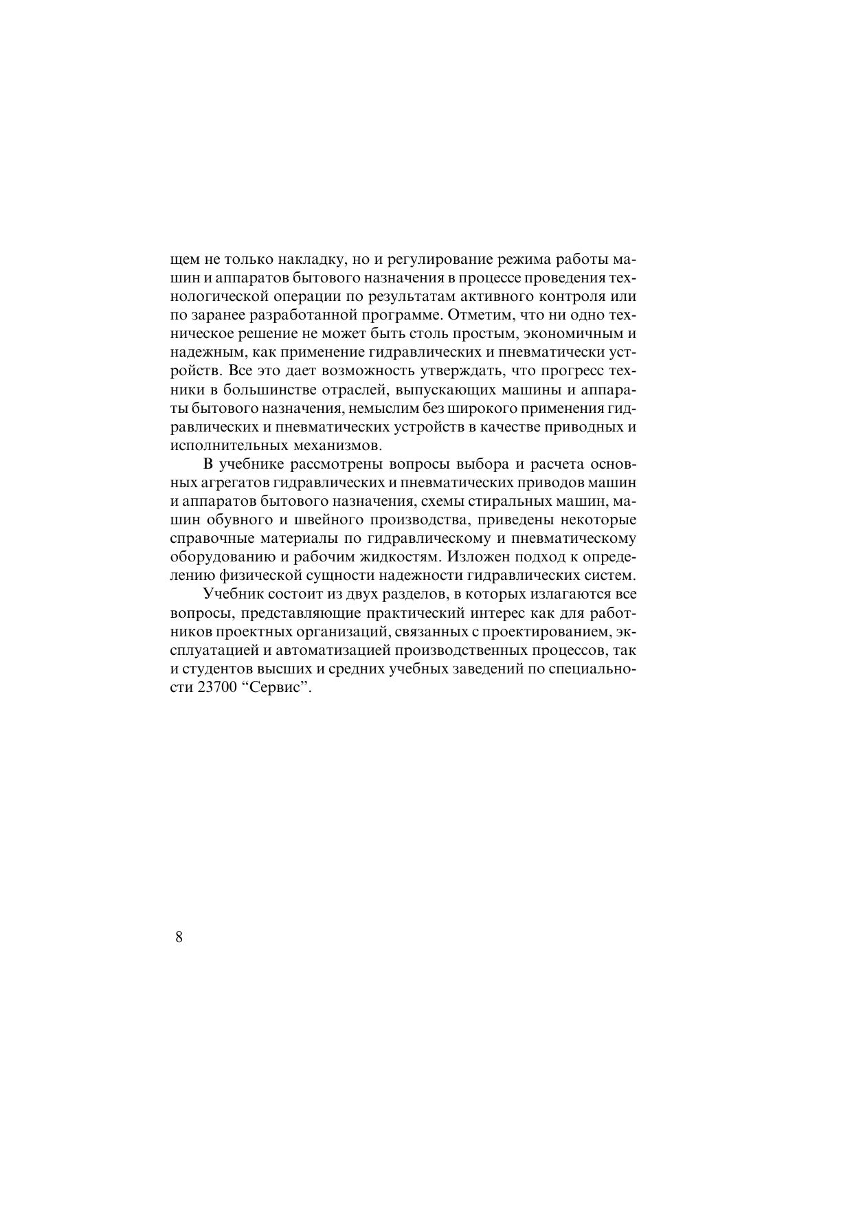 Современные предприятия сферы сервиса оснащены гидравлическими и пневматическими приводами, машинами и аппаратами бытового назначения, имеющими разветвленную сеть трубопроводов: насосами, фильтрами, устройствами, исполнительными механизмами, вентиляторами, емкостями для хранения различных жидкостей, моющих растворов и других типовых элементов. В учебнике дан анализ условий работы элементов гидросистем, приведены показатели надежности некоторых элементов, выбор и расчет надежности и прочности гидро- и пневмоаппаратуры элементов бытовых машин и приборов, пути повышения их надежности. Приведены принципиальные схемы функционирования систем гидроприводов машин швейного и обувного производства, бытовых стиральных и посудомоечных машин. Для студентов высших и средних специальных учебных заведений, обучающихся по специальности 23700 "Сервис", а также для инженерно-технических работников, связанных с проектированием и эксплуатацией гидравлических и пневматических систем бытового назначения.