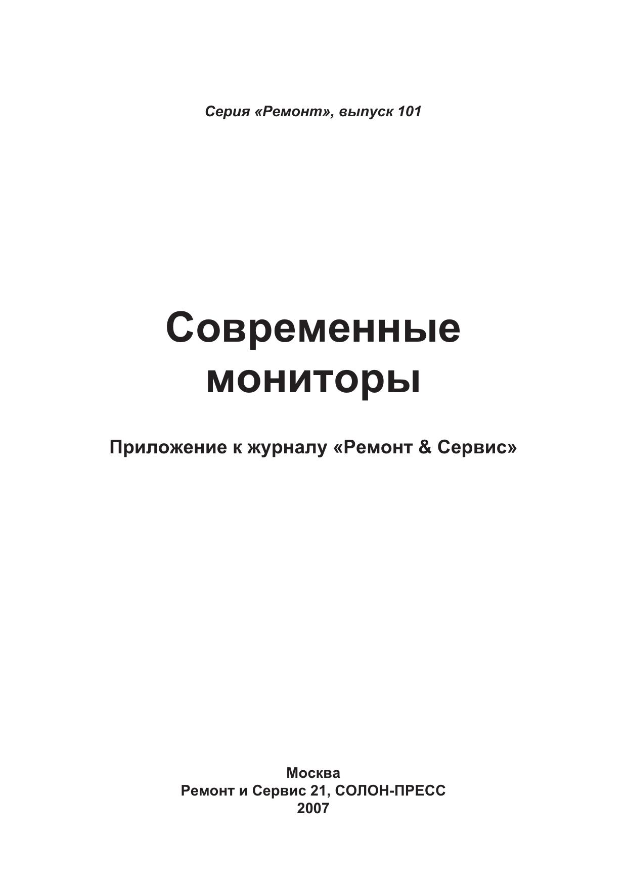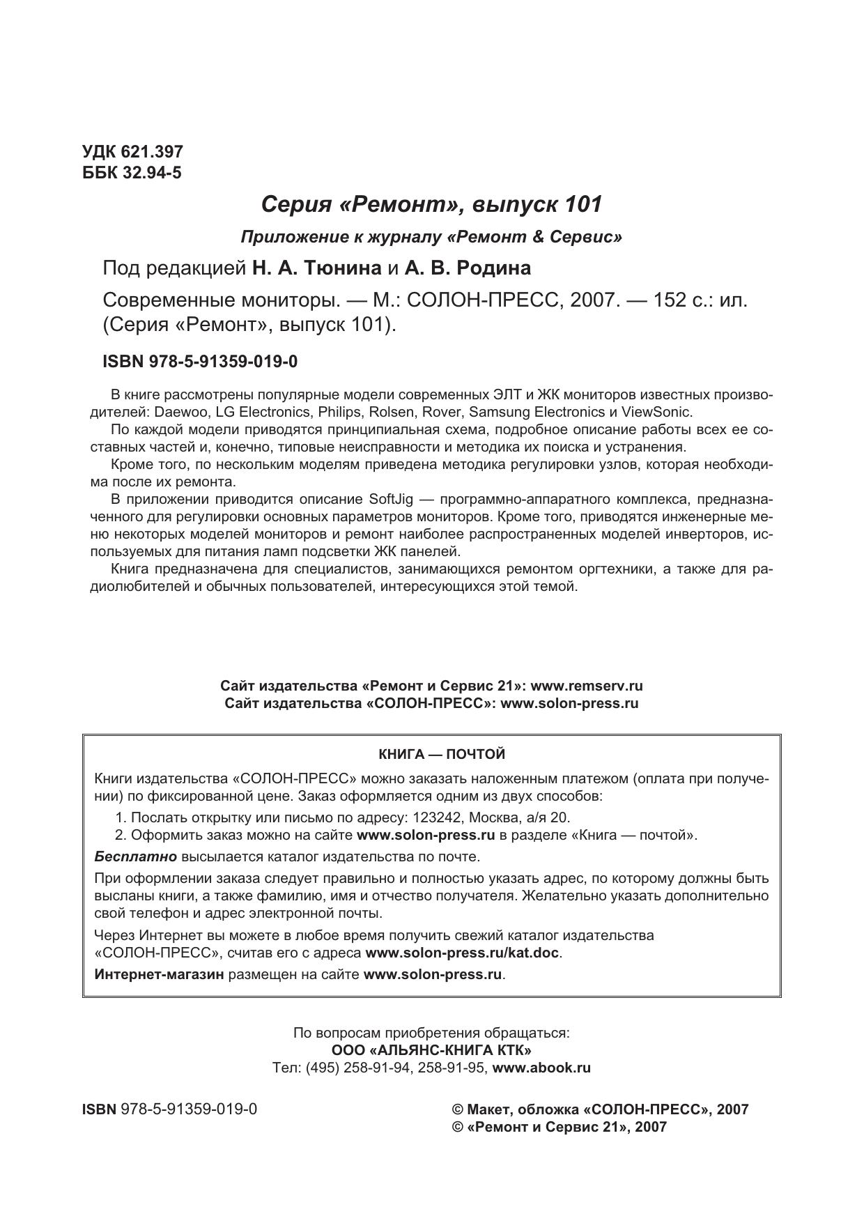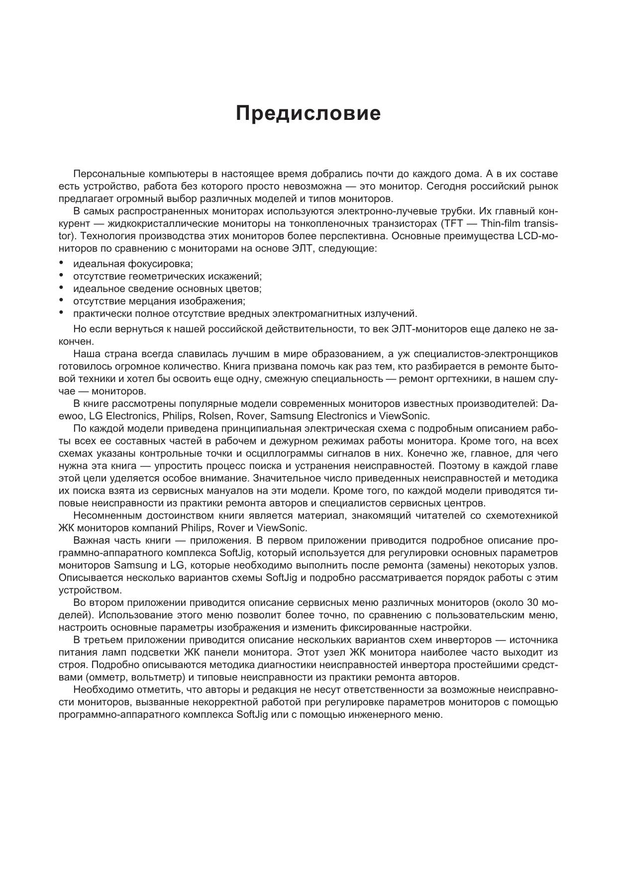 В книге рассмотрены популярные модели современных ЭЛТ и ЖК мониторов известных производителей: Daewoo, LG Electronics, Philips, Rolsen, Rover, Samsung Electronics и ViewSonic. По каждой модели приводятся принципиальная схема, подробное описание работы всех ее составных частей и, конечно, типовые неисправности и методика их поиска и устранения. Кроме того, по нескольким моделям приведена методика регулировки узлов, которая необходима после их ремонта. В приложении приводится описание SoftJig — программно-аппаратного комплекса, предназначенного для регулировки основных параметров мониторов. Кроме того, приводятся инженерные меню некоторых моделей мониторов и ремонт наиболее распространенных моделей инверторов, используемых для питания ламп подсветки ЖК панелей. Книга предназначена для специалистов, занимающихся ремонтом оргтехники, а также для радиолюбителей и обычных пользователей, интересующихся этой темой.