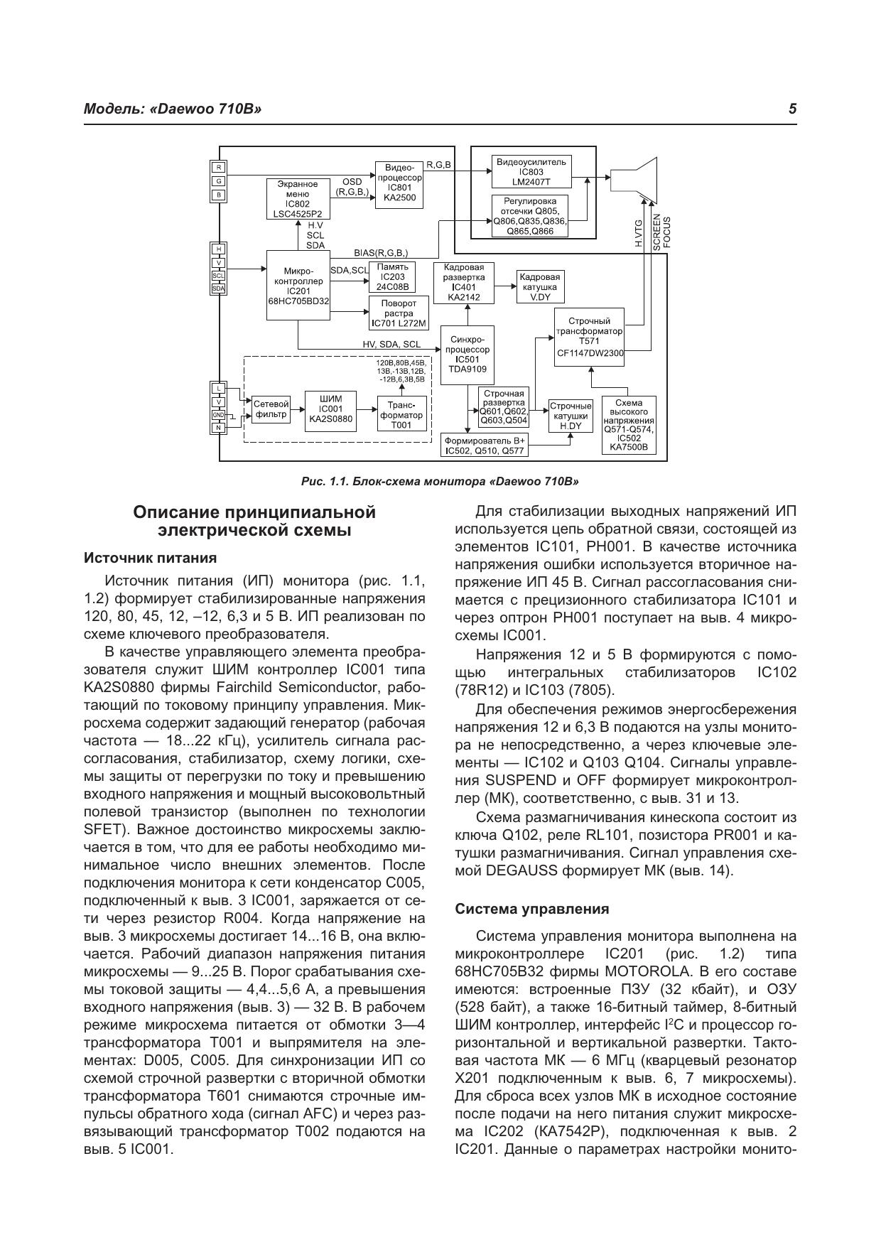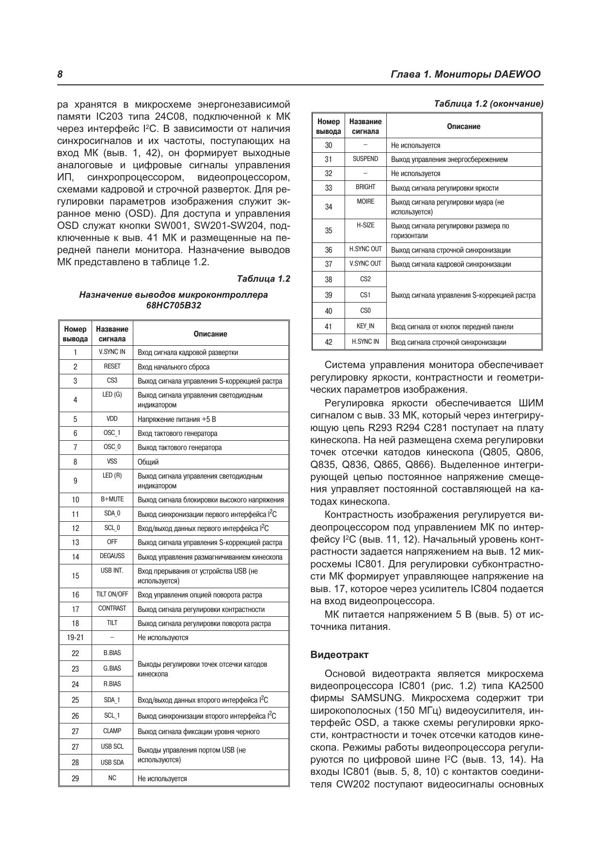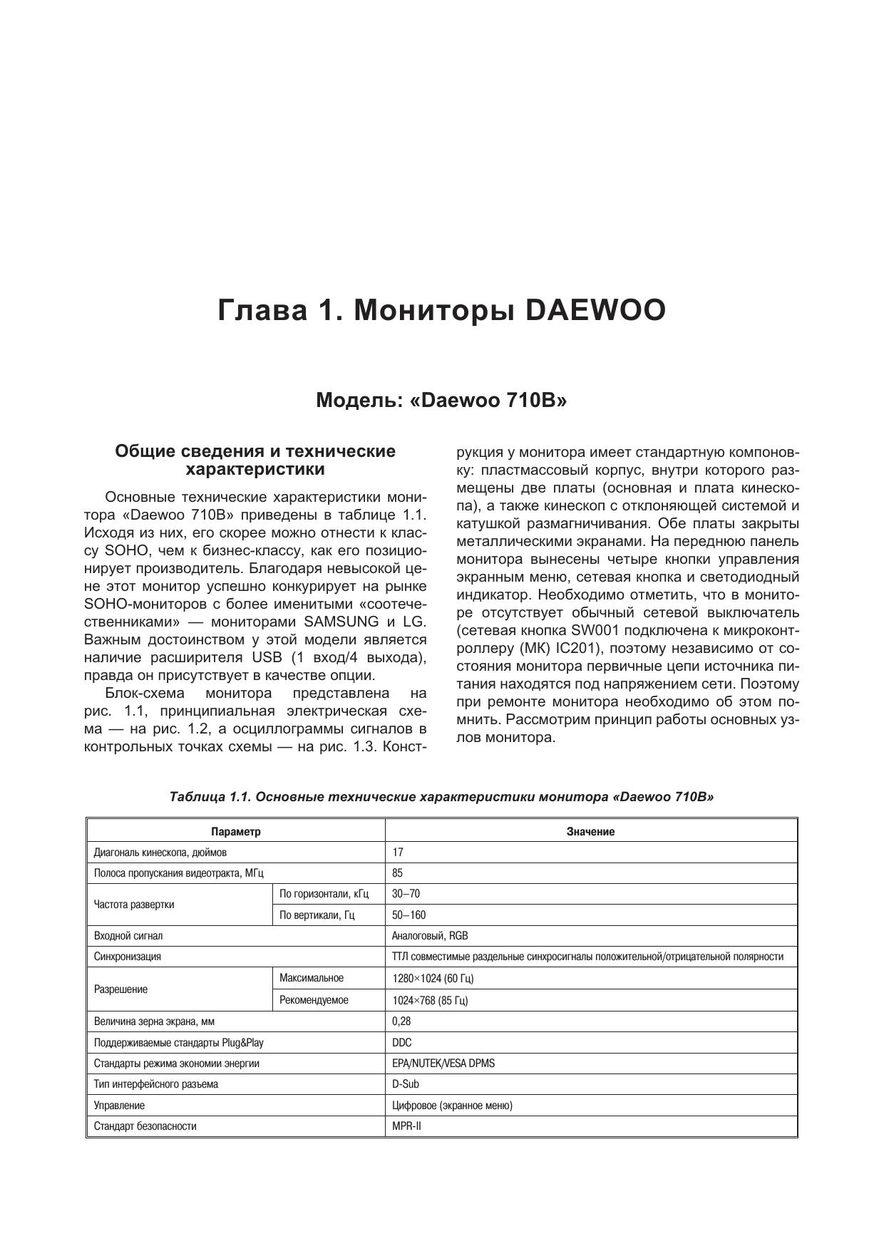 В книге рассмотрены популярные модели современных ЭЛТ и ЖК мониторов известных производителей: Daewoo, LG Electronics, Philips, Rolsen, Rover, Samsung Electronics и ViewSonic. По каждой модели приводятся принципиальная схема, подробное описание работы всех ее составных частей и, конечно, типовые неисправности и методика их поиска и устранения. Кроме того, по нескольким моделям приведена методика регулировки узлов, которая необходима после их ремонта. В приложении приводится описание SoftJig — программно-аппаратного комплекса, предназначенного для регулировки основных параметров мониторов. Кроме того, приводятся инженерные меню некоторых моделей мониторов и ремонт наиболее распространенных моделей инверторов, используемых для питания ламп подсветки ЖК панелей. Книга предназначена для специалистов, занимающихся ремонтом оргтехники, а также для радиолюбителей и обычных пользователей, интересующихся этой темой.