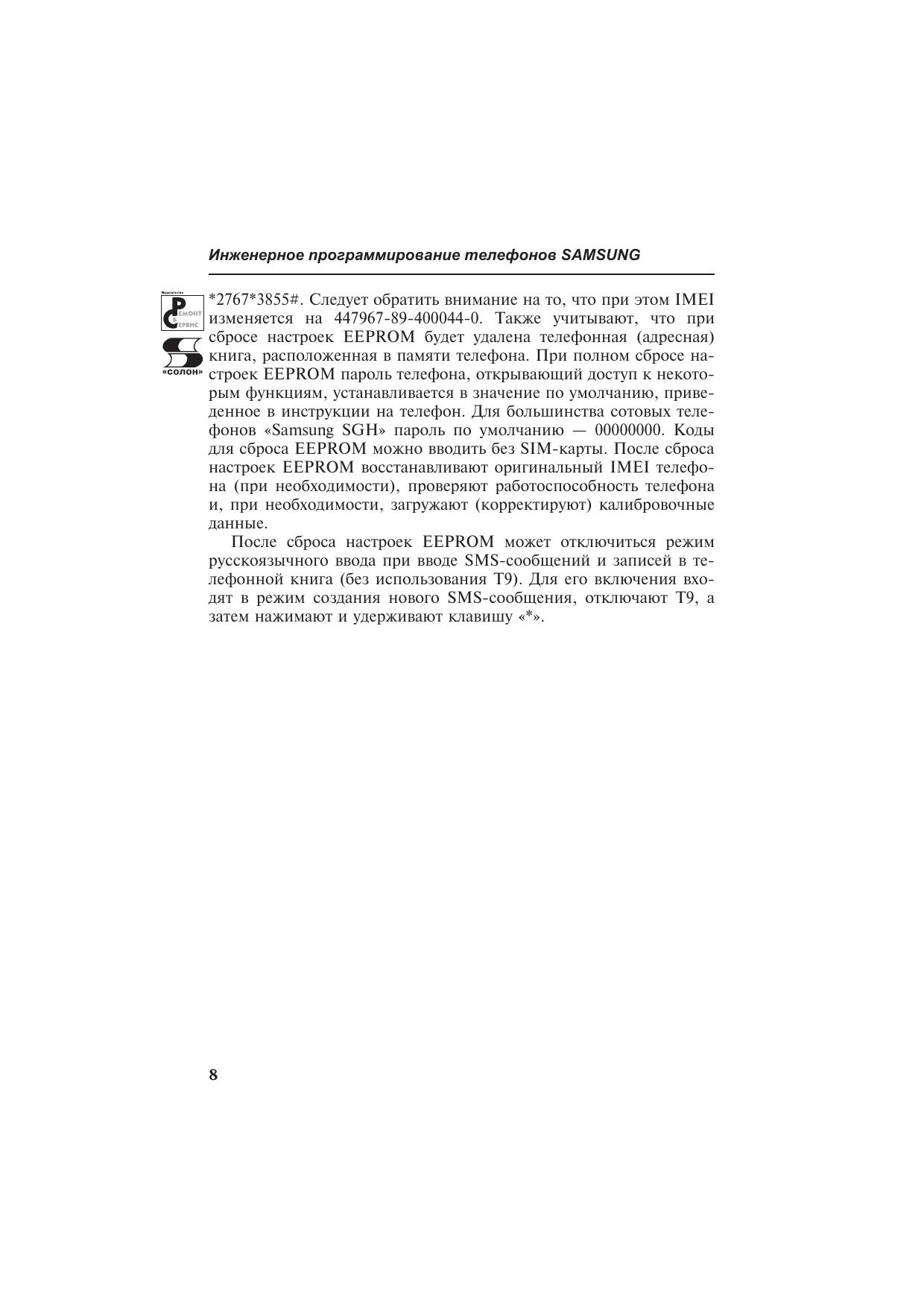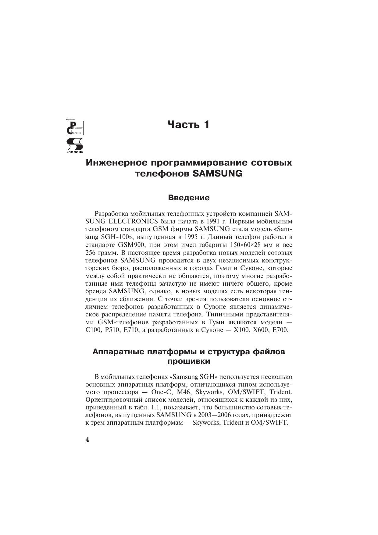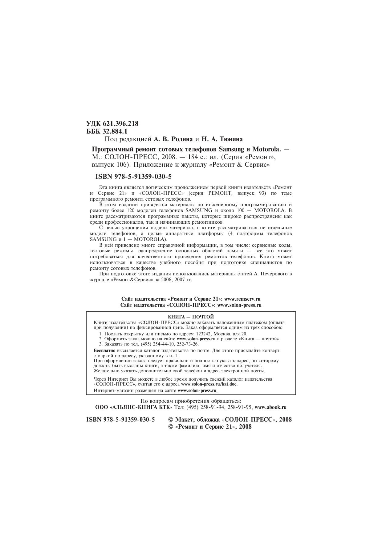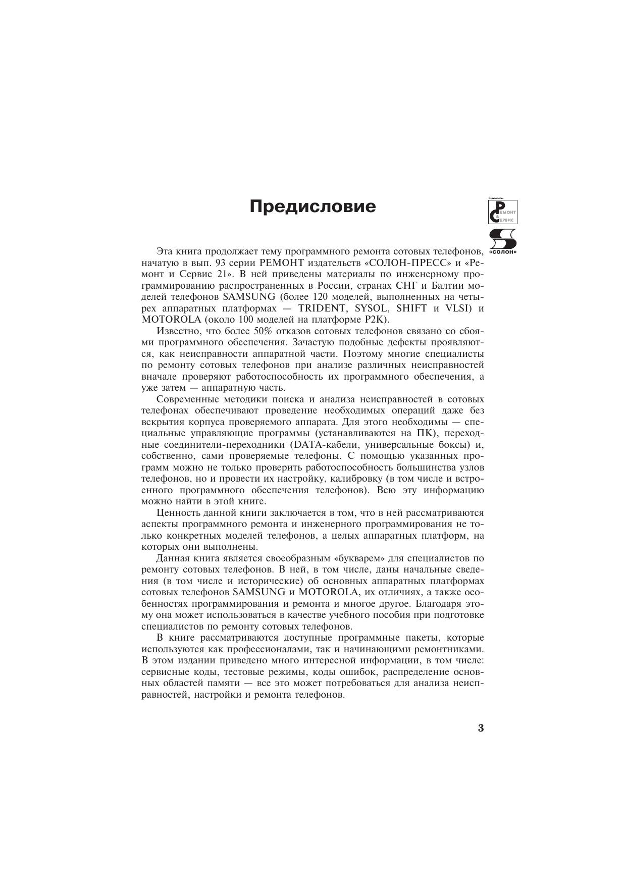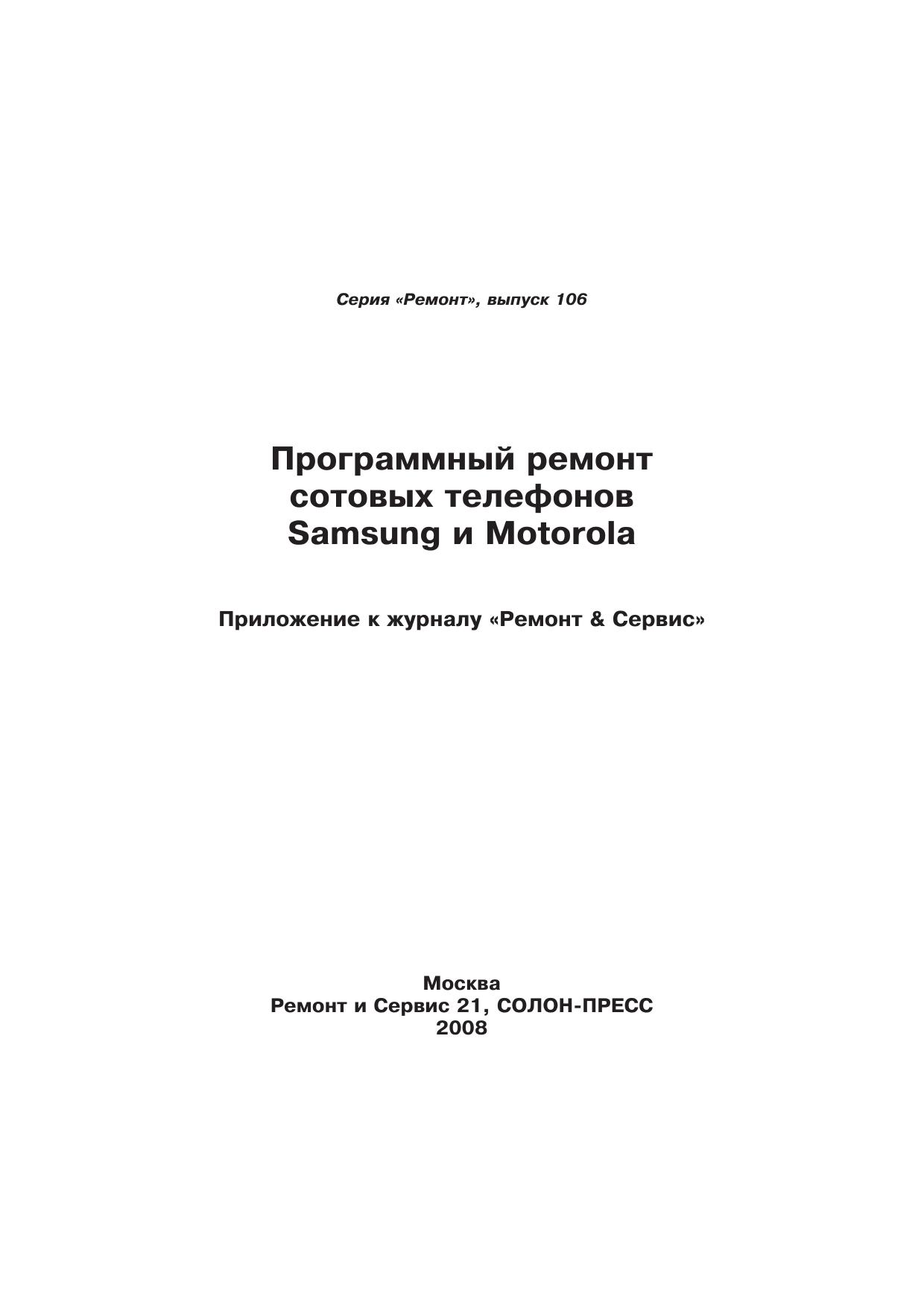 Эта книга является логическим продолжением первой книги издательств «Ремонт и Сервис 21» и «СОЛОН-ПРЕСС» (серия РЕМОНТ, выпуск 93) по теме программного ремонта сотовых телефонов. В этом издании приводятся материалы по инженерному программированию и ремонту более 120 моделей телефонов SAMSUNG и около 100 — MOTOROLA. В книге рассматриваются программные пакеты, которые широко распространены как среди профессионалов, так и начинающих ремонтников.С целью упрощения подачи материала, в книге рассматриваются не отдельные модели телефонов, а целые аппаратные платформы (4 платформы телефонов SAMSUNG и 1 — MOTOROLA). В ней приведено много справочной информации, в том числе: сервисные коды, тестовые режимы, распределение основных областей памяти — все это может потребоваться для качественного проведения ремонтов телефонов. Книга может использоваться в качестве учебного пособия при подготовке специалистов по ремонту сотовых телефонов. При подготовке этого издания использовались материалы статей А. Печерового в журнале «Ремонт&Сервис» за 2006, 2007 гг.