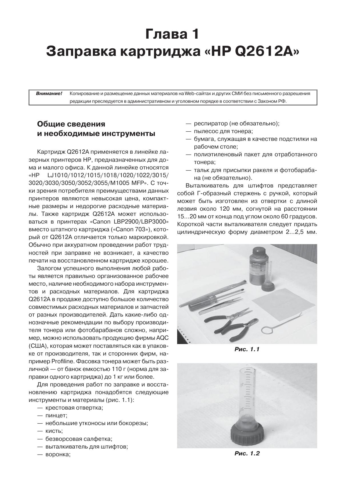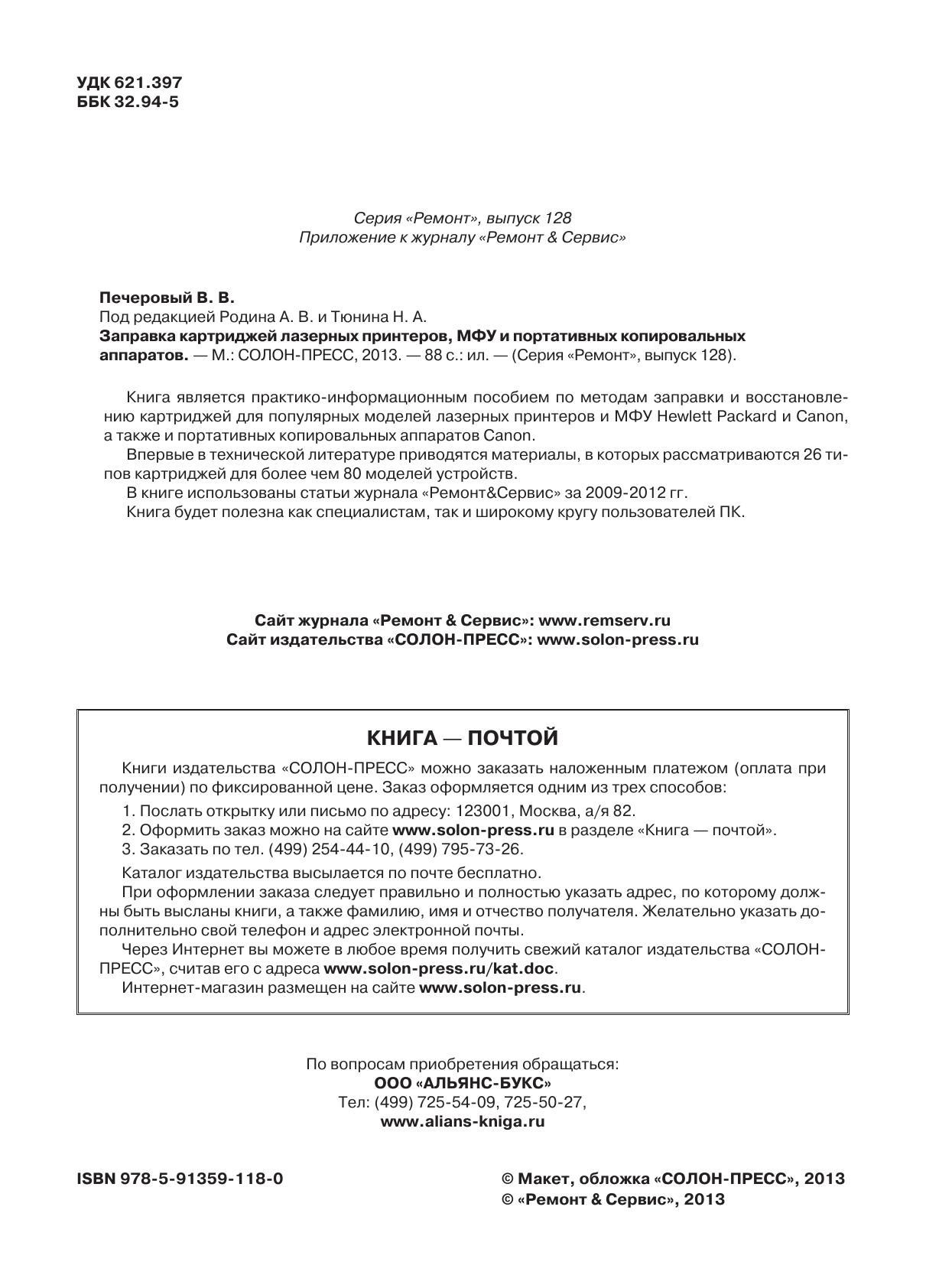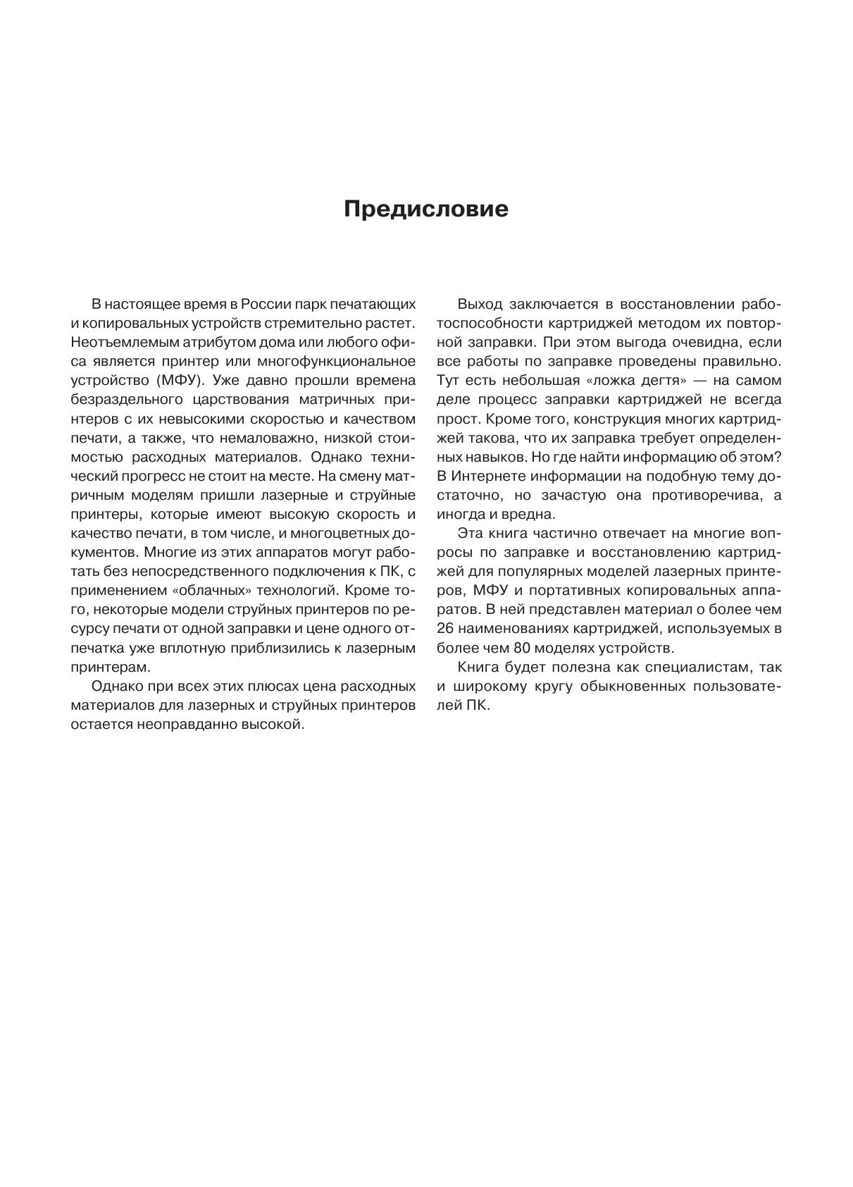 Книга является практико-информационным пособием по методам заправки и восстановлению картриджей для популярных моделей лазерных принтеров и МФУ Hewlett Packard и Canon, а также и портативных копировальных аппаратов Canon. Впервые в технической литературе приводятся материалы, в которых рассматриваются 26 типов картриджей для более чем 80 моделей устройств. В книге использованы статьи журнала «Ремонт&Сервис» за 2009-2012 гг. Книга будет полезна как специалистам, так и широкому кругу пользователей ПК.