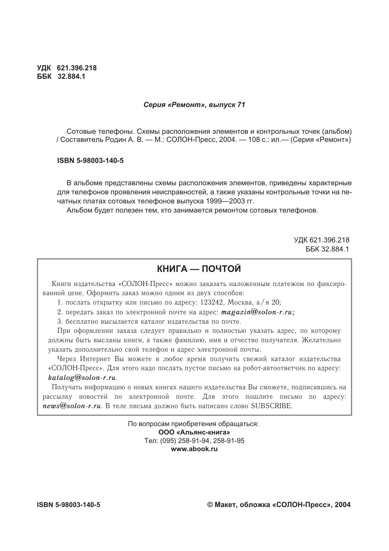 В альбоме представлены схемы расположения элементов, приведены характерные для телефонов проявления неисправностей, а также указаны контрольные точки на печатных платах сотовых телефонов выпуска 1999—2003 гг. Альбом будет полезен тем, кто занимается ремонтом сотовых телефонов.