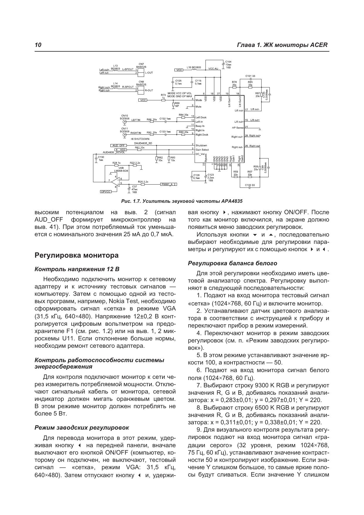 В очередной книге популярной серии описаны современные ЖК мониторы различных производителей, представленных на отечественном рынке: ACER, DAEWOO, LG ELECTRONICS, NEC, PHILIPS и SAMSUNG ELECTRONICS. Рассмотрены восемь шасси, на которых производятся ЖК мониторы с размерами жидкокристаллической панели 15, 17 и 18 дюймов. По каждой модели приводятся ее конструкция, структурная и принципиальная электрическая схемы, подробное описание работы всех ее составных частей и порядок регулировки узлов. Практическая ценность книги состоит в подробном описании типовых неисправностей, методике их поиска и устранения. Книга предназначена для специалистов, занимающихся ремонтом оргтехники и широкого круга радиолюбителей.