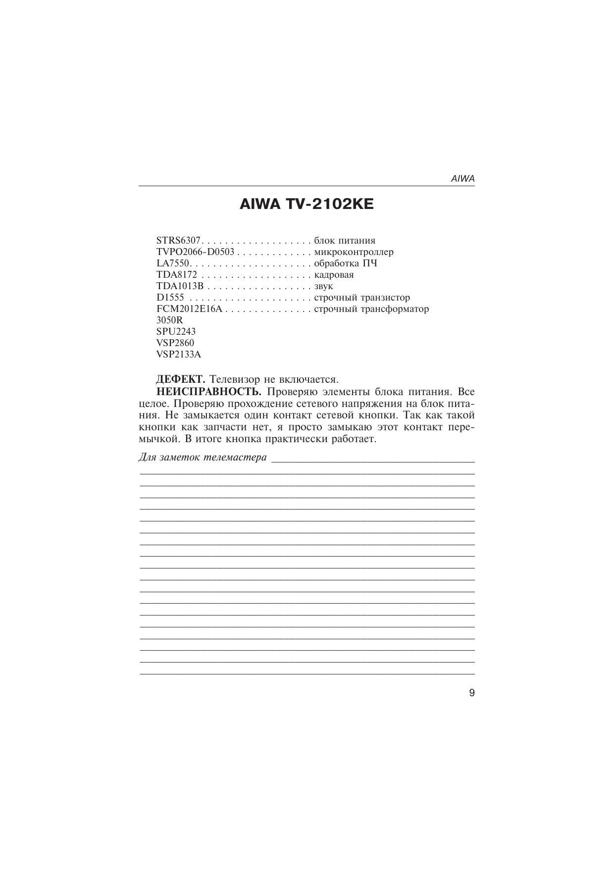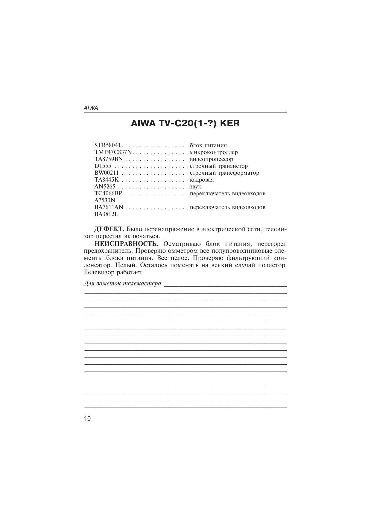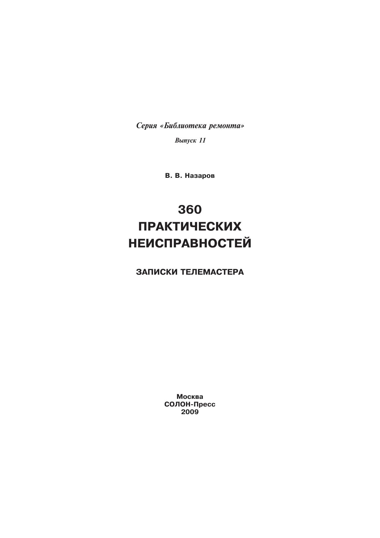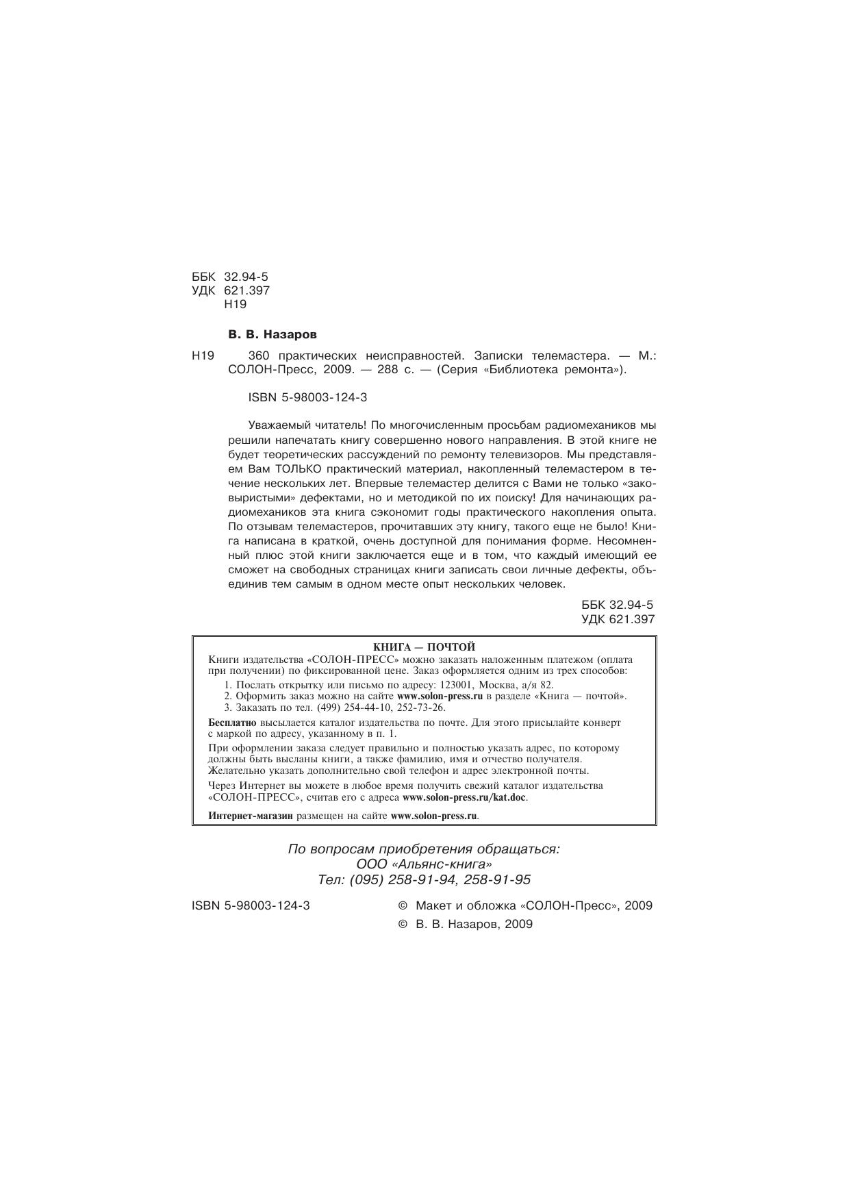 По многочисленным просьбам радиомехаников мы решили напечатать книгу совершенно нового направления. В этой книге не будет теоретических рассуждений по ремонту телевизоров. Мы представляем Вам ТОЛЬКО практический материал, накопленный телемастером в течение нескольких лет. Впервые телемастер делится с Вами не только «заковыристыми» дефектами, но и методикой по их поиску! Для начинающих радиомехаников эта книга сэкономит годы практического накопления опыта. По отзывам телемастеров, прочитавших эту книгу, такого еще не было! Книга написана в краткой, очень доступной для понимания форме. Несомненный плюс этой книги заключается еще и в том, что каждый имеющий ее сможет на свободных страницах книги записать свои личные дефекты, объединив тем самым в одном месте опыт нескольких человек.