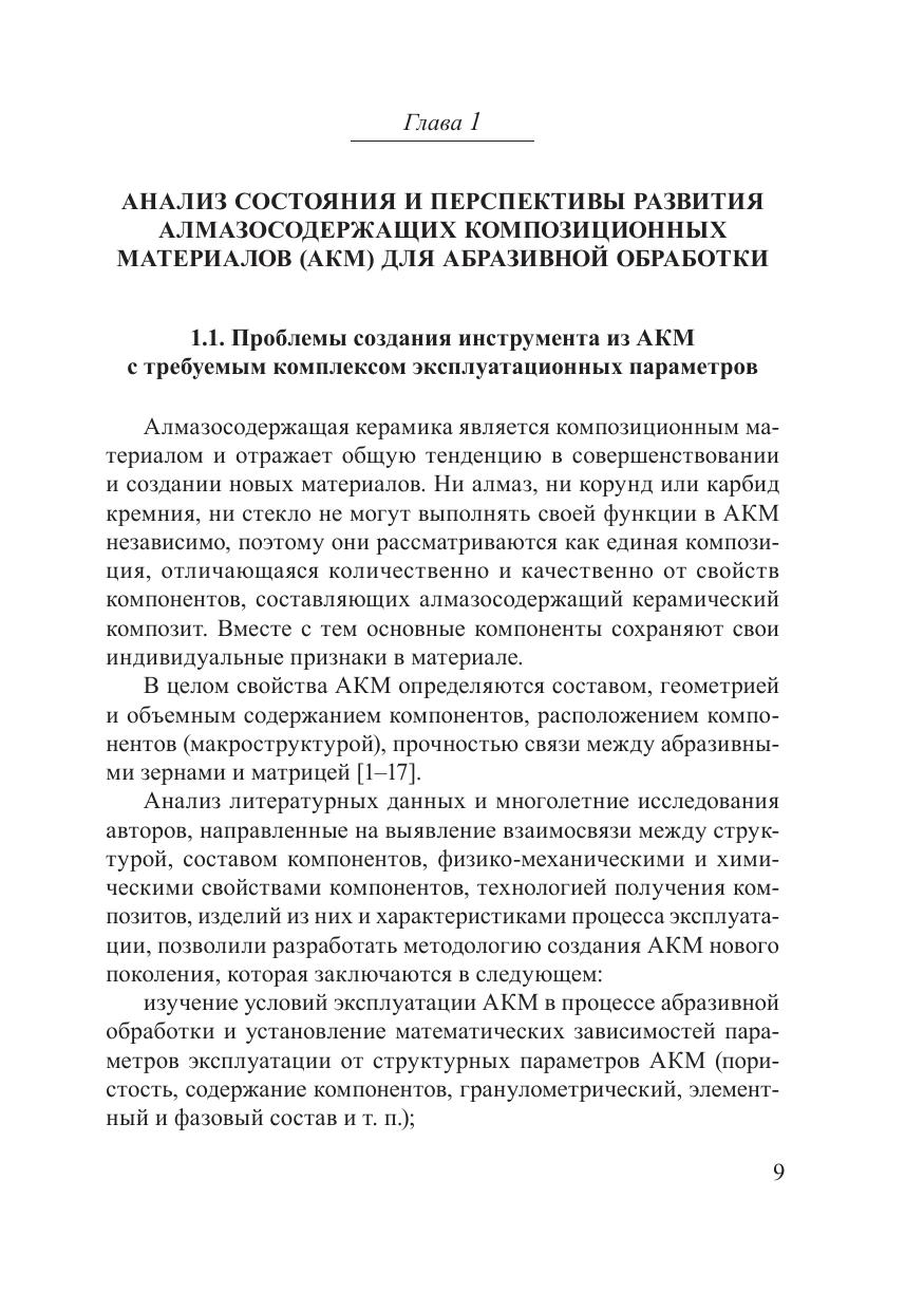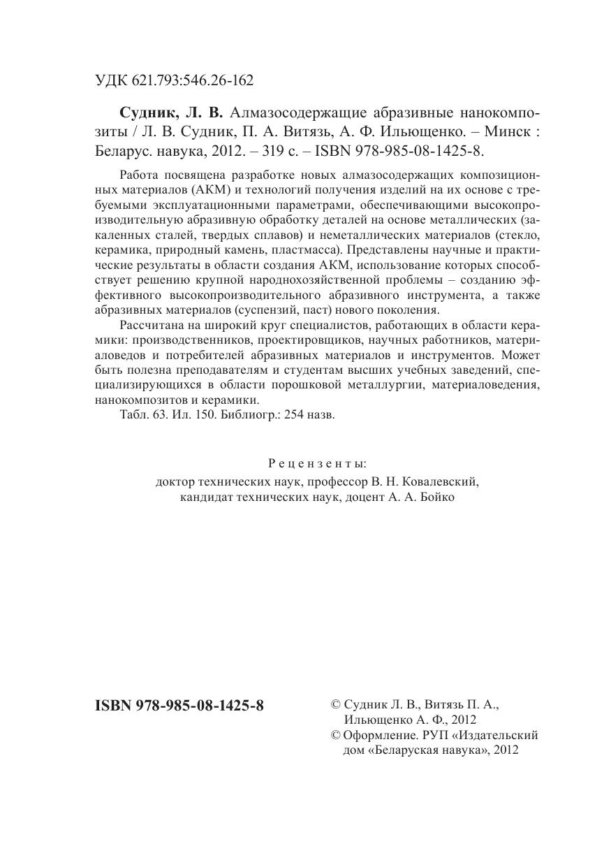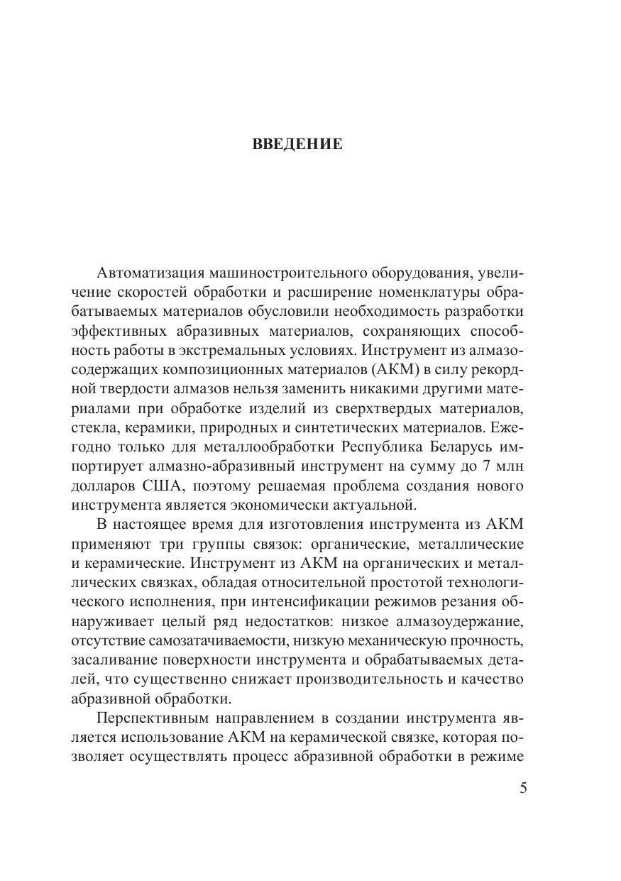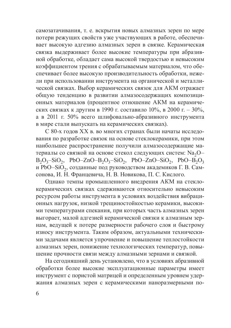 Работа посвящена разработке новых алмазосодержащих композиционных материалов (АКМ) и технологий получения изделий на их основе с требуемыми эксплуатационными параметрами, обеспечивающими высокопроизводительную абразивную обработку деталей на основе металлических (закаленных сталей, твердых сплавов) и неметаллических материалов (стекло, керамика, природный камень, пластмасса). Представлены научные и практические результаты в области создания АКМ, использование которых способствует решению крупной народнохозяйственной проблемы – созданию эффективного высокопроизводительного абразивного инструмента, а также абразивных материалов (суспензий, паст) нового поколения. Рассчитана на широкий круг специалистов, работающих в области керамики: производственников, проектировщиков, научных работников, материаловедов и потребителей абразивных материалов и инструментов. Может быть полезна преподавателям и студентам высших учебных заведений, специализирующихся в области порошковой металлургии, материаловедения, нанокомпозитов и керамики.