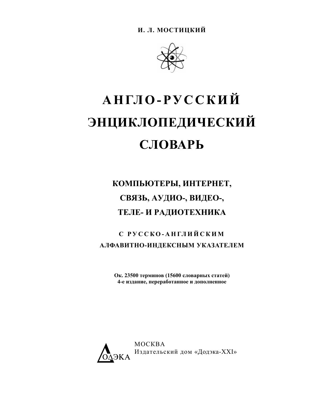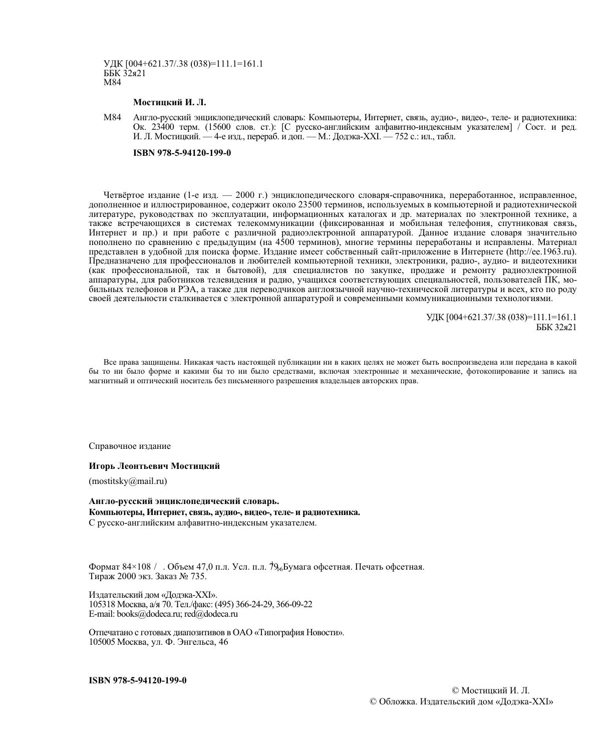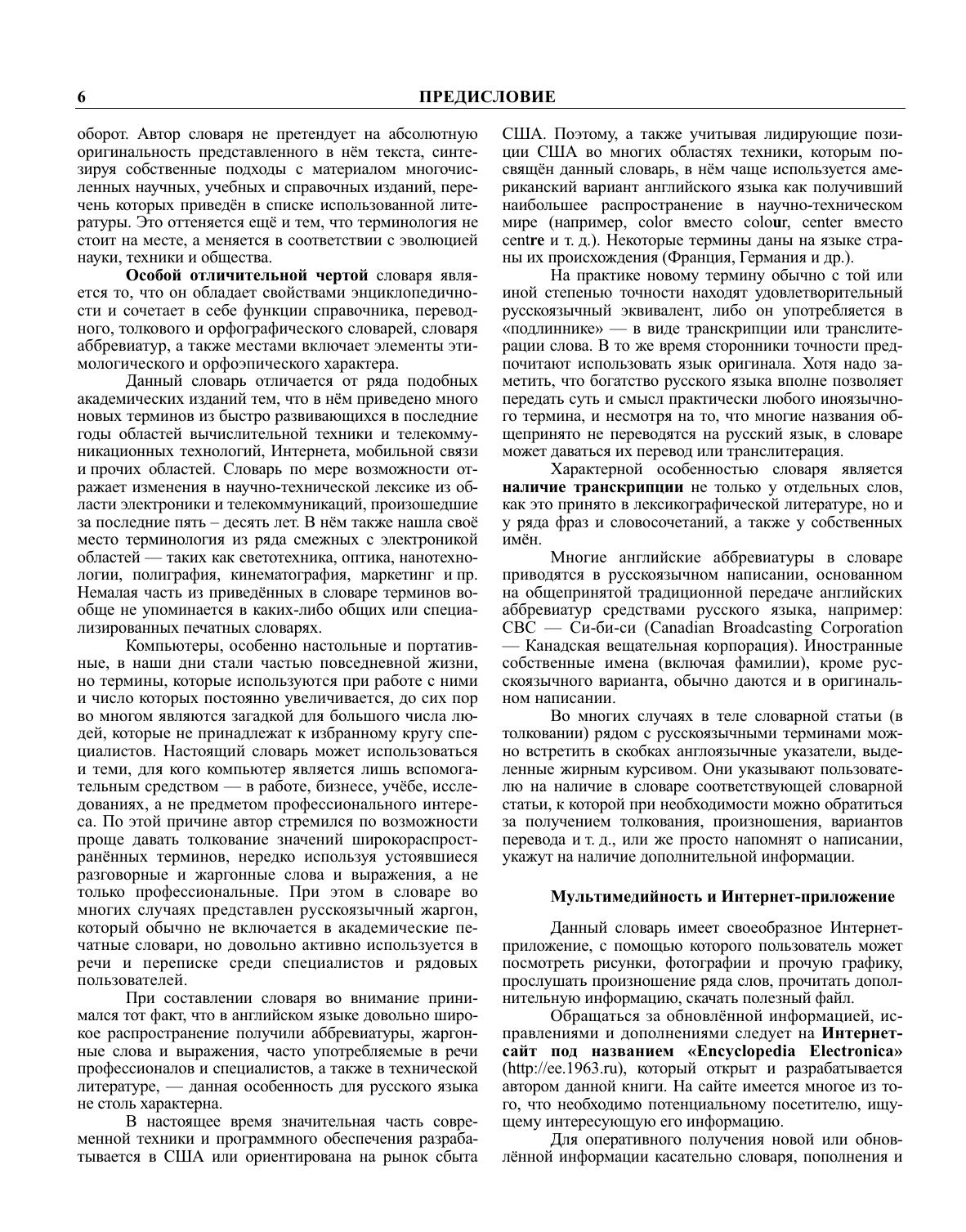 Четвертое издание энциклопедического словаря-справочника, переработанное, исправленное, дополненное и иллюстрированное, содержит около 23 500 терминов, используемых в компьютерной и радиотехнической литературе, руководствах по эксплуатации, информационных каталогах и других материалах по электронной технике, а также встречающихся в системах телекоммуникации и при работе с различной радиоэлектронной аппаратурой. Данное издание словаря значительно пополнено по сравнению с предыдущим (на 4 500 терминов), многие термины переработаны и исправлены. Издание имеет свой собственный сайт в интернете www.ee.1963.ru. Предназначено для профессионалов и любителей компьютерной техники, электроники, радио- и видеотехники (как профессиональной, так и бытовой), для специалистов по закупке, продаже и ремонту радиоэлектронной аппаратуры, для работников телевидения и радио, учащихся соответствующих специальностей, а также для переводчиков англоязычной научно-технической аппаратуры и всех, кто по роду своей деятельности сталкивается с электронной аппаратурой и современными коммуникационными технологиями.