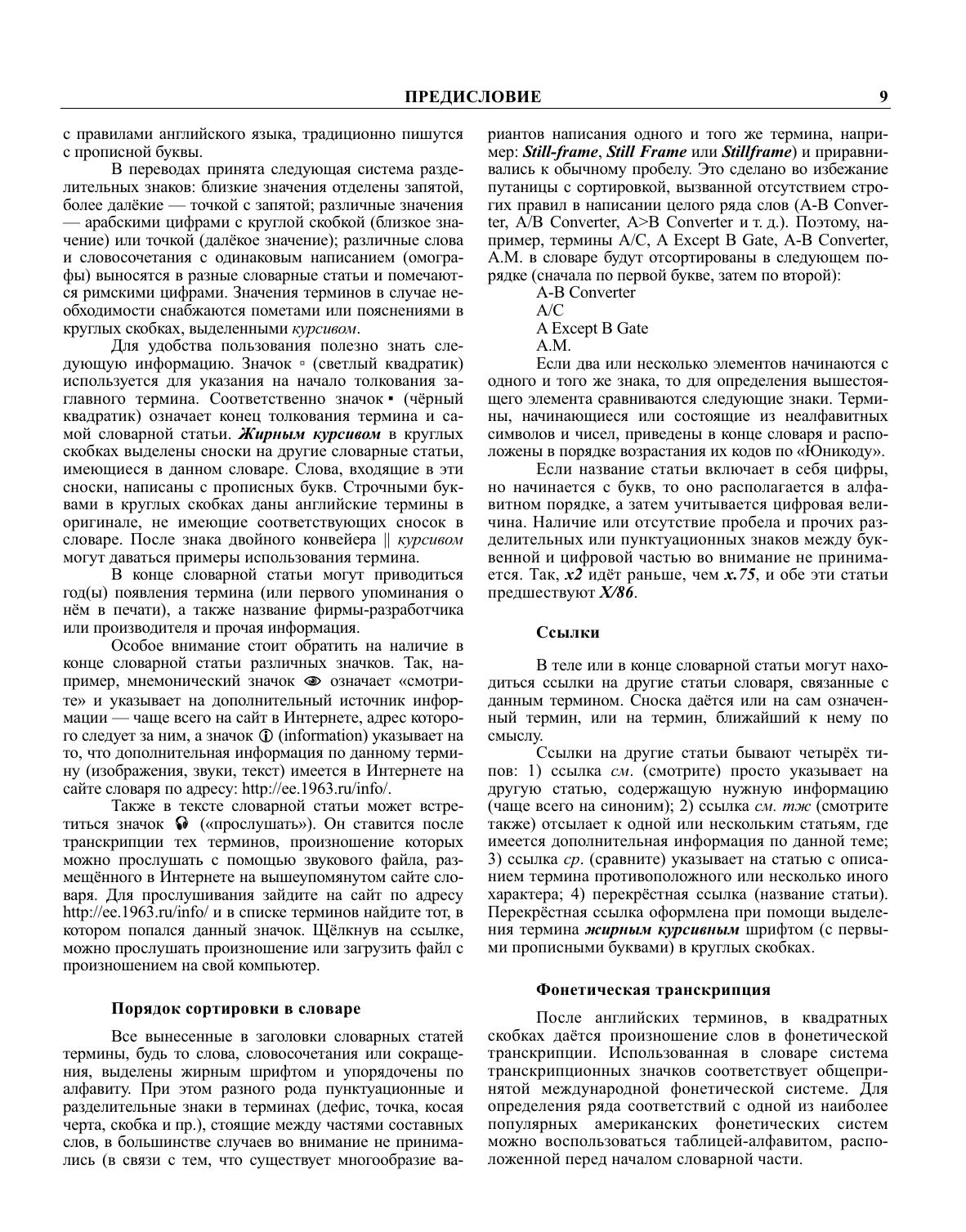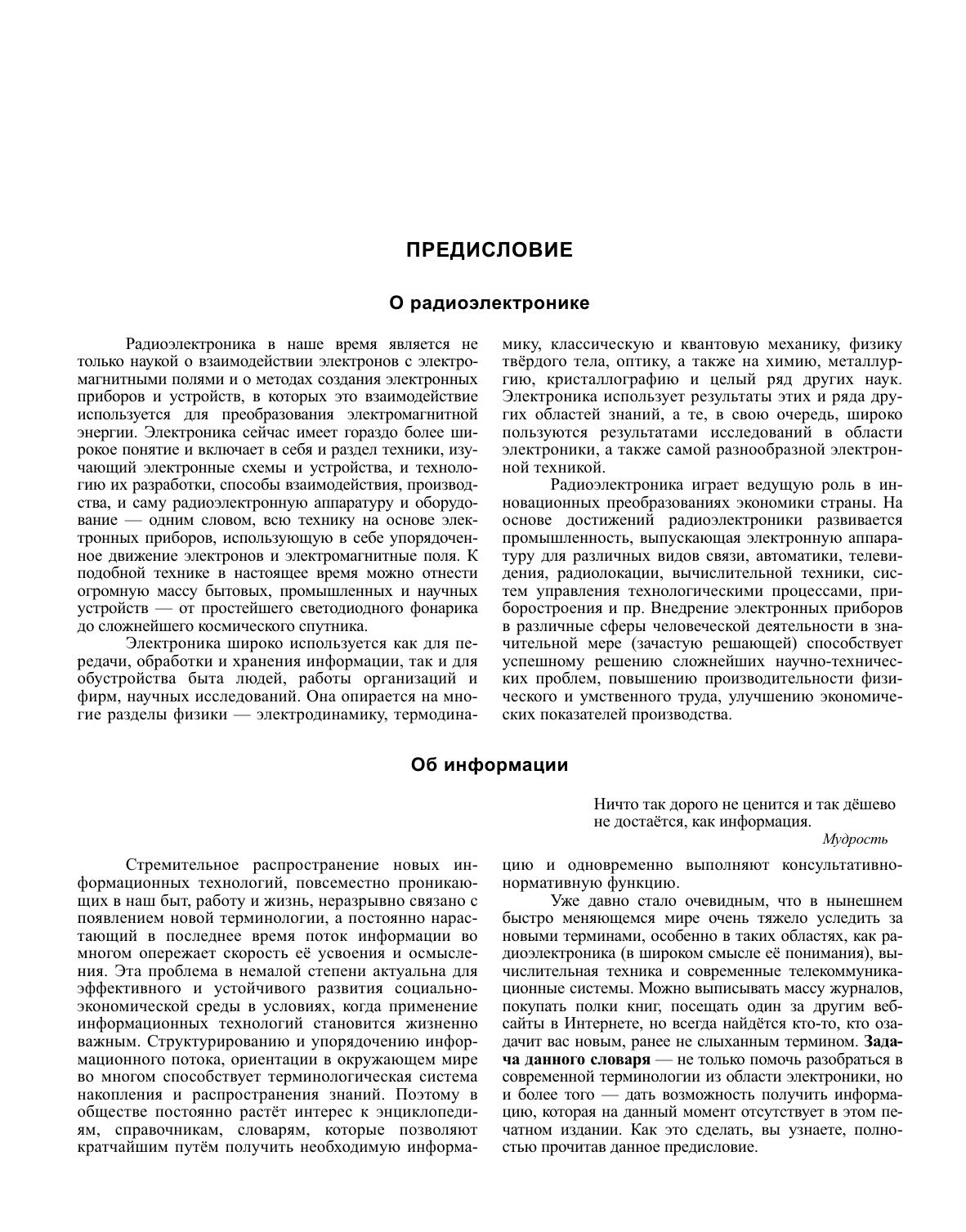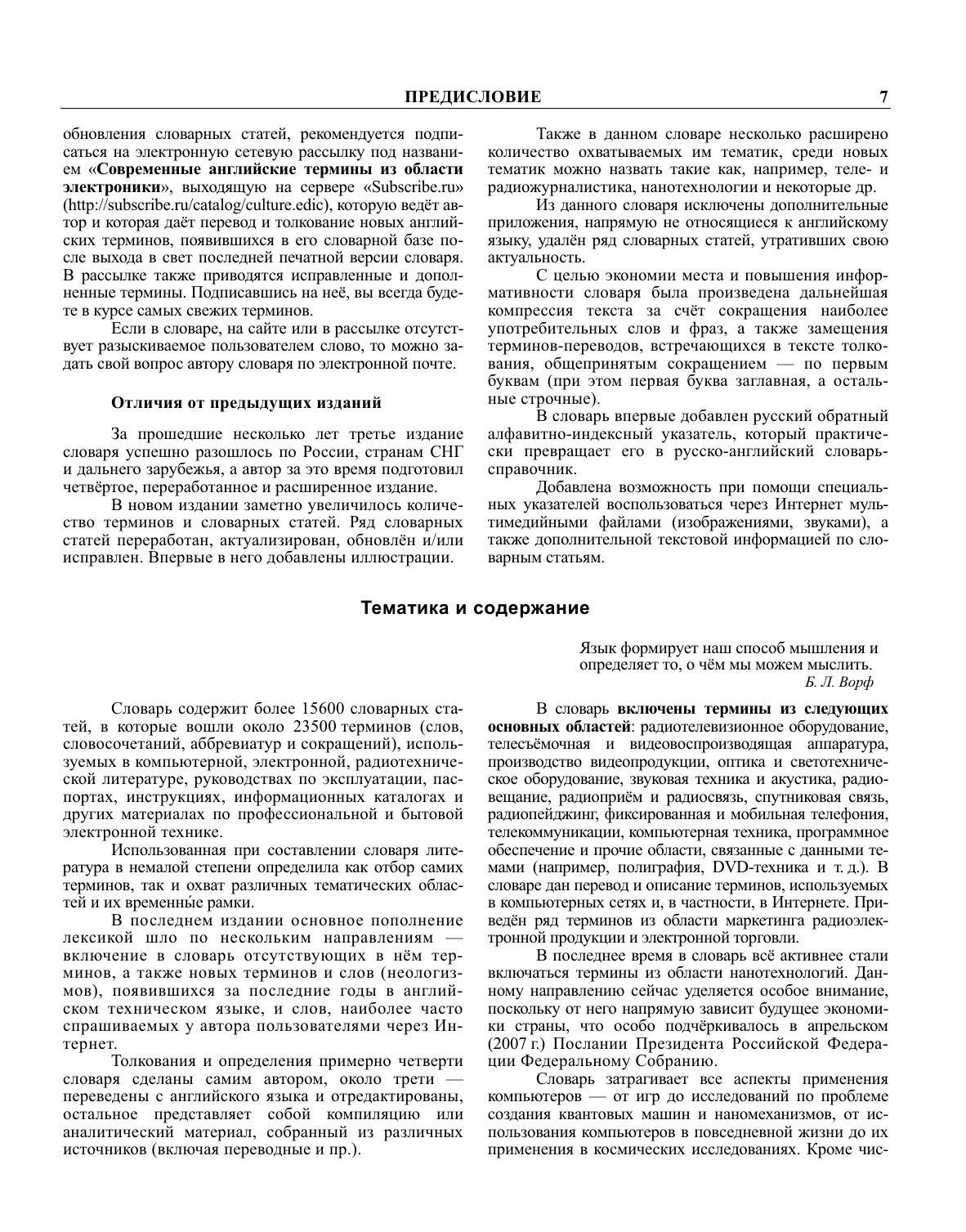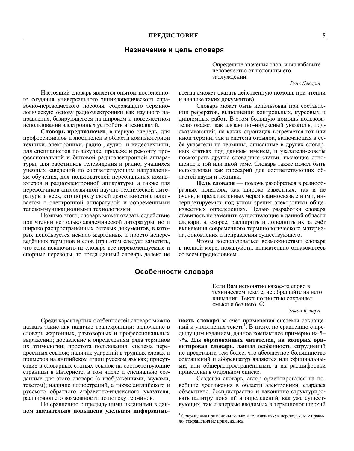 Четвертое издание энциклопедического словаря-справочника, переработанное, исправленное, дополненное и иллюстрированное, содержит около 23 500 терминов, используемых в компьютерной и радиотехнической литературе, руководствах по эксплуатации, информационных каталогах и других материалах по электронной технике, а также встречающихся в системах телекоммуникации и при работе с различной радиоэлектронной аппаратурой. Данное издание словаря значительно пополнено по сравнению с предыдущим (на 4 500 терминов), многие термины переработаны и исправлены. Издание имеет свой собственный сайт в интернете www.ee.1963.ru. Предназначено для профессионалов и любителей компьютерной техники, электроники, радио- и видеотехники (как профессиональной, так и бытовой), для специалистов по закупке, продаже и ремонту радиоэлектронной аппаратуры, для работников телевидения и радио, учащихся соответствующих специальностей, а также для переводчиков англоязычной научно-технической аппаратуры и всех, кто по роду своей деятельности сталкивается с электронной аппаратурой и современными коммуникационными технологиями.