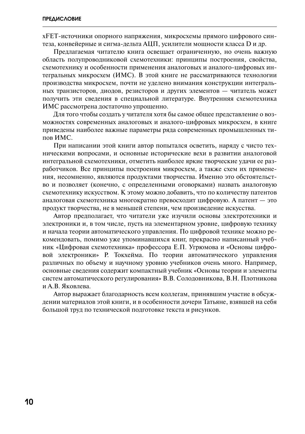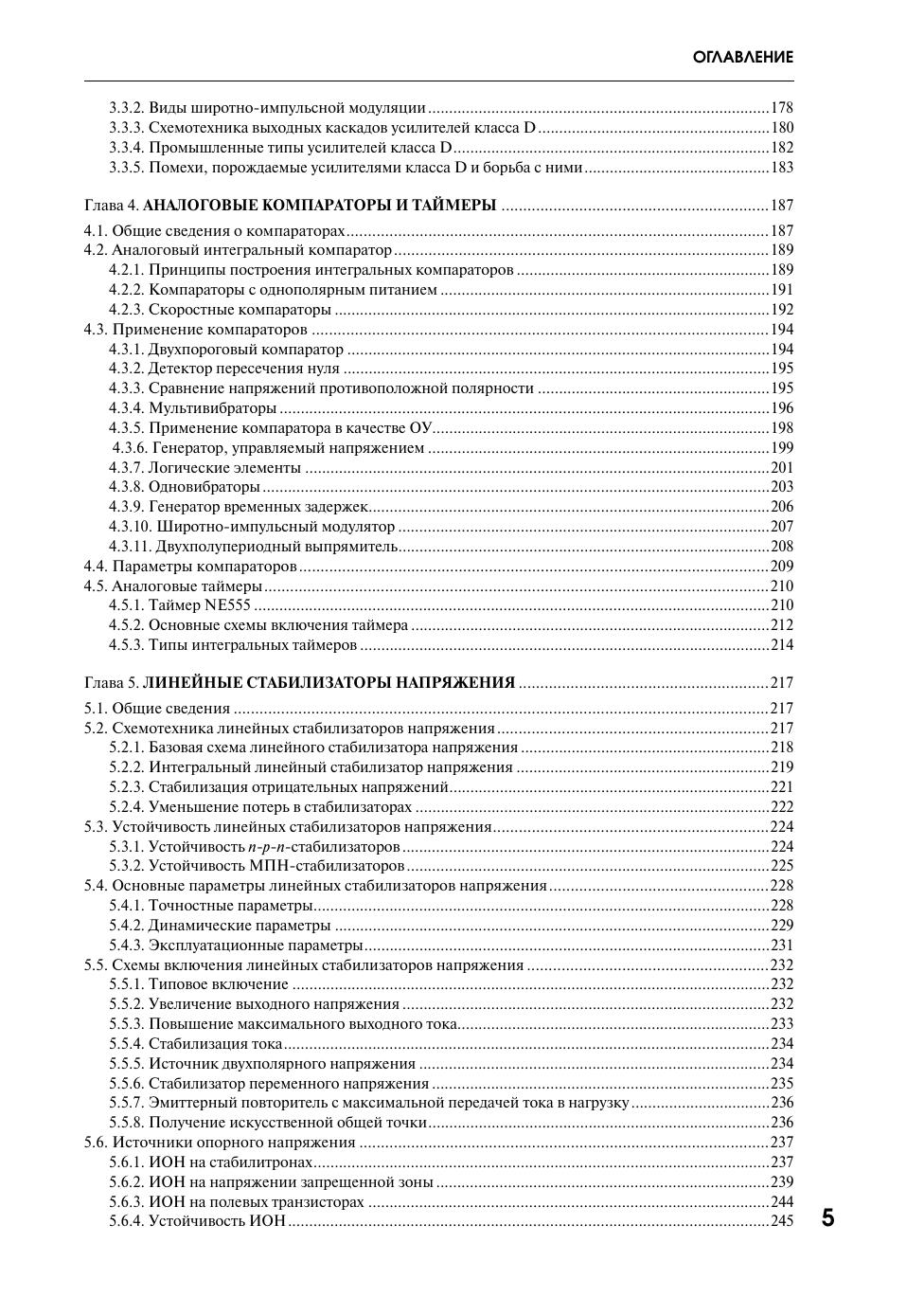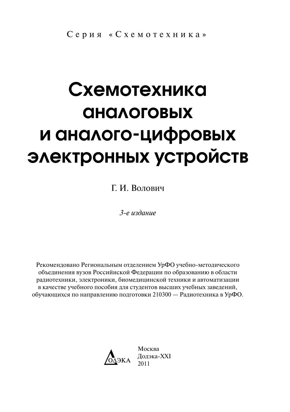 Освещены свойства и особенности применения аналоговых и аналого цифровых интегральных микросхем: операционных усилителей, компараторов, таймеров, фильтров, линейных и импульсных стабилизаторов напряжения, коммутаторов, микросхем АЦП и ЦАП, различных датчиков. В книге нашли отражение последние достижения в элементной базе, при этом основное внимание уделено схемотехнической реализации различных функций электронных устройств. Рассмотрены схемы линейного и нелинейного преобразования сигналов, измерительные и вычислительные схемы, активные электрические фильтры, генераторы и перемножители сигналов, специализированные усилители (широкополосные, изолирующие,измерительные и др.), источники опорного напряжения, различного типа цифроаналоговые и аналого цифровые преобразователи, схемы датчиков температуры, ускорения, давления, влажности, магнитного поля. Книга будет полезна студентам вузов, обучающимся по специальностям, связанным с электроникой, автоматикой, вычислительной техникой, а также аспирантам и специалистам соответствующего профиля.