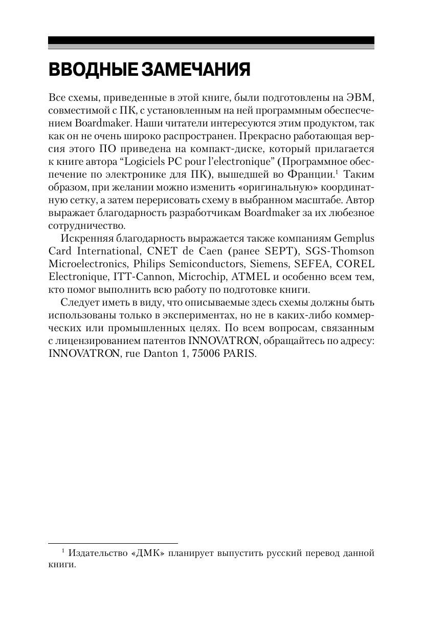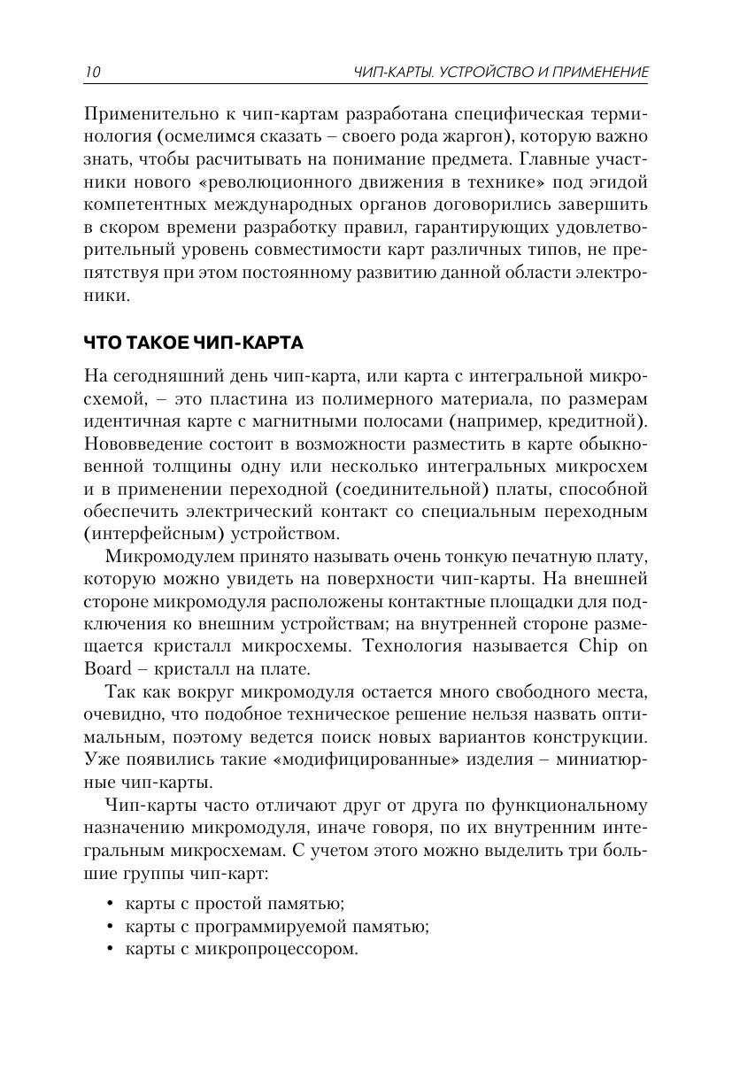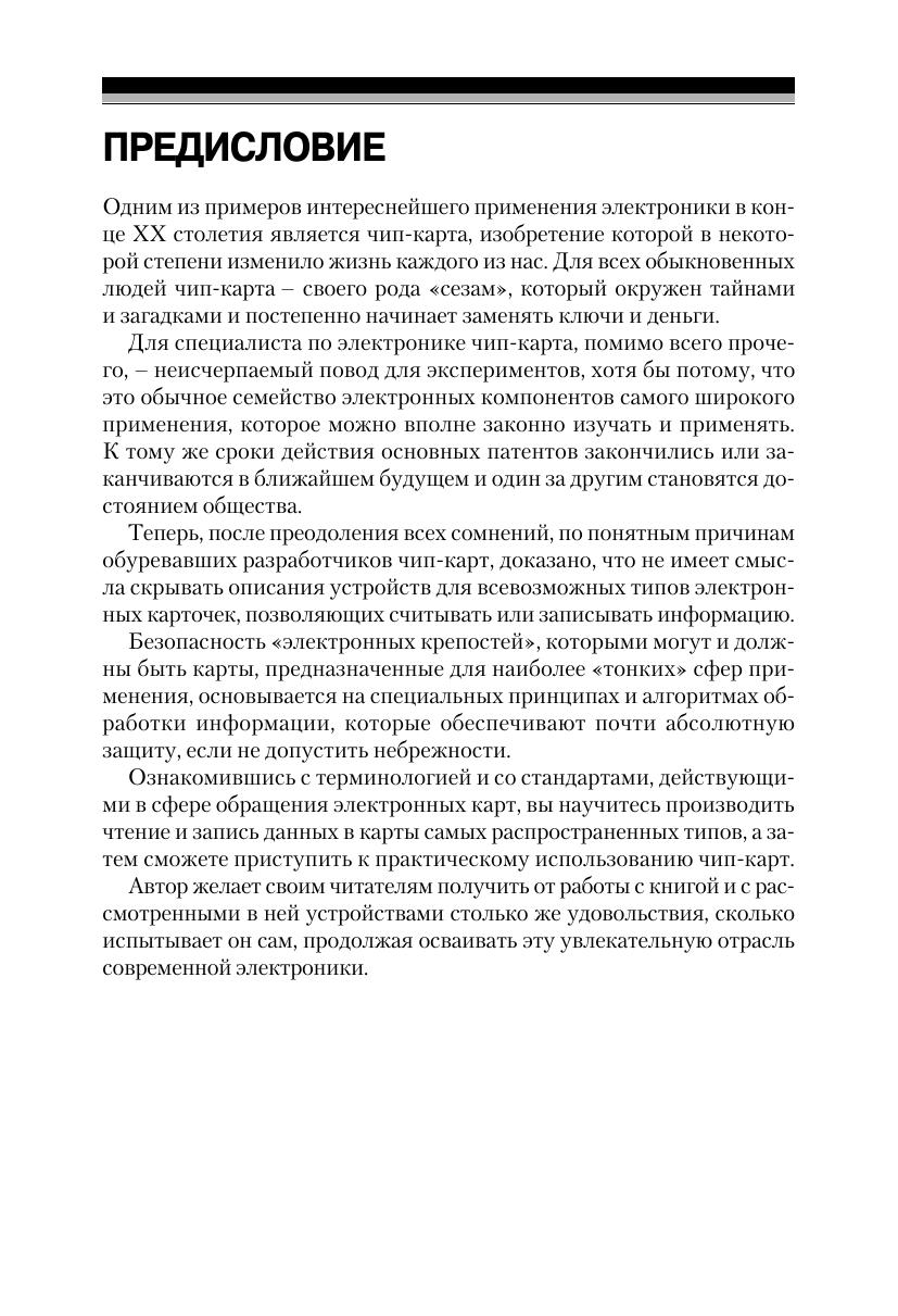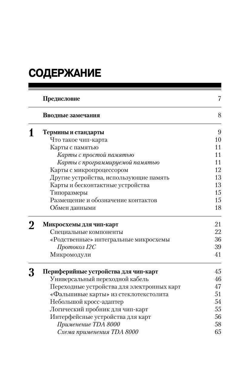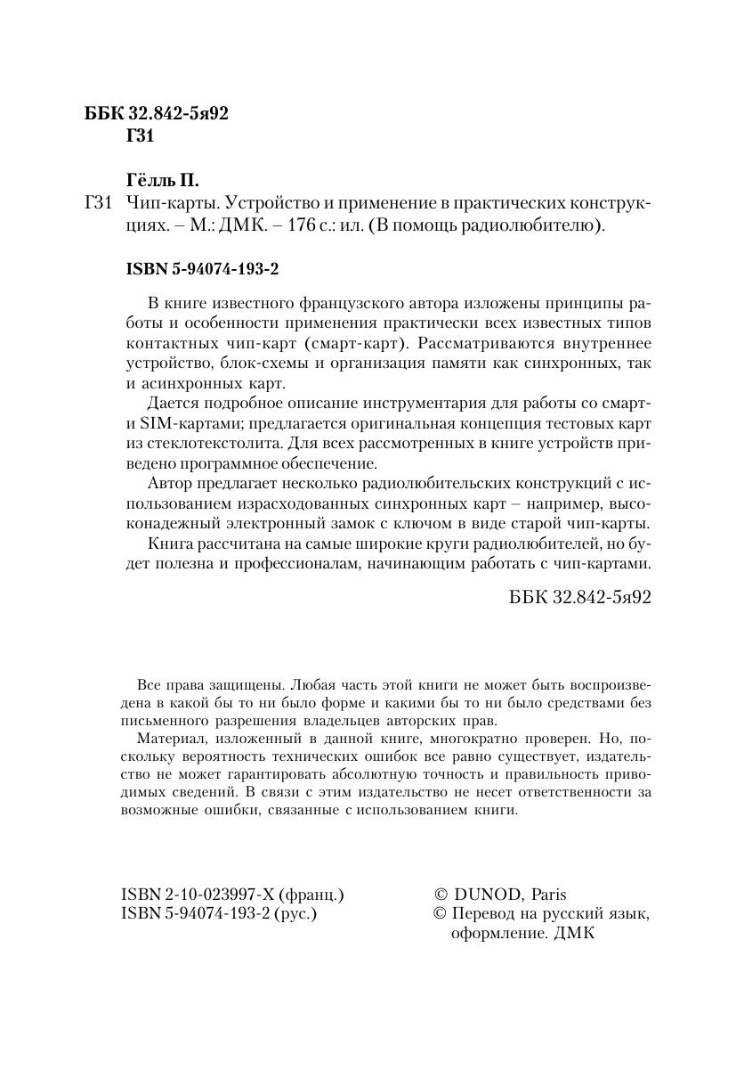 В книге известного французского автора изложены принципы работы и особенности применения практически всех известных типов контактных чип-карт (смарт-карт). Рассматриваются внутреннее устройство, блок-схемы и организация памяти как синхронных, так и асинхронных карт. Дается подробное описание инструментария для работы со смарт- и SIM-картами, предлагается оригинальная концепция тестовых карт из стеклотекстолита. Для всех рассмотренных в книге устройств приведено программное обеспечение. Автор предлагает несколько радиолюбительских конструкций с использованием израсходованных синхронных карт – например, высоконадежный электронный замок с ключом в виде старой чип-карты. Книга рассчитана на самые широкие круги радиолюбителей, но будет полезна и профессионалам, начинающим работать с чип картами.