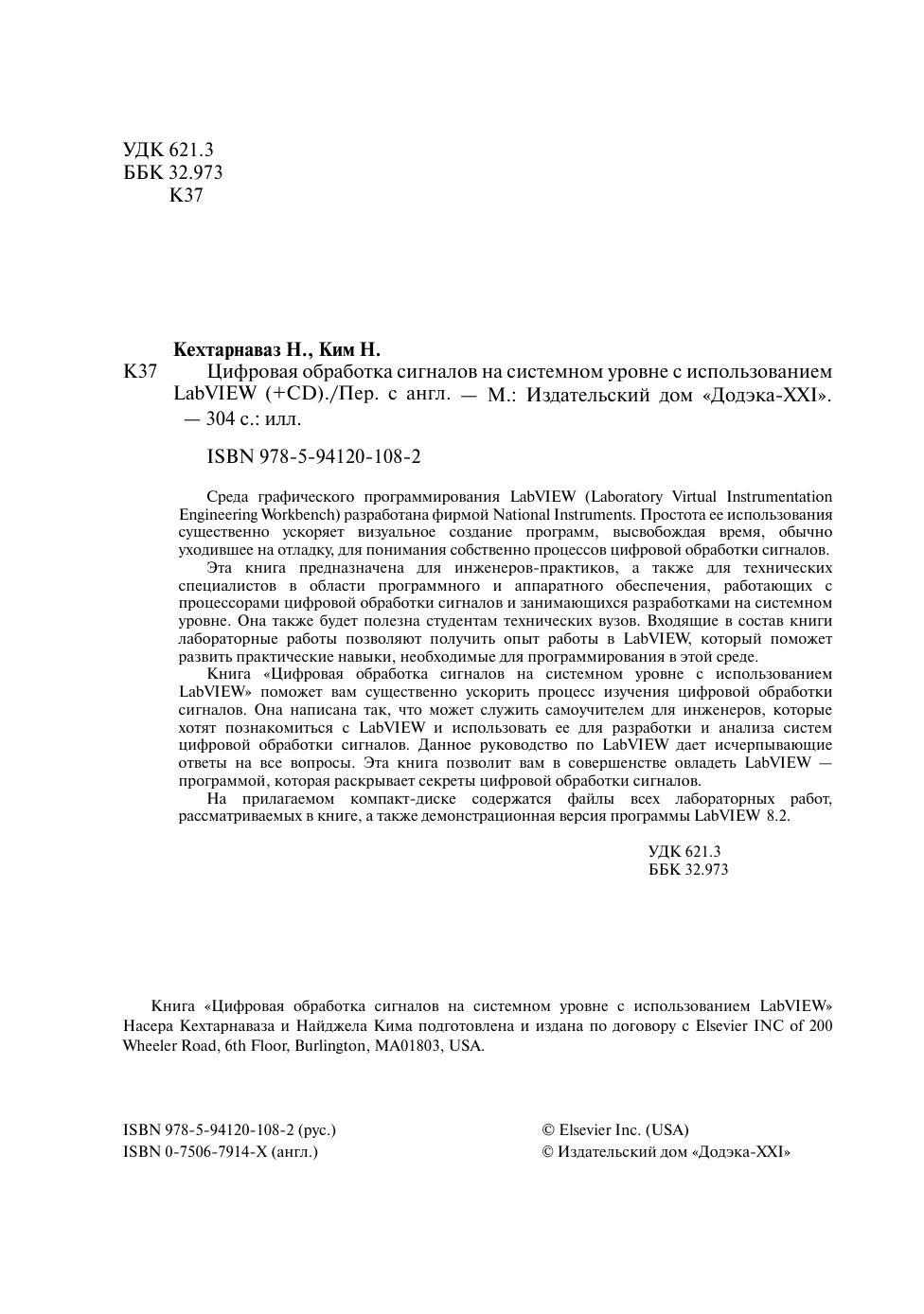 Среда графического программирования LabVIEW (Laboratory Virtual Instrumentation Engineering Workbench) разработана фирмой National Instruments. Простота ее использования существенно ускоряет визуальное создание программ, высвобождая время, обычно уходившее на отладку, для понимания собственно процессов цифровой обработки сигналов. Эта книга предназначена для инженеров-практиков, а также для технических специалистов в области программного и аппаратного обеспечения, работающих с процессорами цифровой обработки сигналов и занимающихся разработками на системном уровне. Она также будет полезна студентам технических вузов. Входящие в состав книгилабораторные работы позволяют получить опыт работы в LabVIEW, который поможет развить практические навыки, необходимые для программирования в этой среде. Книга «Цифровая обработка сигналов на системном уровне с использованием LabVIEW» поможет вам существенно ускорить процесс изучения цифровой обработки сигналов. Она написана так, что может служить самоучителем для инженеров, которые хотят познакомиться с LabVIEW и использовать ее для разработки и анализа систем цифровой обработки сигналов. Данное руководство по LabVIEW дает исчерпывающие ответы на все вопросы. Эта книга позволит вам в совершенстве овладеть LabVIEW — программой, которая раскрывает секреты цифровой обработки сигналов.