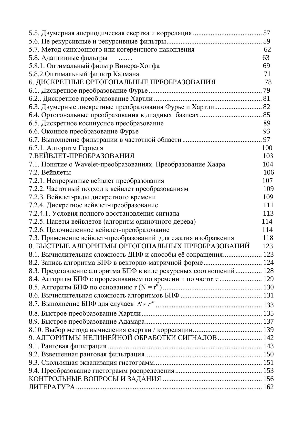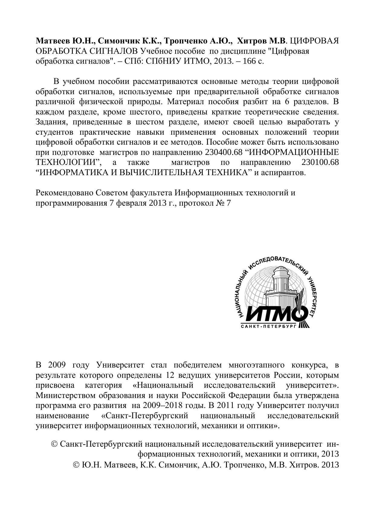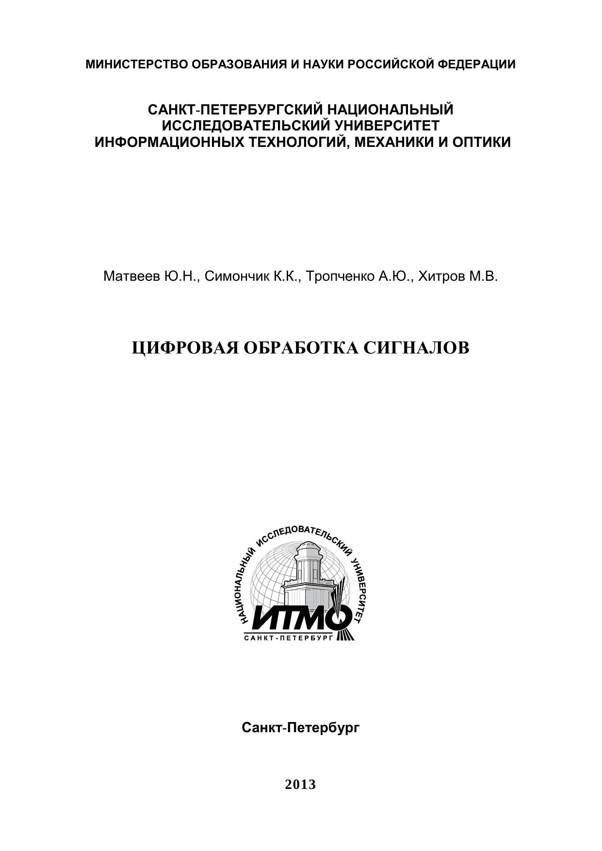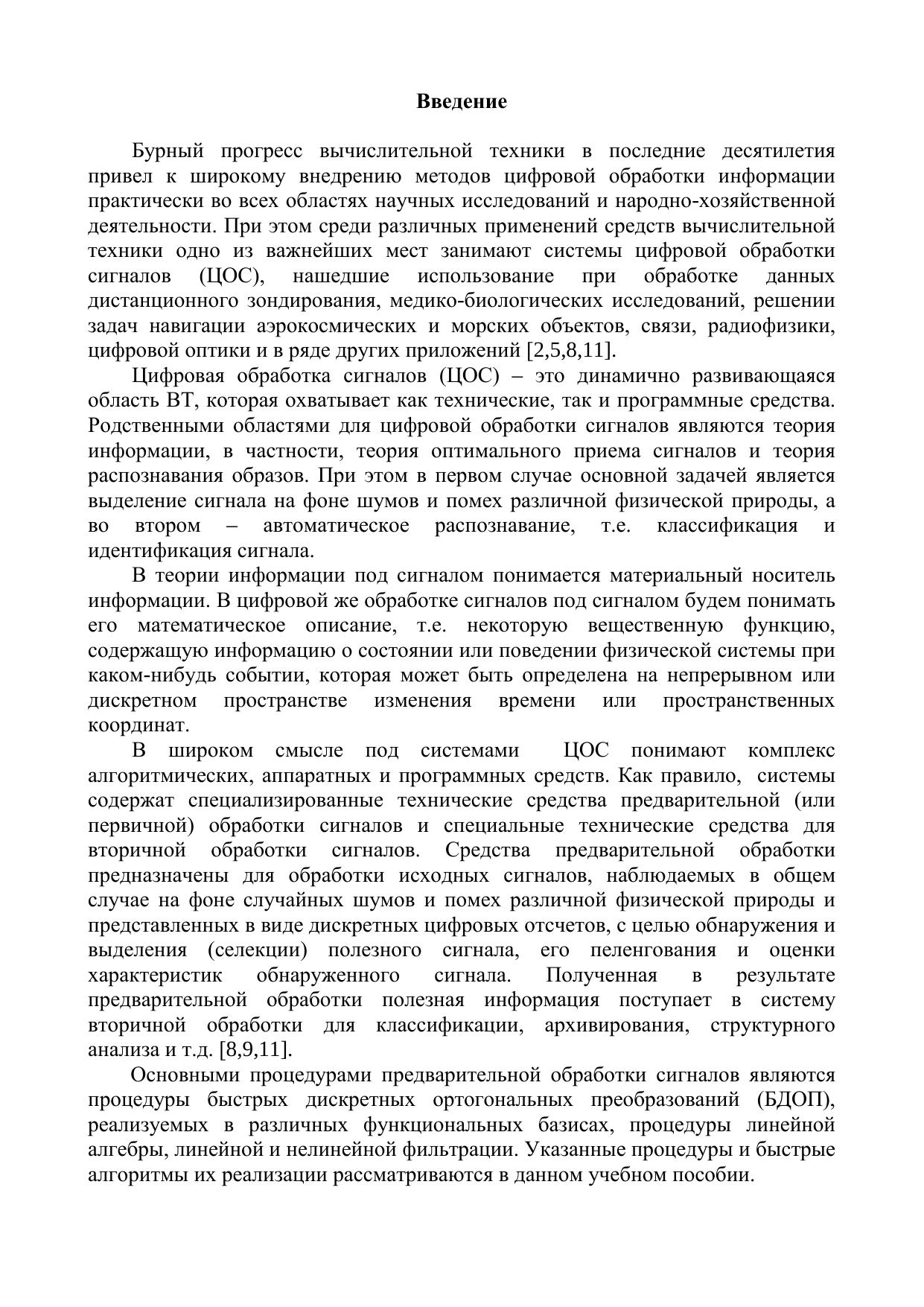 В учебном пособии рассматриваются основные методы теории цифровой обработки сигналов, используемые при предварительной обработке сигналов различной физической природы. Материал пособия разбит на 6 разделов. В каждом разделе, кроме шестого, приведены краткие теоретические сведения. Задания, приведенные в шестом разделе, имеют своей целью выработать у студентов практические навыки применения основных положений теории цифровой обработки сигналов и ее методов.