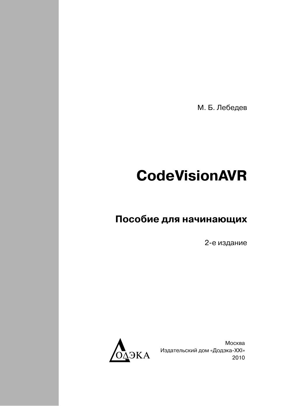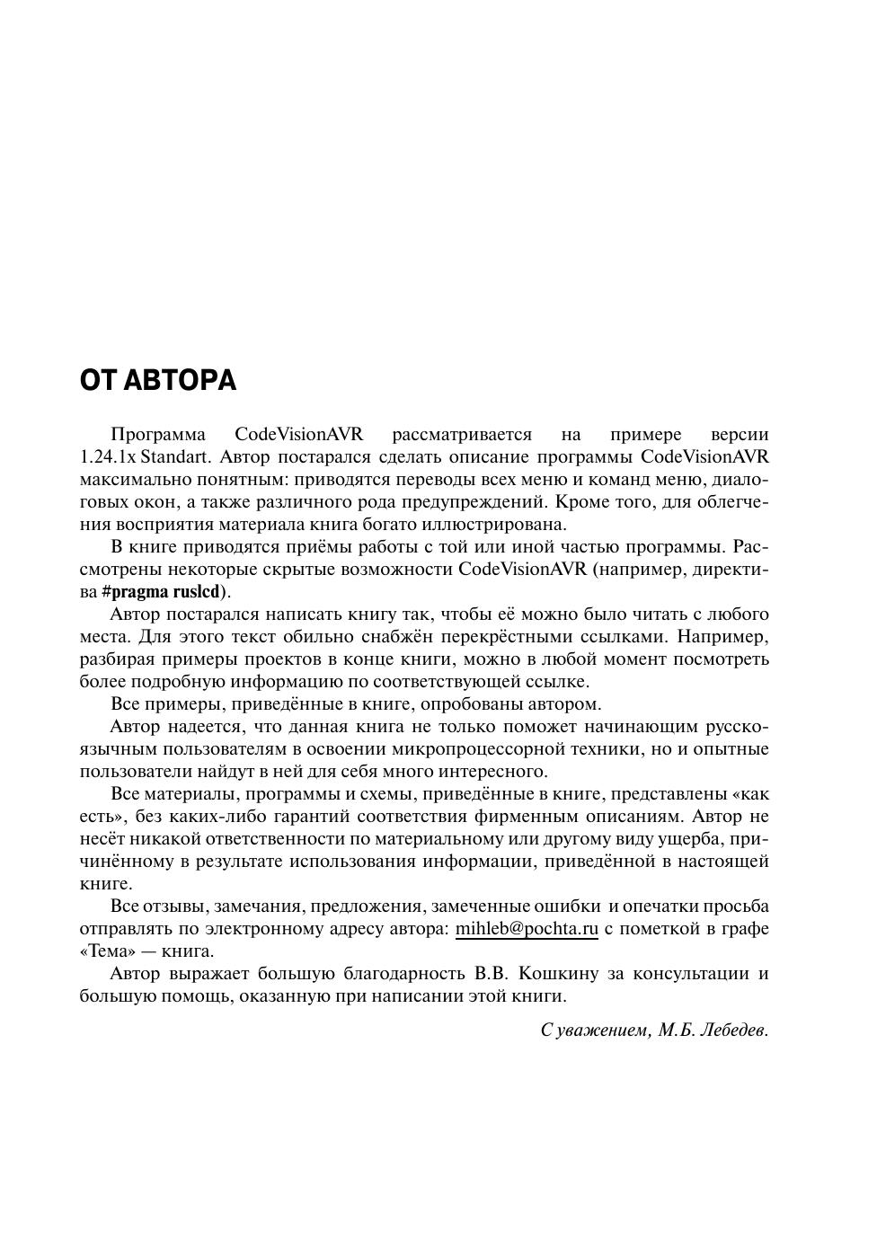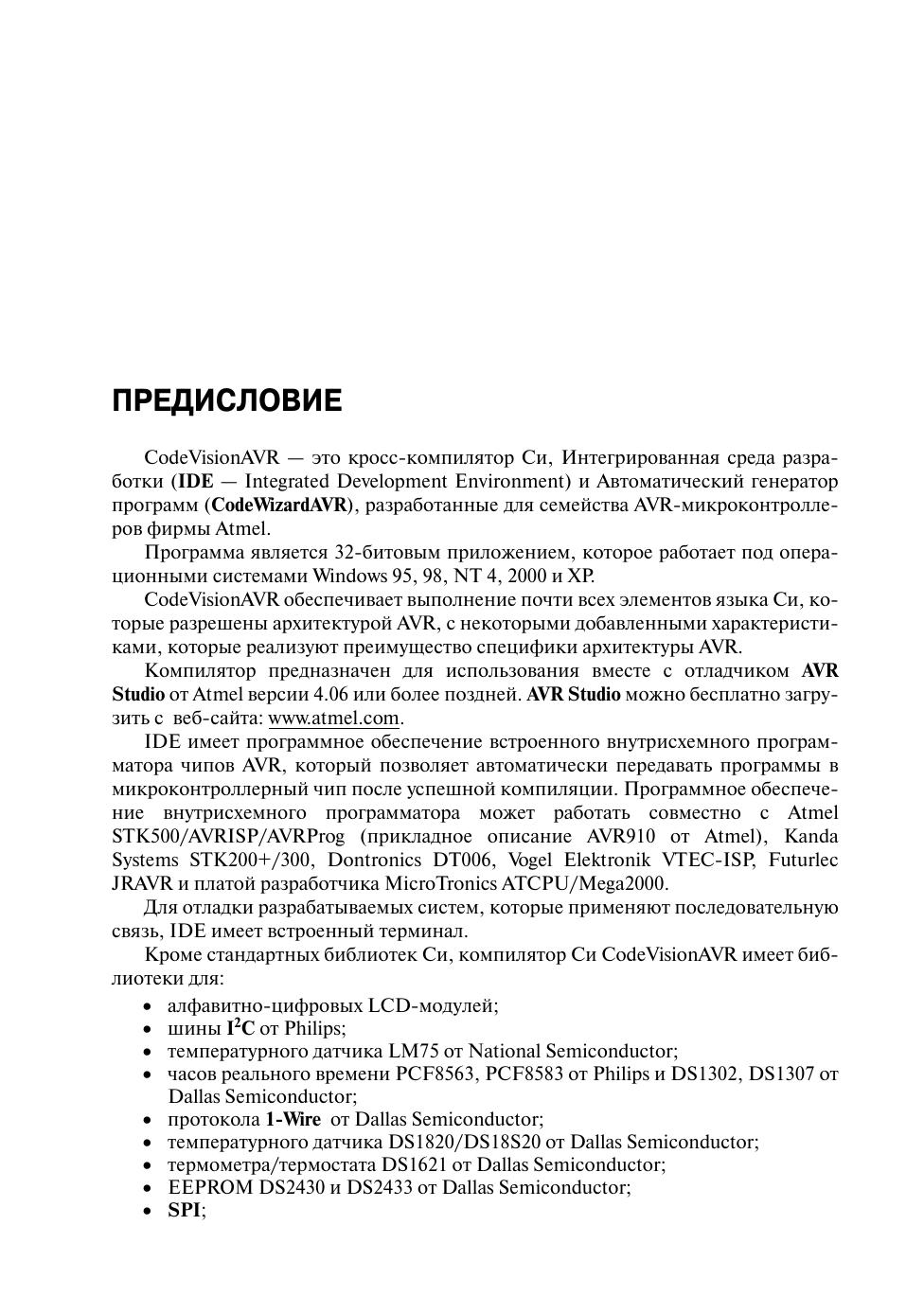 В книге изложены основные приёмы работы в интегрированной среде разработки CodeVisionAVR, предназначенной для разработки программного обеспечения и программирования микроконтроллеров AVR на языке Си. Автор постарался сделать описание программы CodeVisionAVR максимально понятным: приводятся переводы всех меню и команд меню, диалоговых окон, а также различного рода предупреждений. Кроме того, для облегчения восприятия материала книга богато иллюстрирована и снабжена перекрёстными ссылками. Книга рассчитана на читателей, изучающих основы микроконтроллерной техники, и может быть полезна студентам вузов соответствующих специальностей.