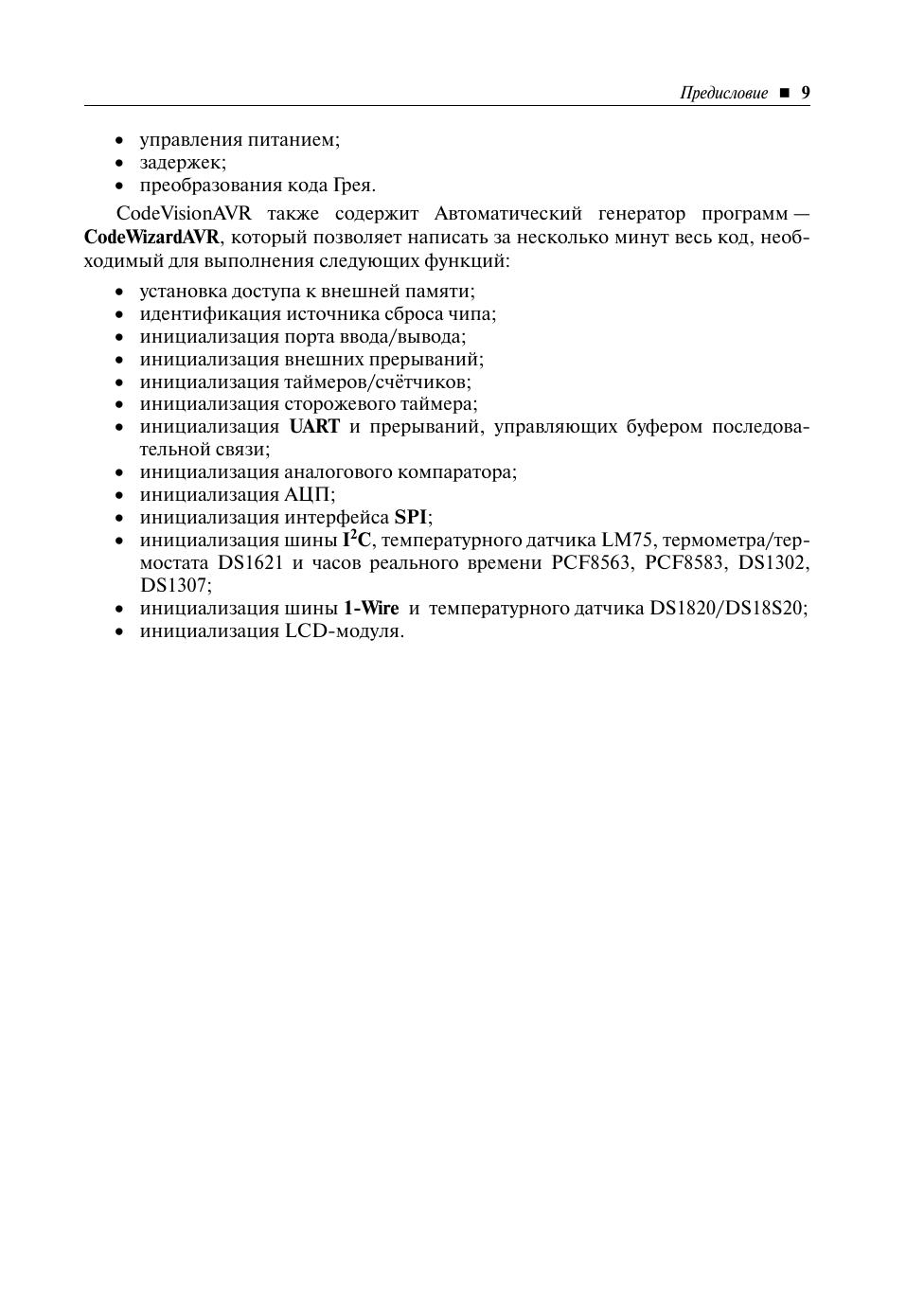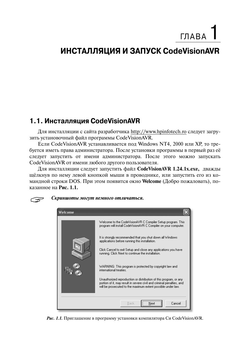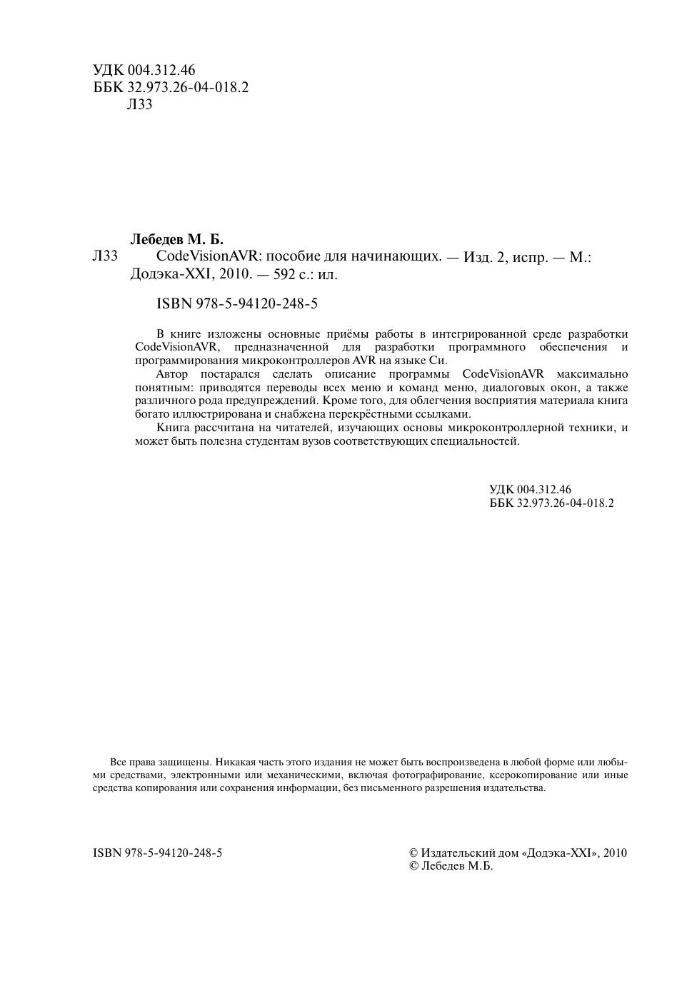 В книге изложены основные приёмы работы в интегрированной среде разработки CodeVisionAVR, предназначенной для разработки программного обеспечения и программирования микроконтроллеров AVR на языке Си. Автор постарался сделать описание программы CodeVisionAVR максимально понятным: приводятся переводы всех меню и команд меню, диалоговых окон, а также различного рода предупреждений. Кроме того, для облегчения восприятия материала книга богато иллюстрирована и снабжена перекрёстными ссылками. Книга рассчитана на читателей, изучающих основы микроконтроллерной техники, и может быть полезна студентам вузов соответствующих специальностей.
