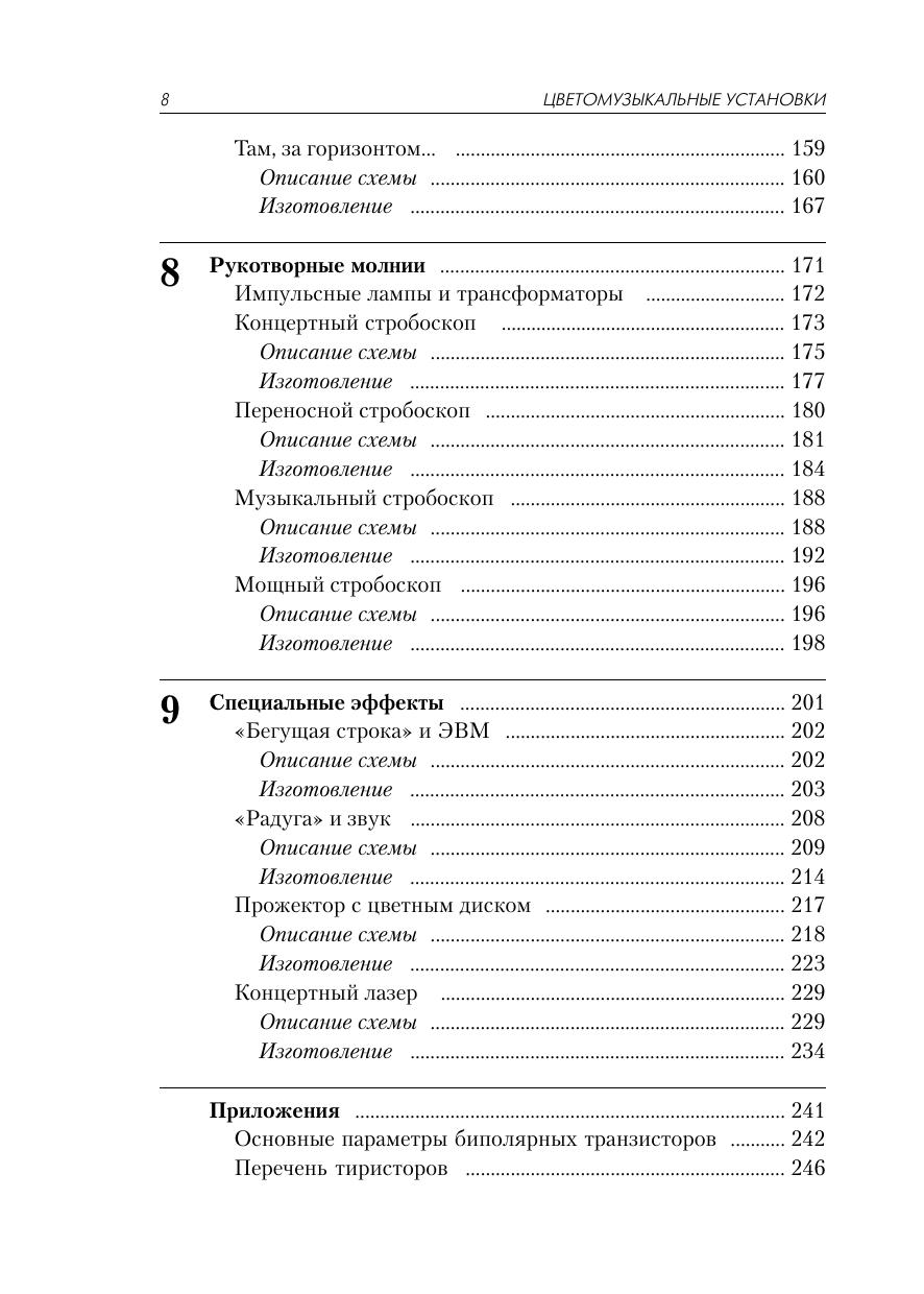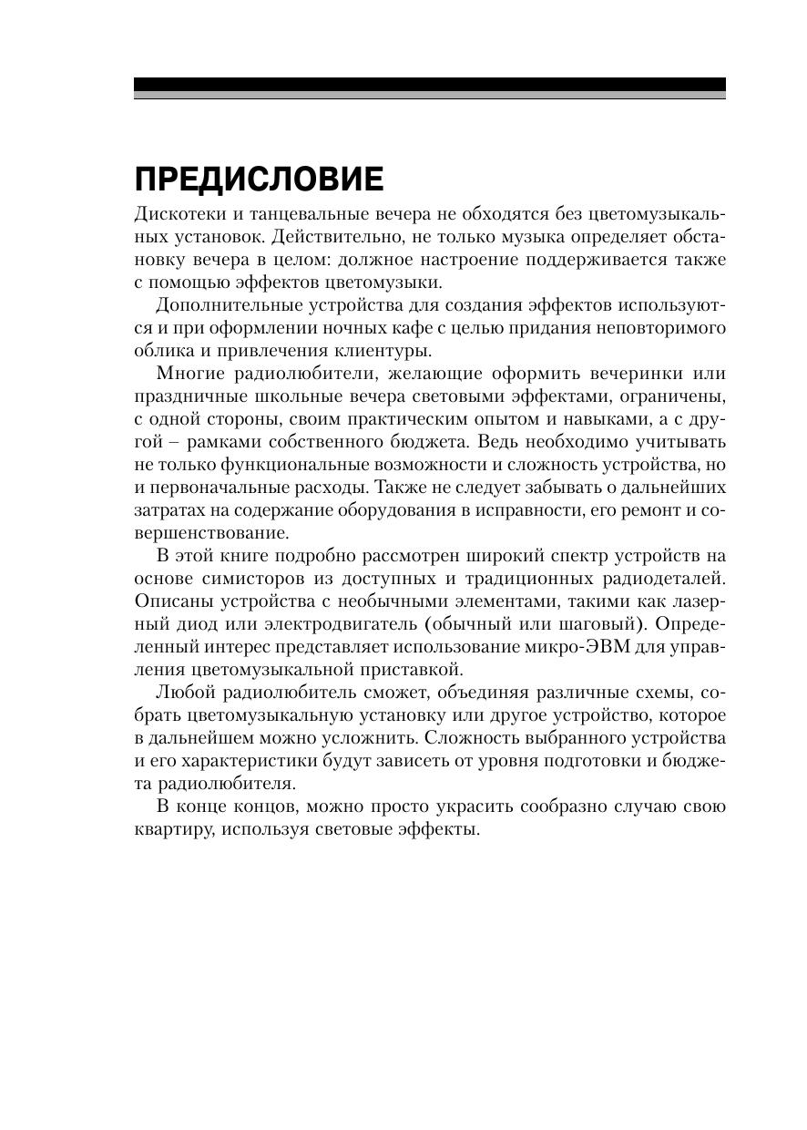 В книге известного французского автора изложены принципы работы и особенности практического применения тиристоров и симисторов. Подробно описываются оптосимисторы, анализируются различные способы их защиты от помех. Автор предлагает около 25 радиолюбительских конструкций различного назначения и уровня сложности. Описание электрических схем, рекомендации по изготовлению и настройке параметров, чертежи печатных плат – эта подробная информация поможет радиолюбителям в изготовлении цветомузыкальных устройств. Книга рассчитана на самые широкие круги радиолюбителей, но будет полезна и профессионалам как пособие по тиристорам и симисторам.