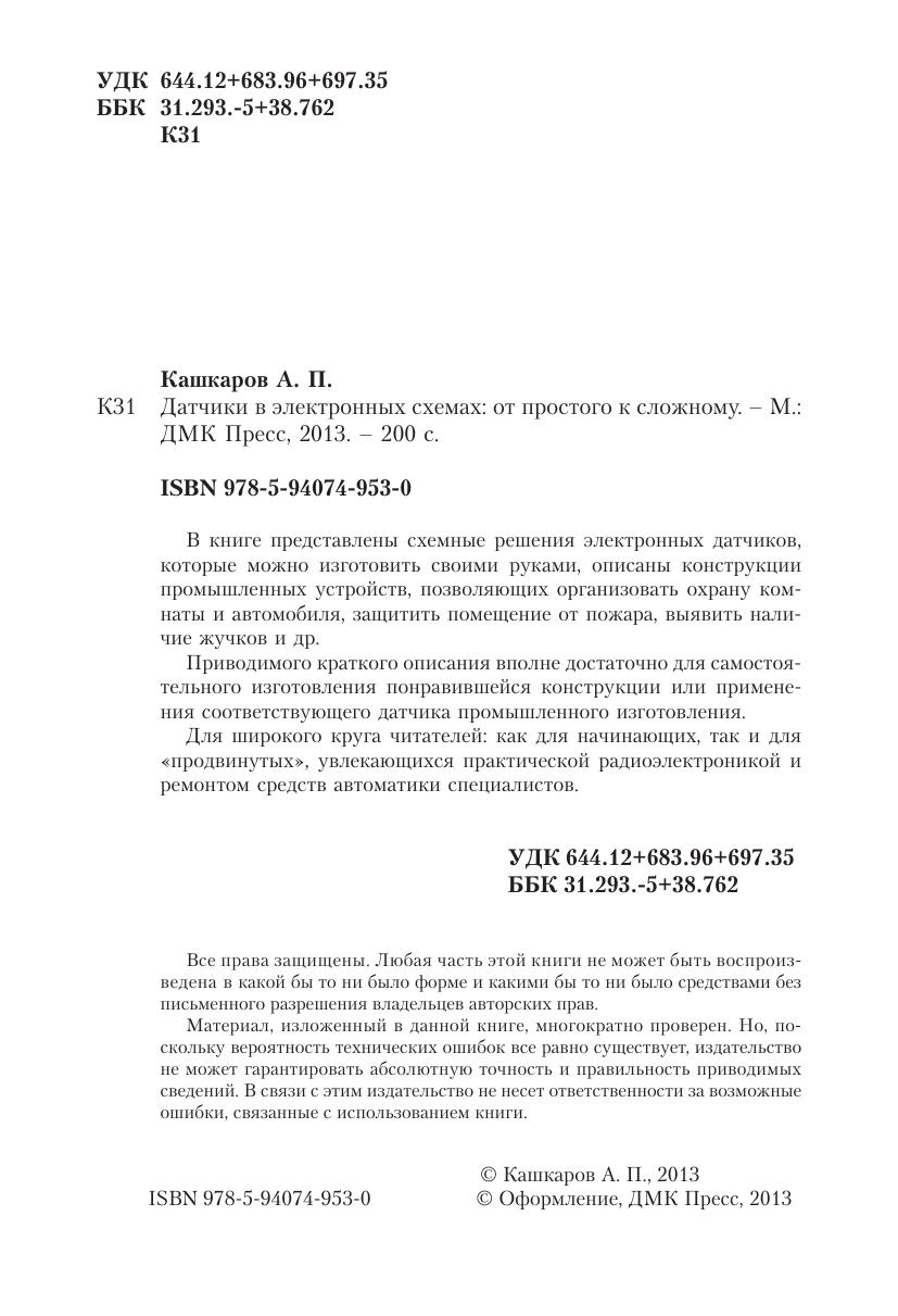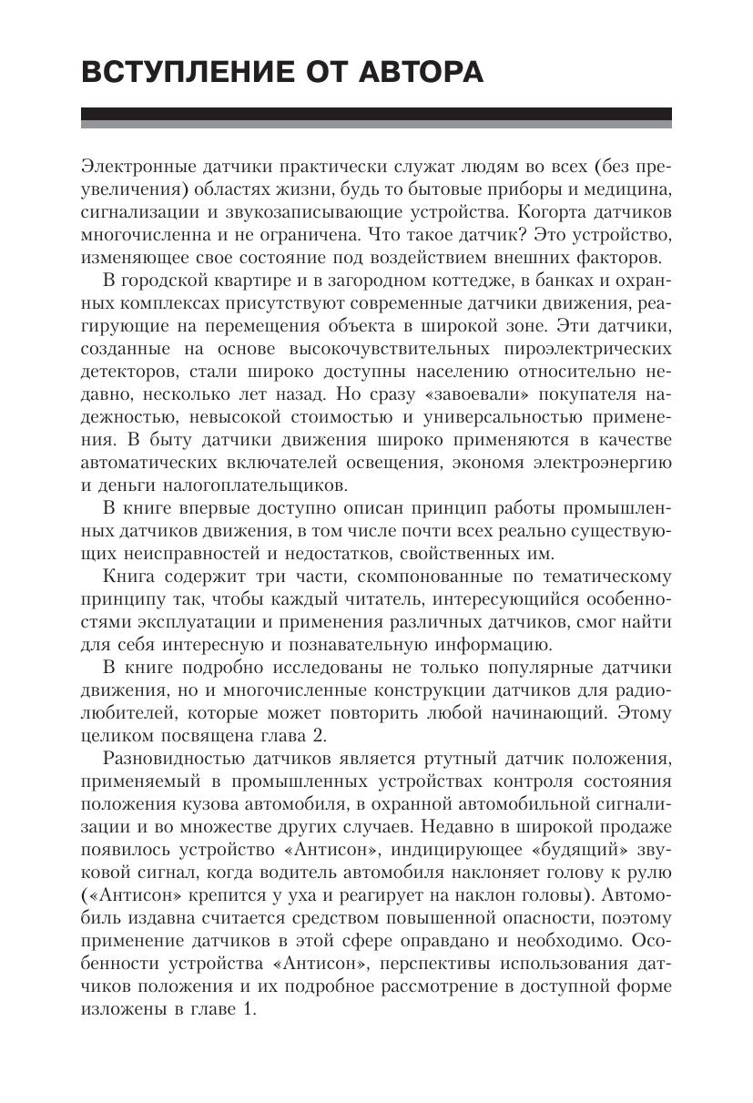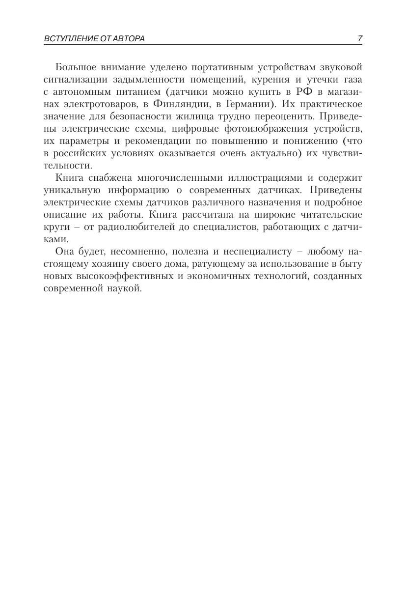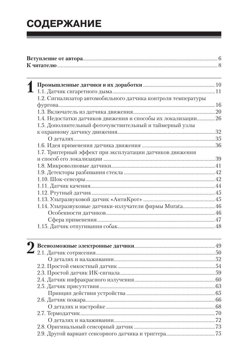 В книге представлены схемные решения электронных датчиков, которые можно изготовить своими руками, описаны конструкции промышленных устройств, позволяющих организовать охрану комнаты и автомобиля, защитить помещение от пожара, выявить наличие жучков и др. Приводимого краткого описания вполне достаточно для самостоятельного изготовления понравившейся конструкции или применения соответствующего датчика промышленного изготовления. Для широкого круга читателей: как для начинающих, так и для «продвинутых», увлекающихся практической радиоэлектроникой и ремонтом средств автоматики специалистов.