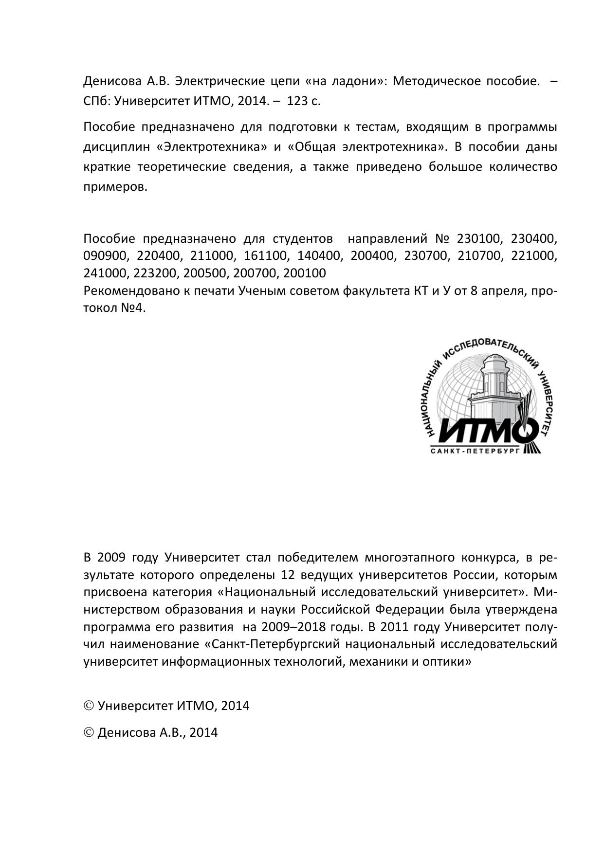 Пособие предназначено для подготовки к тестам, входящим в программы дисциплин «Электротехника» и «Общая электротехника». В пособии даны краткие теоретические сведения, а также приведено большое количество примеров. Пособие предназначено для студентов направлений № 230100, 230400, 090900, 220400, 211000, 161100, 140400, 200400, 230700, 210700, 221000, 241000, 223200, 200500, 200700, 200100