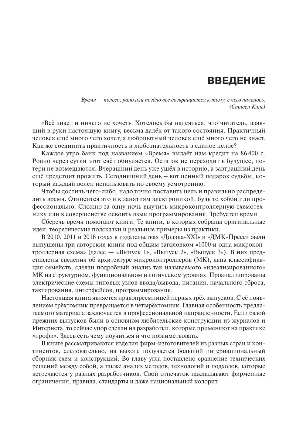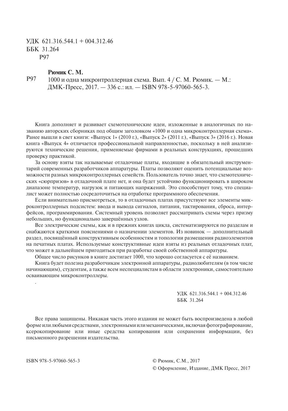 Книга дополняет и развивает схемотехнические идеи, изложенные в аналогичных по названию авторских сборниках под общим заголовком «1000 и одна микроконтроллерная схема». Ранее вышли в свет книги: «Выпуск 1» (2010 г.), «Выпуск 2» (2011 г.), «Выпуск 3» (2016 г.). Новая книга «Выпуск 4» отличается профессиональной направленностью, поскольку в ней анализируются технические решения, применяемые фирмами в реальных конструкциях, прошедших проверку практикой.