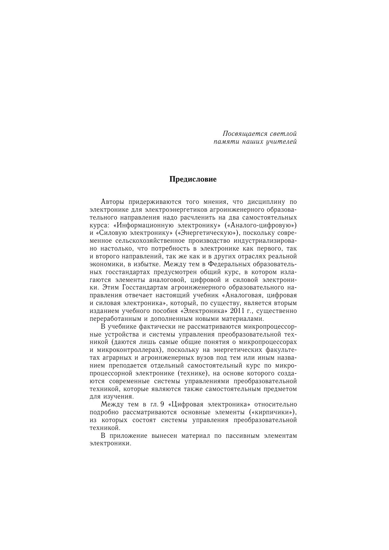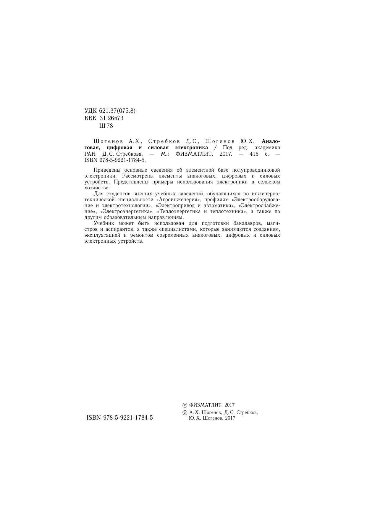 Приведены основные сведения об элементной базе полупроводниковой электроники. Рассмотрены элементы аналоговых, цифровых и силовых устройств. Представлены примеры использования электроники в сельском хозяйстве. Для студентов высших учебных заведений, обучающихся по инженерно-технической специальности «Агроинженерия», профилям «Электрооборудование и электротехнологии», «Электропривод и автоматика», «Электроснабжение», «Электроэнергетика», «Теплоэнергетика и теплотехника», а также по другим образовательным направлениям. Учебник может быть использован для подготовки бакалавров, магистров и аспирантов, а также специалистами, которые занимаются созданием, эксплуатацией и ремонтом современных аналоговых, цифровых и силовых электронных устройств.