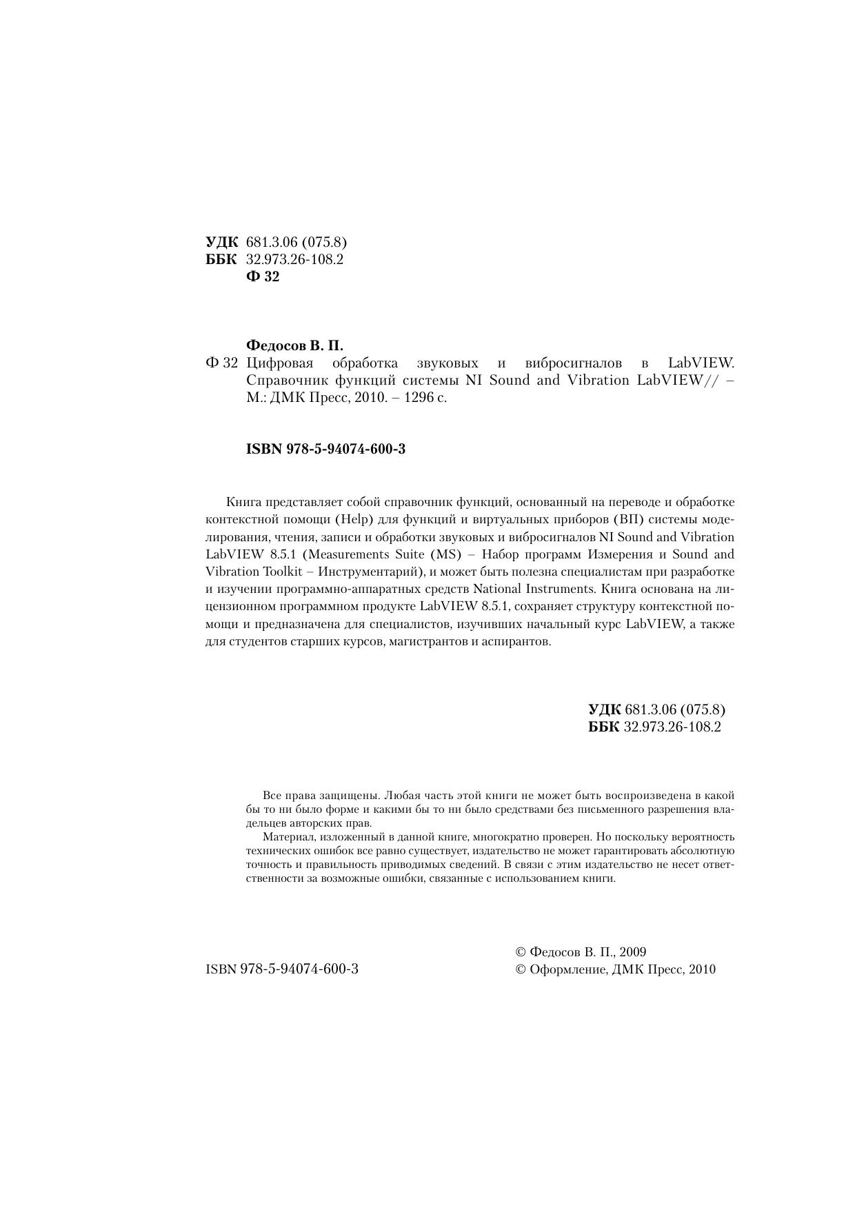 Книга представляет собой справочник функций, основанный на переводе и обработке контекстной помощи (Help) для функций и виртуальных приборов (ВП) системы моделирования, чтения, записи и обработки звуковых и вибросигналов NI Sound and Vibration LabVIEW 8.5.1 (Measurements Suite (MS) – Набор программ Измерения и Sound and Vibration Toolkit – Инструментарий), и может быть полезна специалистам при разработке и изучении программно-аппаратных средств National Instruments. Книга основана на лицензионном программном продукте LabVIEW 8.5.1, сохраняет структуру контекстной помощи и предназначена для специалистов, изучивших начальный курс LabVIEW, а также для студентов старших курсов, магистрантов и аспирантов.