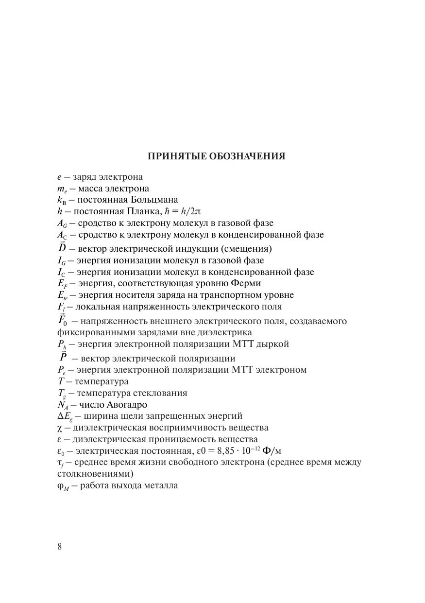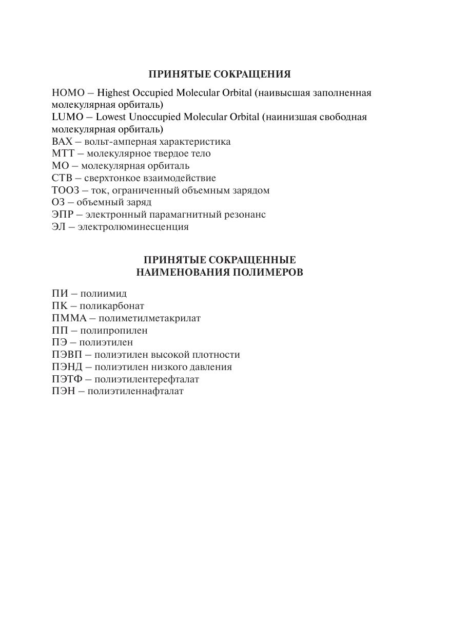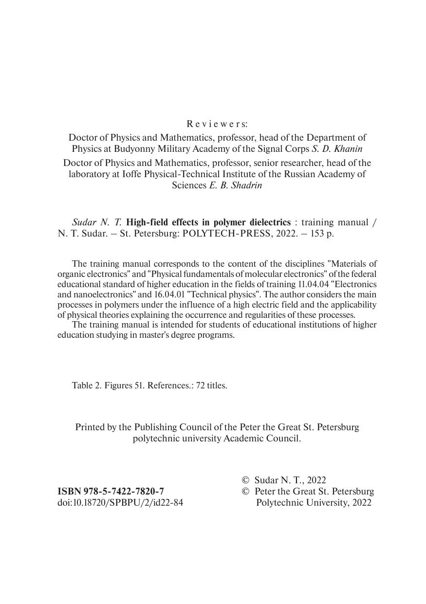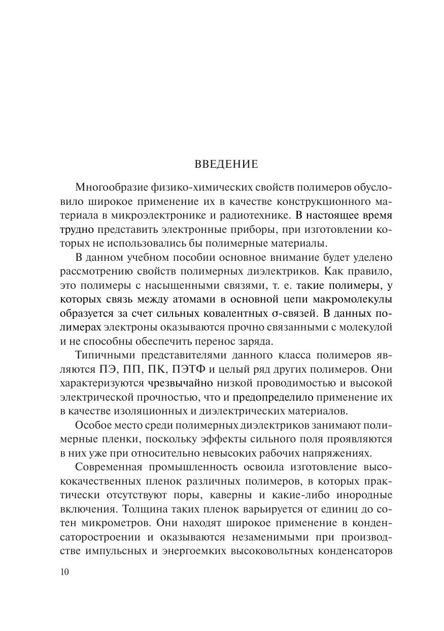 Учебное пособие соответствует содержанию дисциплин «Материалы органической электроники» и «Физические основы молекулярной электроники» федерального образовательного стандарта высшего образования по направлению подготовки 11.04.04 «Электроника и наноэлектроника» и 16.04.01 «Техническая физика». Рассмотрены основные процессы, развивающиеся в полимерах в условиях воздействия на них сильного электрического поля и применимость физических теорий, объясняющих возникновение и закономерности этих процессов. Учебное пособие предназначено для студентов высших учебных заведений, обучающихся по магистерским программам.
