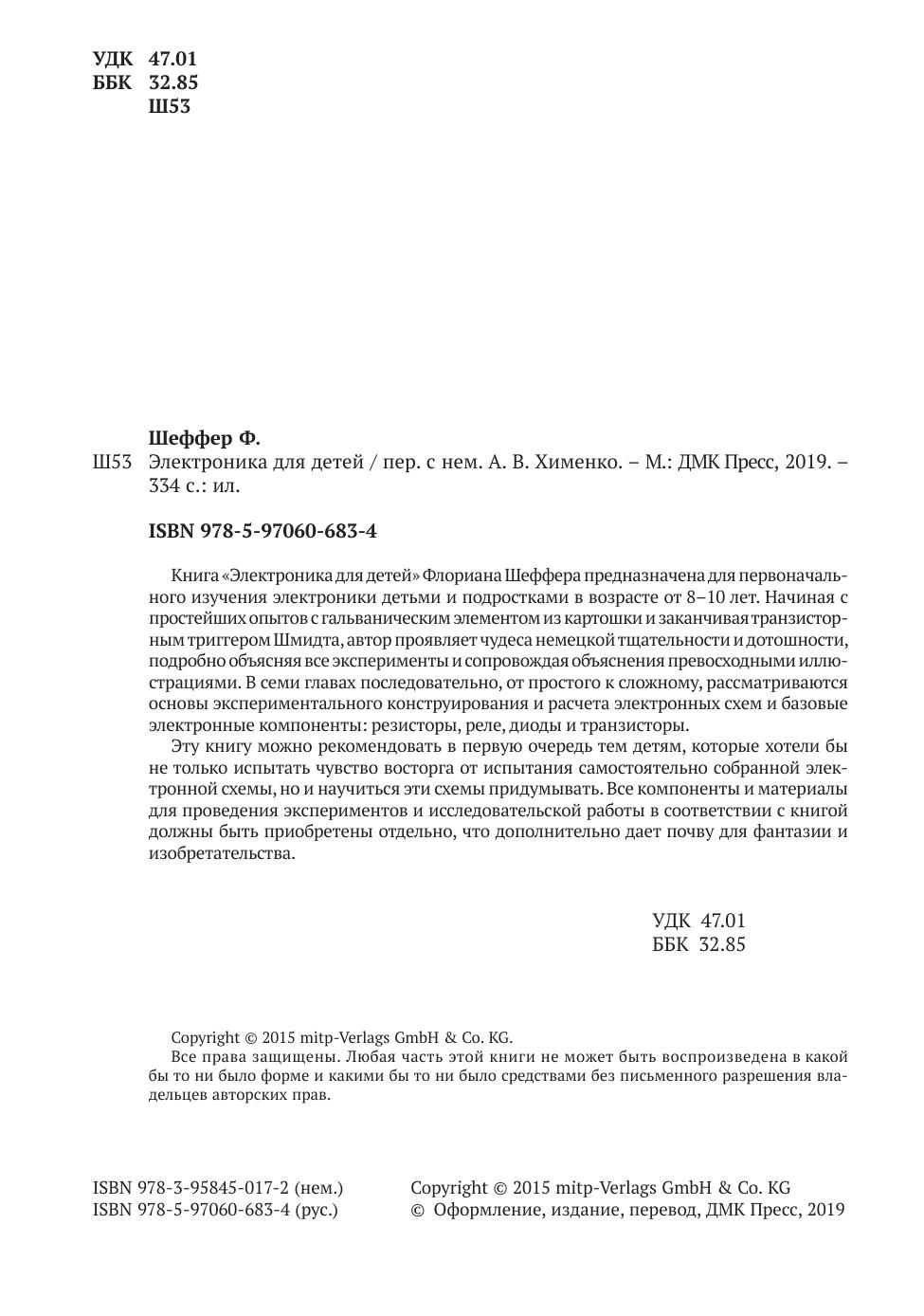 Книга предназначена для первоначального изучения электроники детьми и подростками в возрасте от 8–12 лет. Начиная с простейших опытов с гальваническим элементом из картошки и заканчивая транзисторным триггером Шмидта, автор проявляет чудеса немецкой тщательности и дотошности, подробно объясняя все эксперименты и сопровождая их превосходными иллюстрациями.