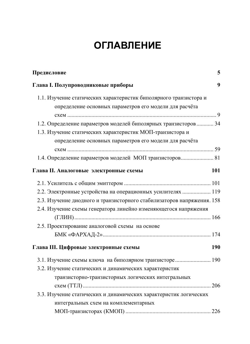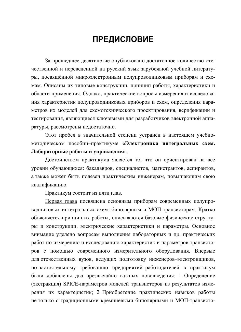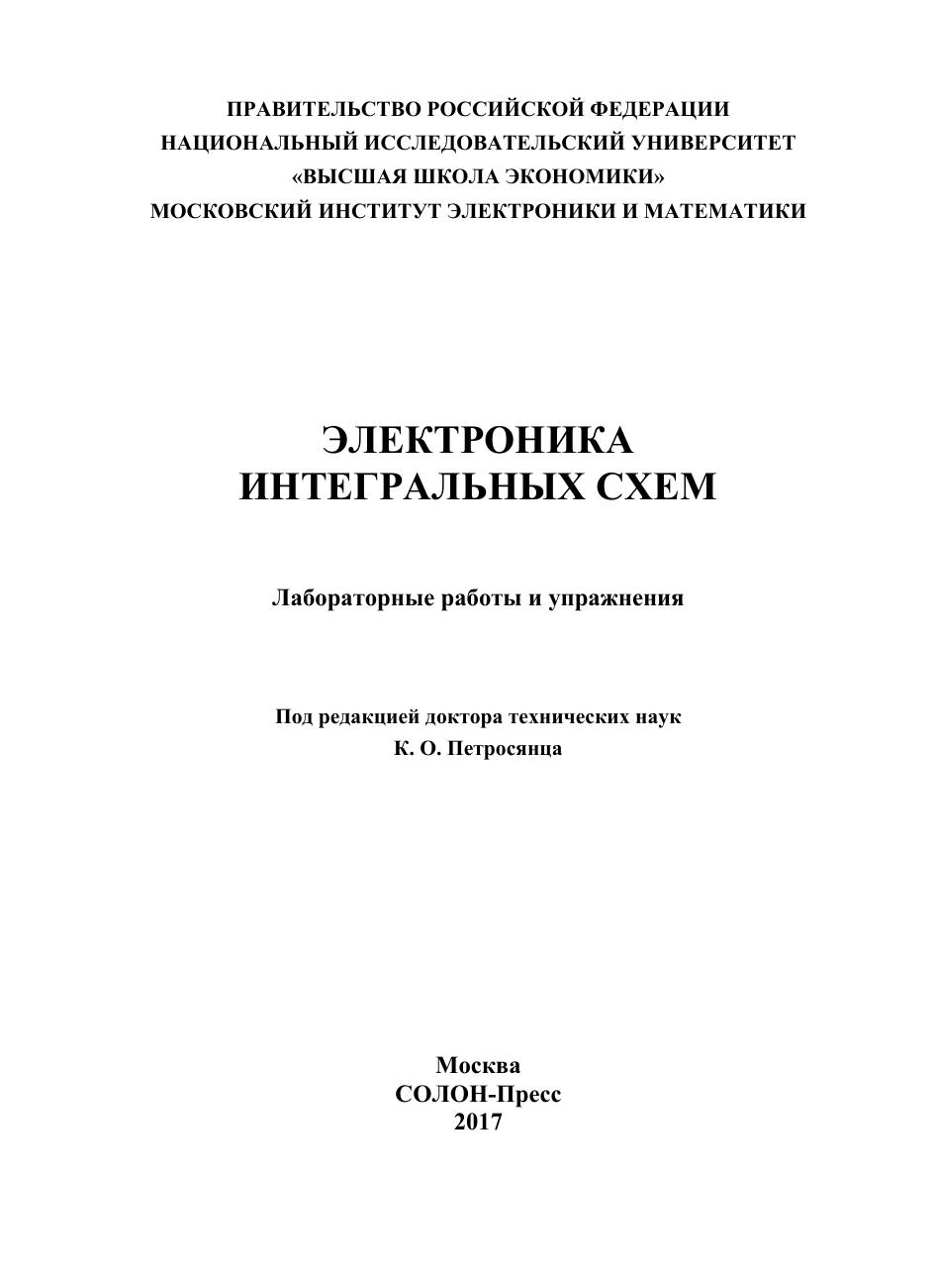 Рассмотрены принципы работы и электрические характеристики биполярных и МОП-транзисторов иснтегральных схем, базовых элементов цифровой и аналоговой схемотехники, БМК ПМЛ, микроконтроллеров и микропроцессоров. Описаны методики выполнения лабораторных, расчетных на ЭВМ, курсовых, самостоятельных и др. работ. Пособие предназначено для бакалавров и магистров различных специальностей, изучающих электронику, микроэлектронику и схемотехнику; отдельные разделы могут быть полезными для аспирантов и инжинеров-практиков.