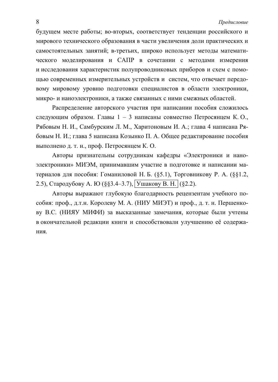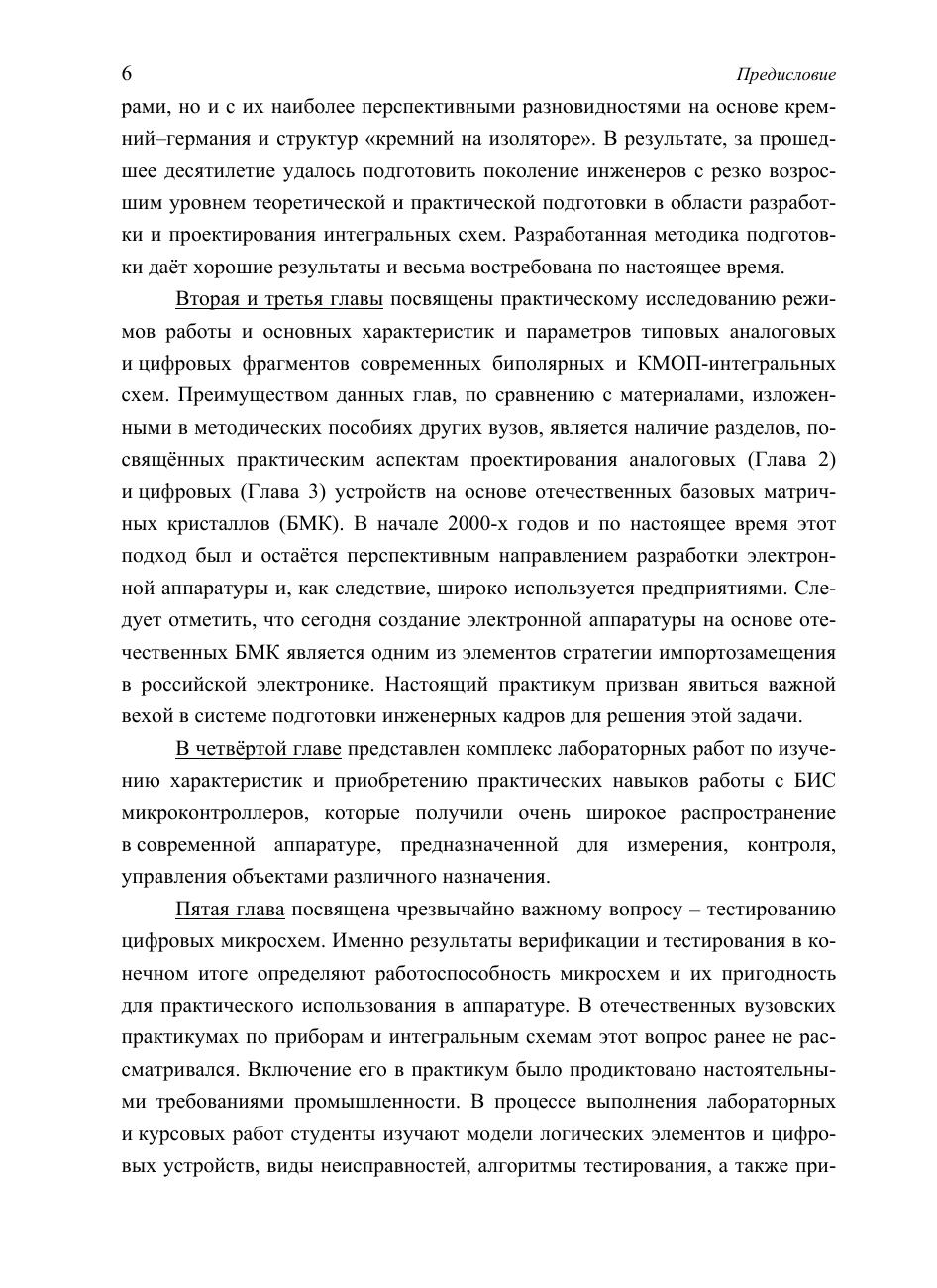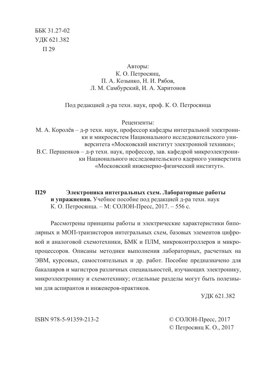 Рассмотрены принципы работы и электрические характеристики биполярных и МОП-транзисторов иснтегральных схем, базовых элементов цифровой и аналоговой схемотехники, БМК ПМЛ, микроконтроллеров и микропроцессоров. Описаны методики выполнения лабораторных, расчетных на ЭВМ, курсовых, самостоятельных и др. работ. Пособие предназначено для бакалавров и магистров различных специальностей, изучающих электронику, микроэлектронику и схемотехнику; отдельные разделы могут быть полезными для аспирантов и инжинеров-практиков.