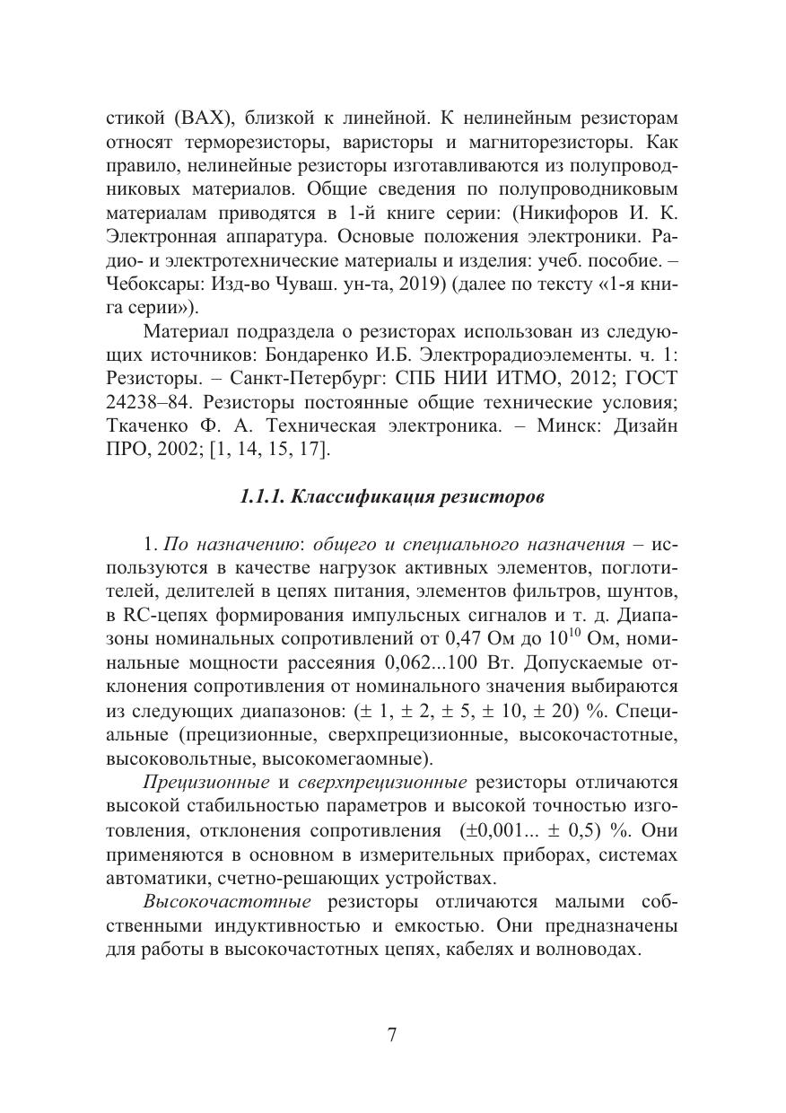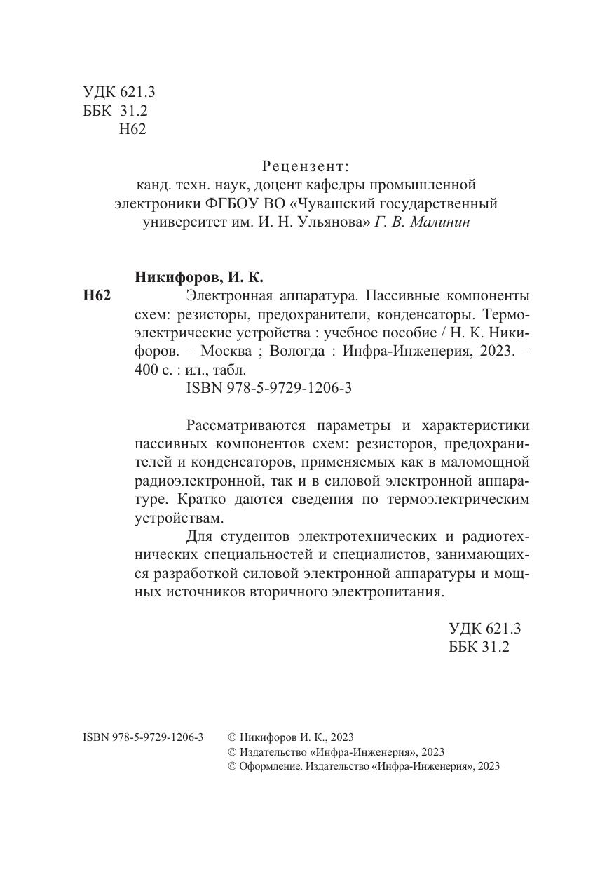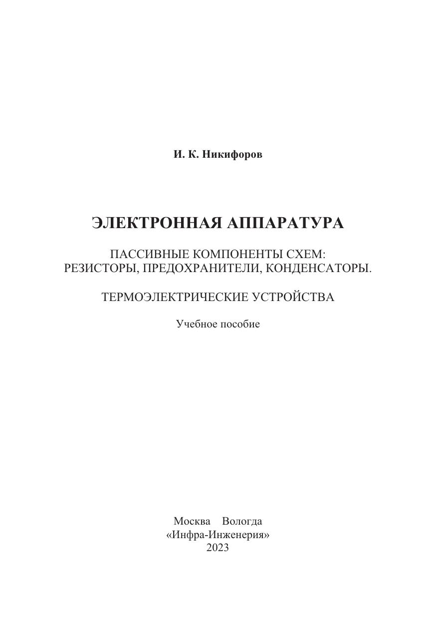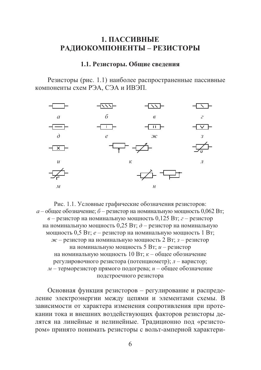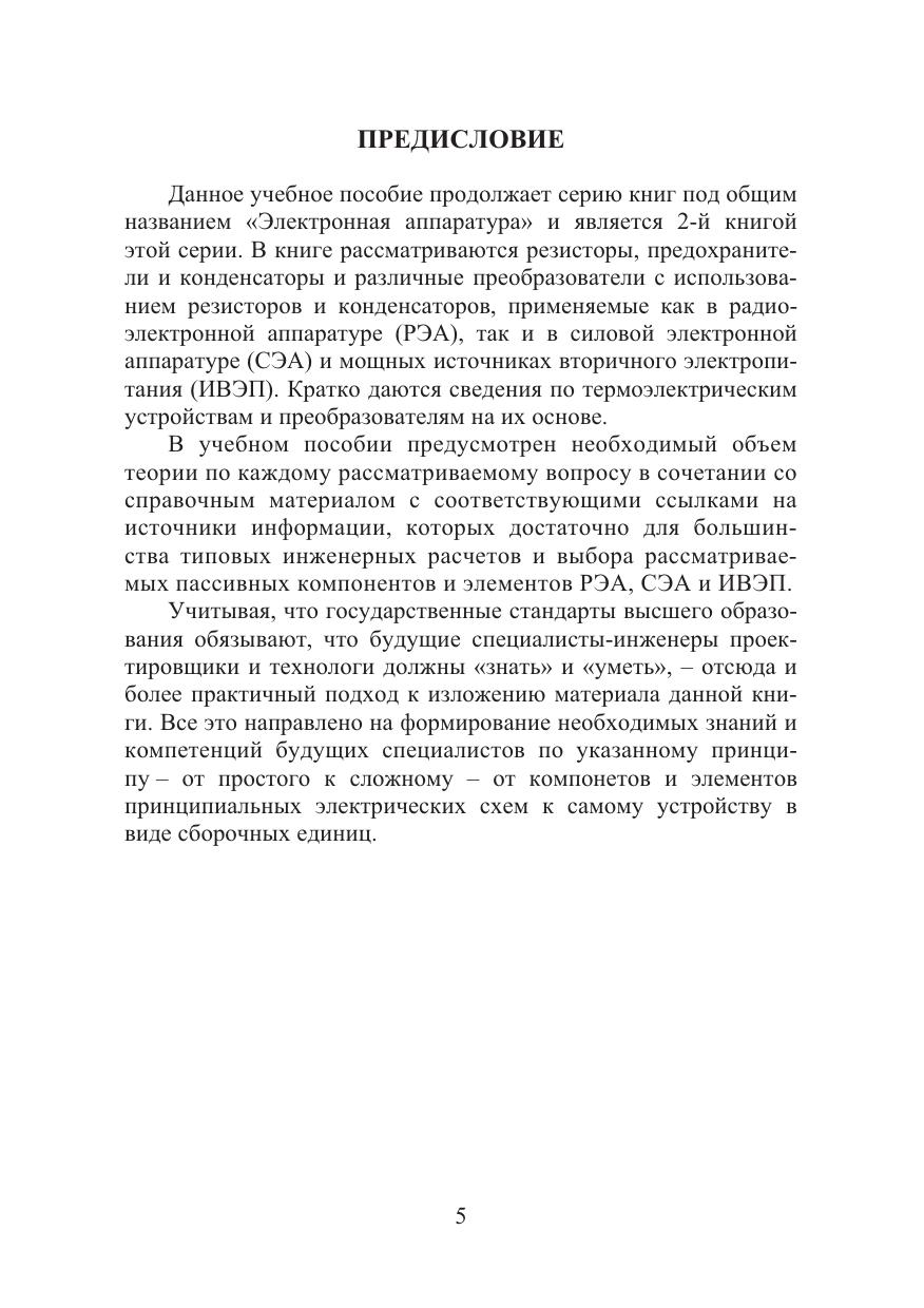 Рассматриваются параметры и характеристики пассивных компонентов схем: резисторов, предохранителей и конденсаторов, применяемых как в маломощной радиоэлектронной, так и в силовой электронной аппаратуре. Кратко даются сведения по термоэлектрическим устройствам.