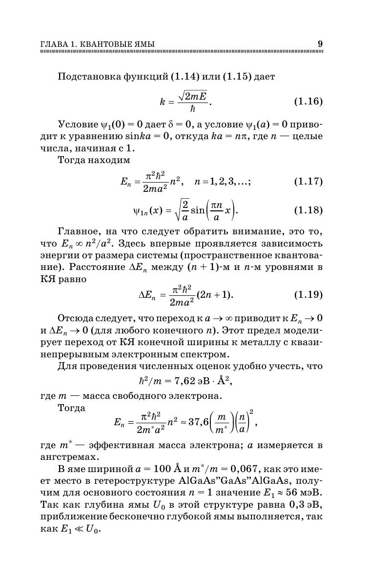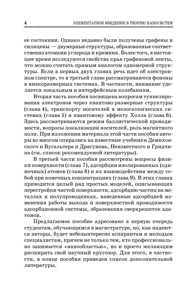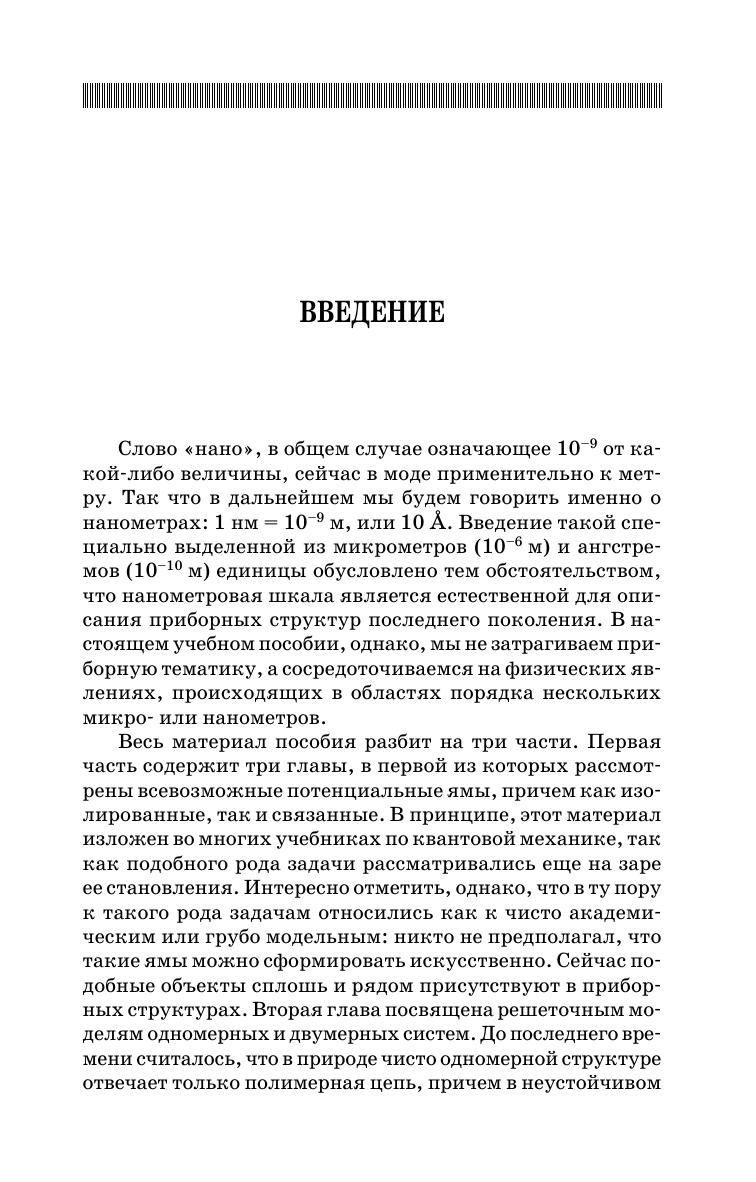 В книге в рамках единого подхода рассматривается широкий круг задач: от электронных состояний в потенциальных ямах до квантового эффекта Холла. Особое внимание уделяется электронной структуре низкоразмерных систем и их транспортным особенностям в наноразмерной области. Подробно описываются свойства поверхности и ее адсорбционная способность. Подчеркнем, что здесь излагаются физические идеи и теоретические подходы к изучаемым проблемам, наборы же экспериментальных фактов, равно как и описание самих экспериментов, остаются за рамками настоящей книги. Каждая глава сопровождается задачами, предложены темы соответствующих семинаров. Для углубленного изучения материала по каждой главе приводится список дополнительной литературы. Отметим, что для успешного усвоения предлагаемого материала вполне достаточно знаний математики и квантовой физики, получаемых студентами на первых трех курсах университетов. Настоящее учебное пособие предназначено для магистров физических и материаловедческих направлений, но может быть полезно аспирантам и молодым научным сотрудникам, интересующимся данной проблематикой.
