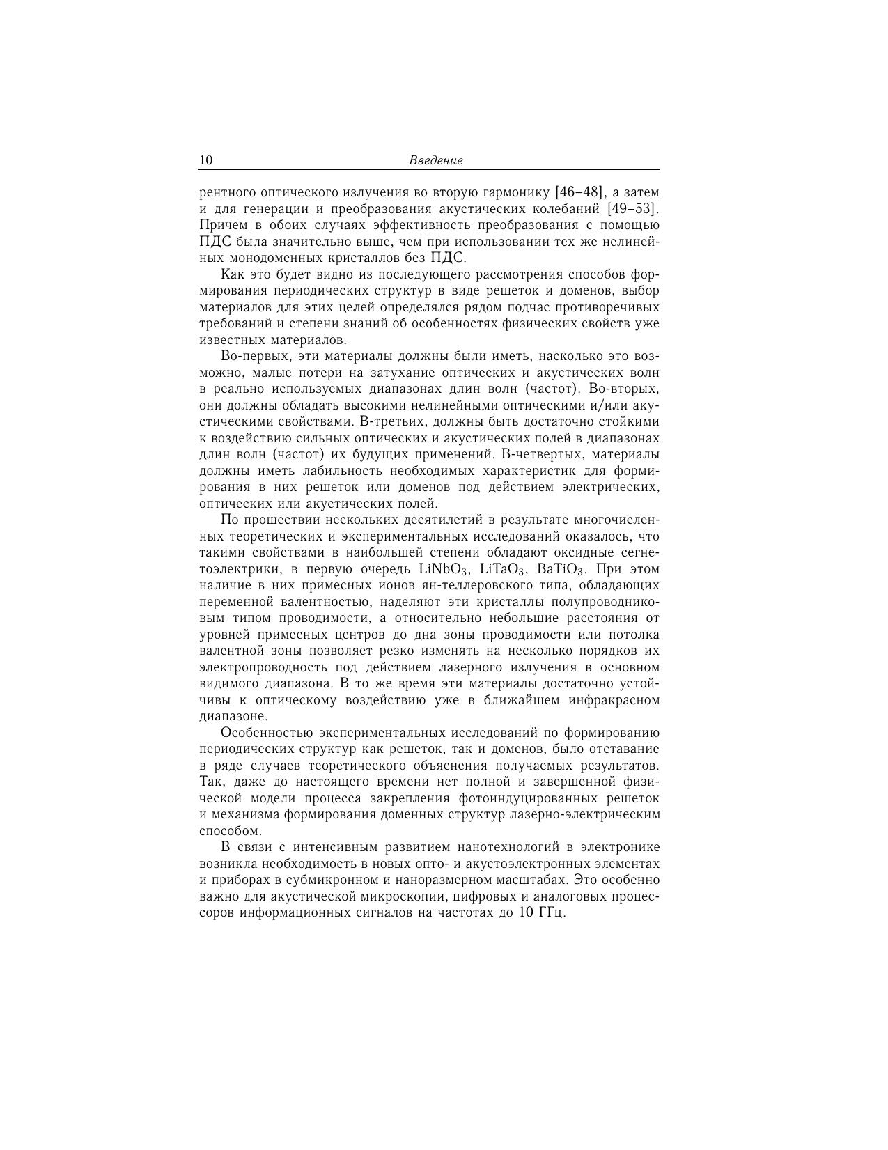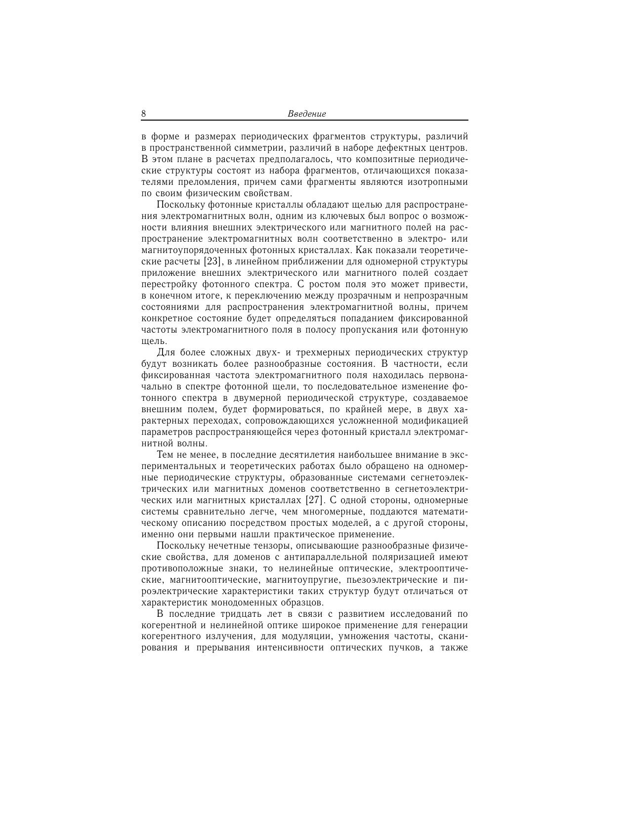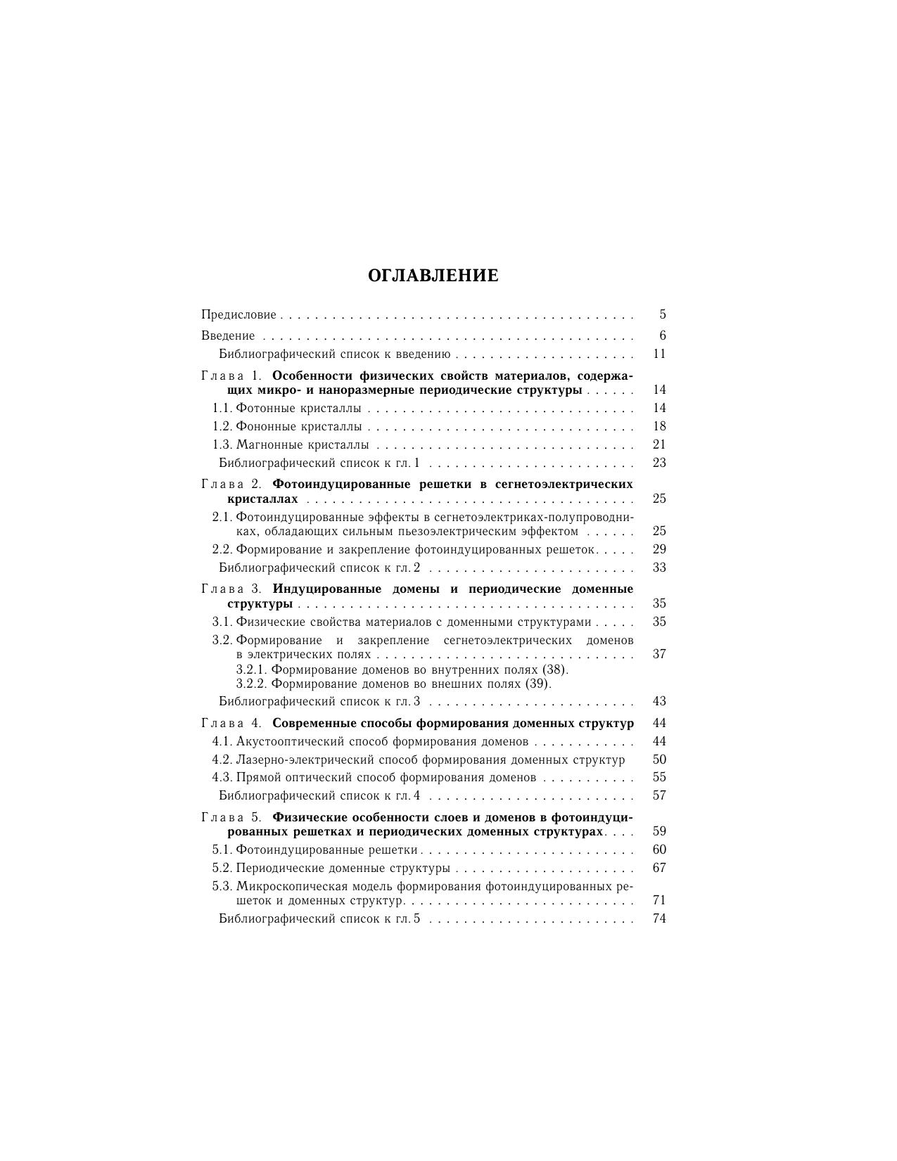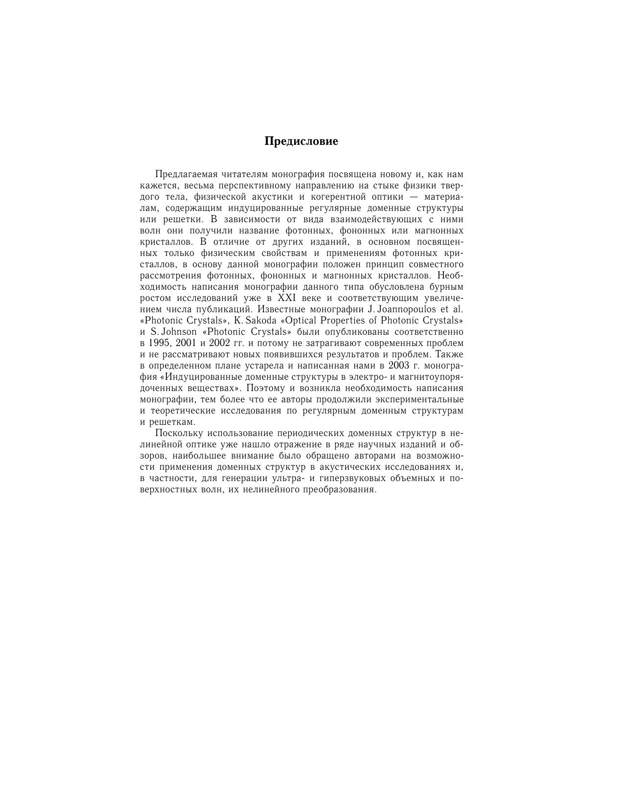 Рассматриваются современные методы формирования регулярных доменных структур и фотоиндуцированных решеток в сегнетоэлектрических кристаллах, а также их основные физические особенности. Изложены особенности линейного и нелинейного взаимодействия оптических и акустических волн с периодическими структурами в сегнетоэлектриках. Большое внимание уделено применению подобных материалов, получивших название фотонных и фононных кристаллов, в приборах и устройствах опто- и акустоэлектроники для генерации, фильтрации и умножения частоты, параметрического преобразования оптических и акустических волн. Научным работникам и специалистам, работающим в области квантовой электроники, акусто- и оптоэлектроники, а также аспирантам и студентам старших курсов вузов.