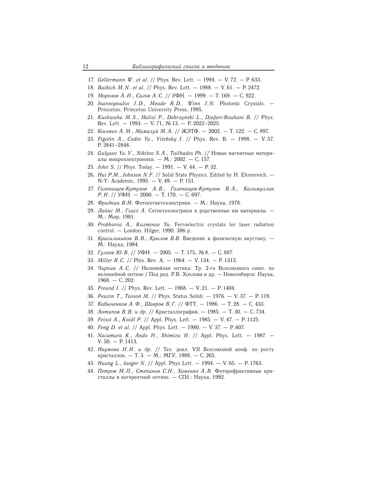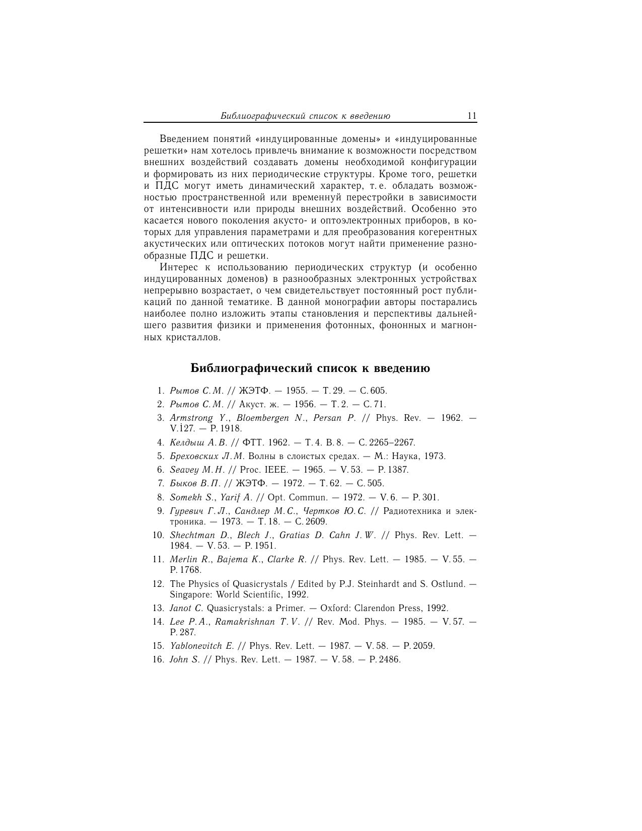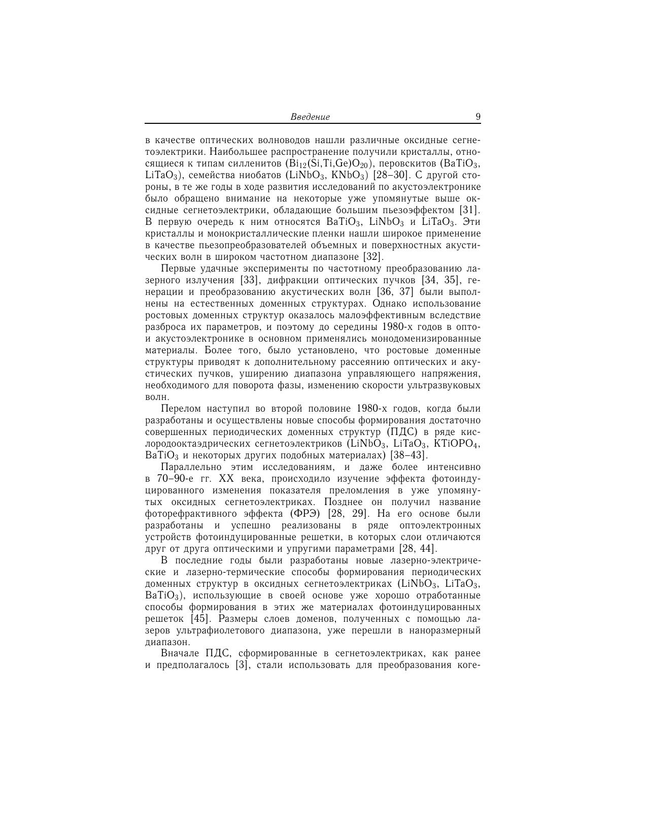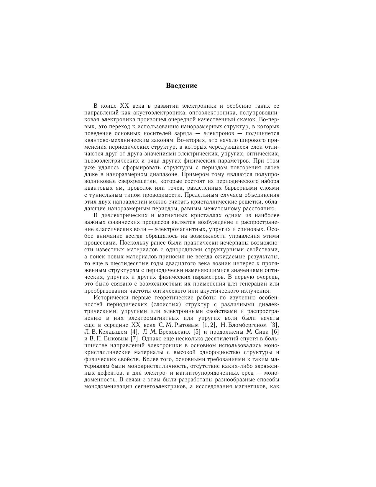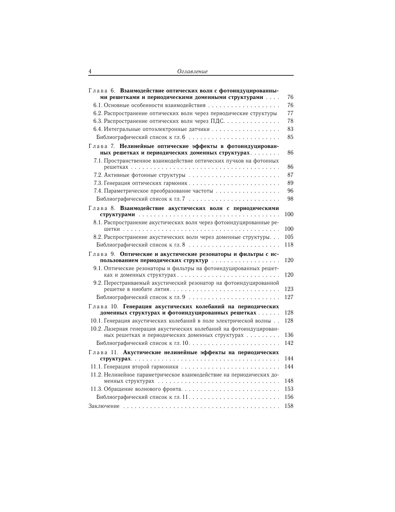 Рассматриваются современные методы формирования регулярных доменных структур и фотоиндуцированных решеток в сегнетоэлектрических кристаллах, а также их основные физические особенности. Изложены особенности линейного и нелинейного взаимодействия оптических и акустических волн с периодическими структурами в сегнетоэлектриках. Большое внимание уделено применению подобных материалов, получивших название фотонных и фононных кристаллов, в приборах и устройствах опто- и акустоэлектроники для генерации, фильтрации и умножения частоты, параметрического преобразования оптических и акустических волн. Научным работникам и специалистам, работающим в области квантовой электроники, акусто- и оптоэлектроники, а также аспирантам и студентам старших курсов вузов.