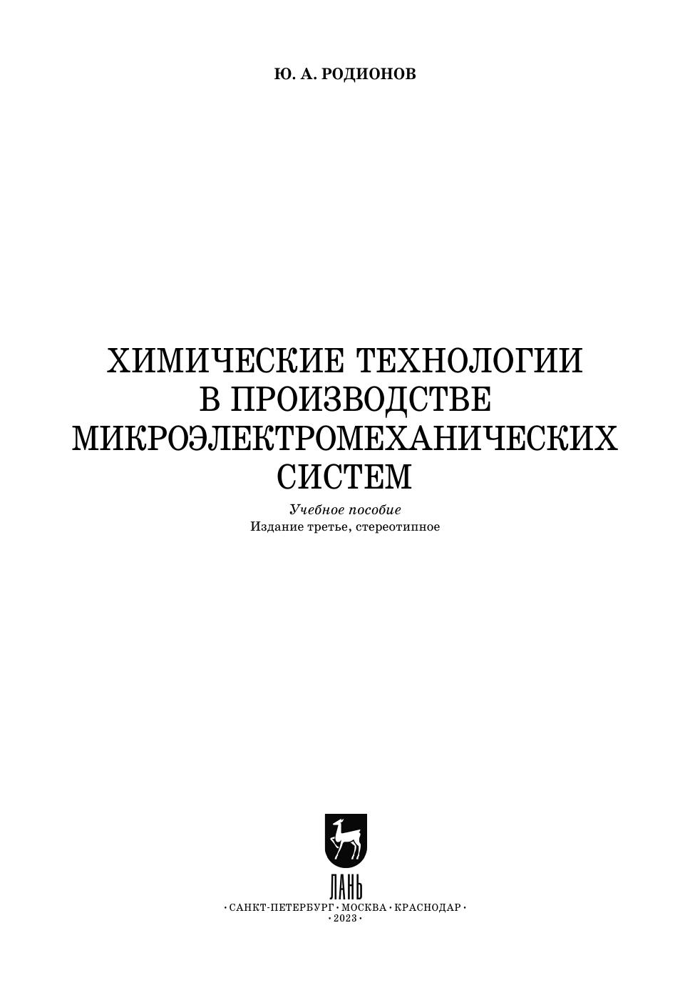 Рассмотрены основные положения общей и физической химии в технологических процессах интегральных микросхем и микроэлектромеханических систем. Основное внимание уделено химическим процессам в серийном производстве микро- и наноэлементов, материалам и оборудованию, обеспечивающему данные процессы. Приводятся конкретные технологические процессы химической подготовки и обработки технологических слоёв и их особенности в серийном производстве. Учебное пособие предназначено для студентов высших учебных заведений, обучающихся по направлениям подготовки бакалавриата и магистратуры «Электроника и наноэлектроника», «Конструирование и технология электронных средств».