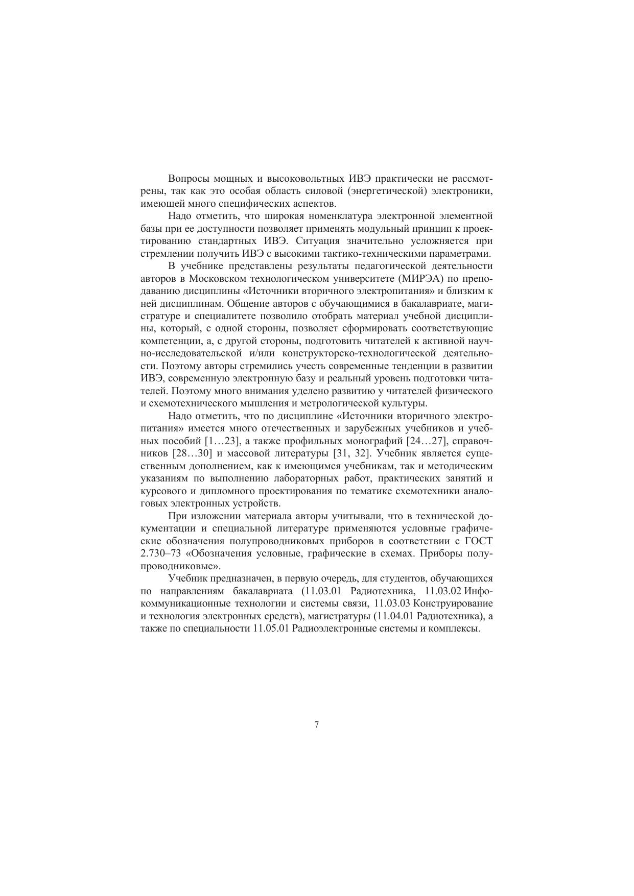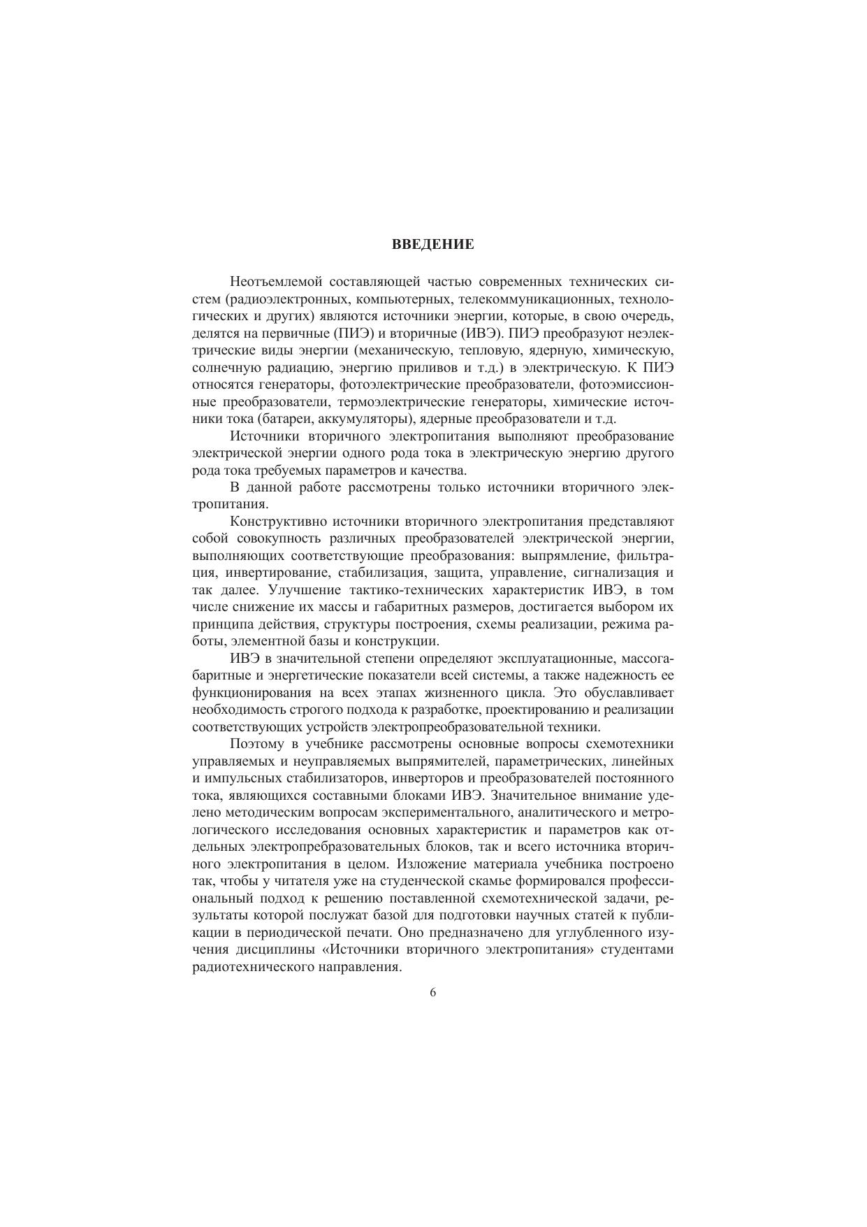 Рассмотрены базовые вопросы физики и схемотехники построения современных источников вторичного электропитания, включающих управляемые и неуправляемые выпрямительные устройства, параметрические, линейные и импульсные стабилизаторы напряжения, инверторы тока и напряжения и преобразователи постоянного тока. Значительное внимание уделено методическим вопросам экспериментального, аналитического и метрологического исследования основных характеристик и параметров как отдельных электропреобразовательных блоков, так и всего источника вторичного электропитания в целом. Изложение материала учебника построено так, чтобы у читателя уже на студенческой скамье формировался профессиональный подход к подготовке научных статей к публикации в периодической печати. Учебник предназначен для углубленного изучения дисциплины «Источники вторичного электропитания» студентами радиотехнического направления. Учебник является существенным дополнением, как к имеющимся учебникам, так и методическим указаниям по выполнению лабораторных работ, практических занятий и курсового и дипломного проектирования по тематике схемотехники аналоговых электронных устройств.