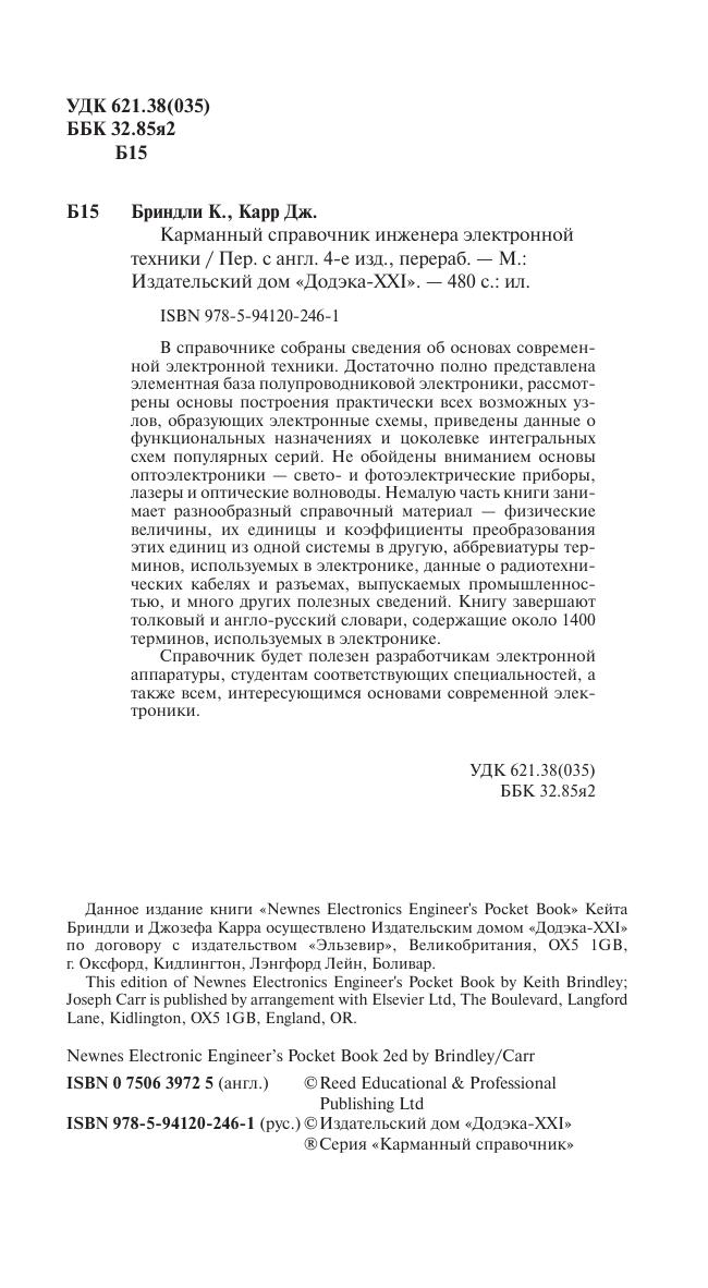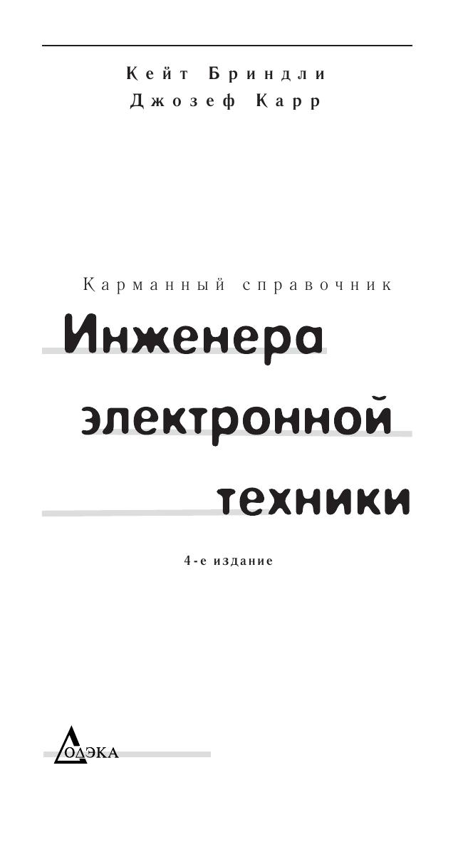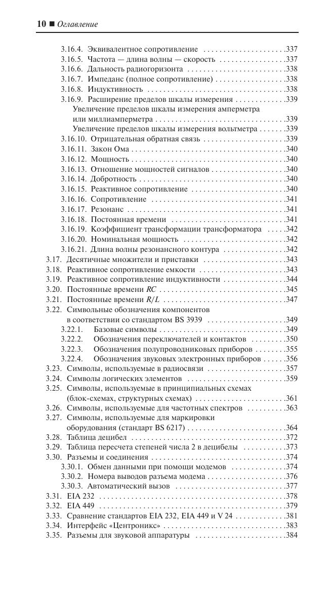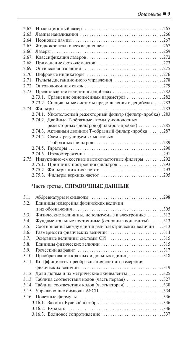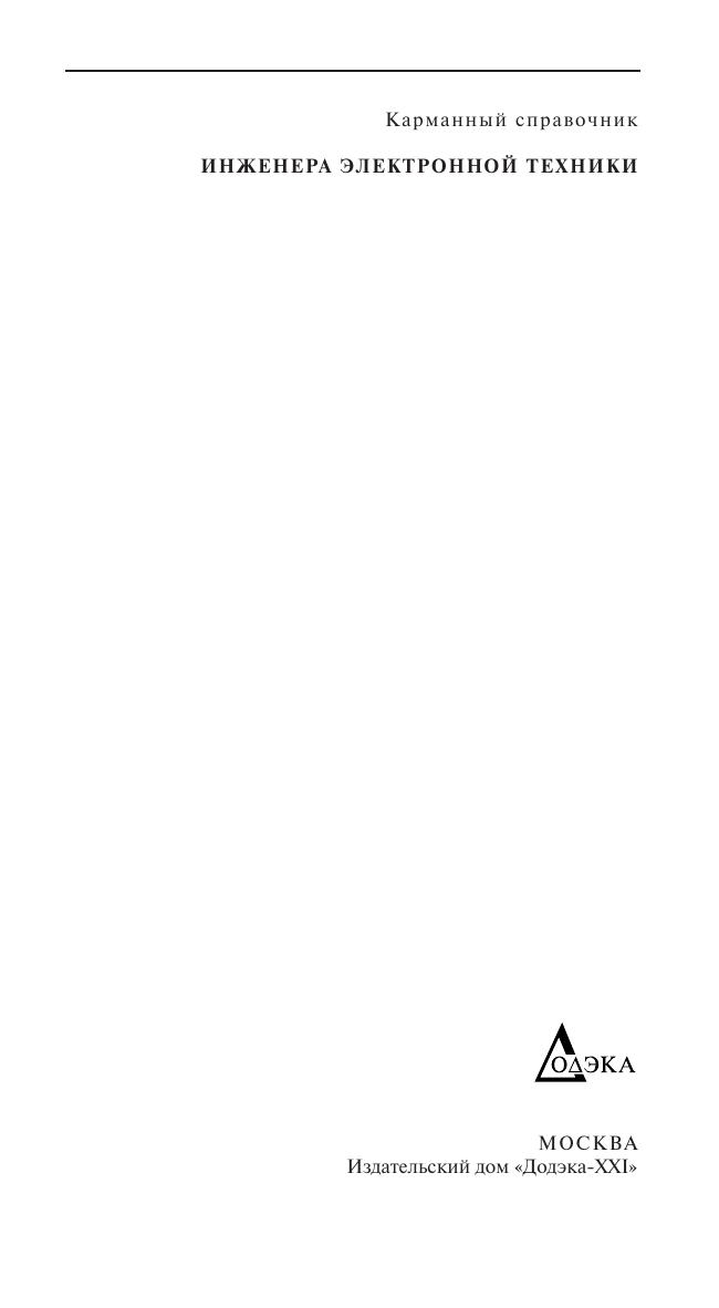 В справочнике собраны сведения об основах современной электронной техники. Достаточно полно представлена элементная база полупроводниковой электроники, рассмотрены основы построения практически всех возможных узлов, образующих электронные схемы, приведены данные о функциональных назначениях и цоколевке интегральных схем популярных серий. Не обойдены вниманием основы оптоэлектроники — свето и фотоэлектрические приборы, лазеры и оптические волноводы. Немалую часть книги занимает разнообразный справочный материал — физические величины, их единицы и коэффициенты преобразования этих единиц из одной системы в другую, аббревиатуры терминов, используемых в электронике, данные о радиотехнических кабелях и разъемах, выпускаемых промышленностью, и много других полезных сведений. Kнигу завершают толковый и англо русский словари, содержащие около 1400 терминов, используемых в электронике. Справочник будет полезен разработчикам электронной аппаратуры, студентам соответствующих специальностей, а также всем, интересующимся основами современной электроники.