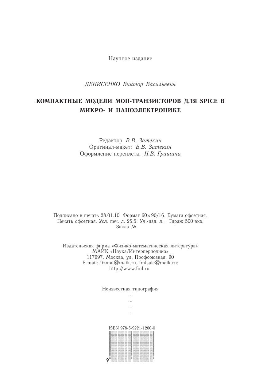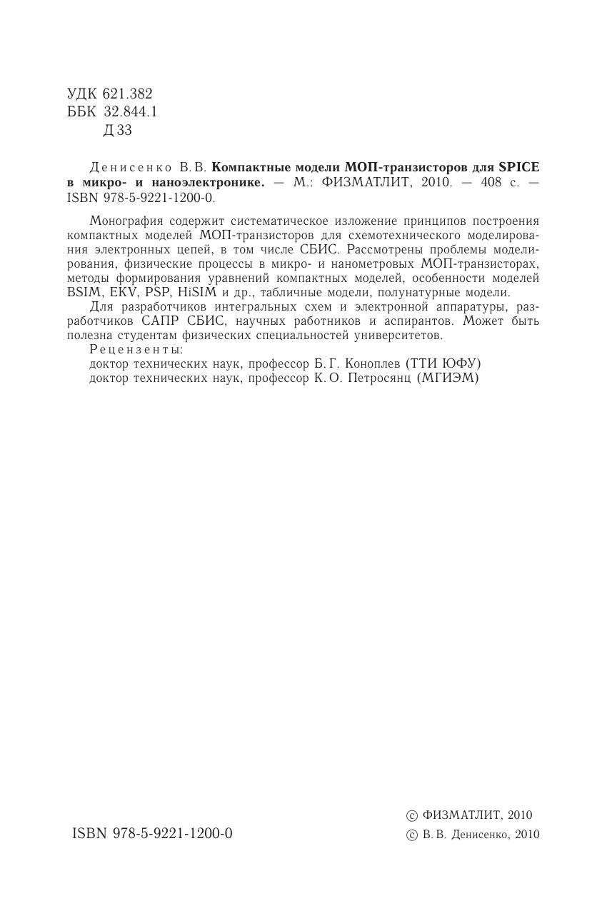 Монография содержит систематическое изложение принципов построения компактных моделей МОП-транзисторов для схемотехнического моделирования электронных цепей, в том числе СБИС. Рассмотрены проблемы моделирования, физические процессы в микро- и нанометровых МОП-транзисторах, методы формирования уравнений компактных моделей, особенности моделей BSIM, EKV, PSP, HiSIM и др., табличные модели, полунатурные модели.Для разработчиков интегральных схем и электронной аппаратуры, разработчиков САПР СБИС, научных работников и аспирантов. Может быть полезна студентам физических специальностей университетов.