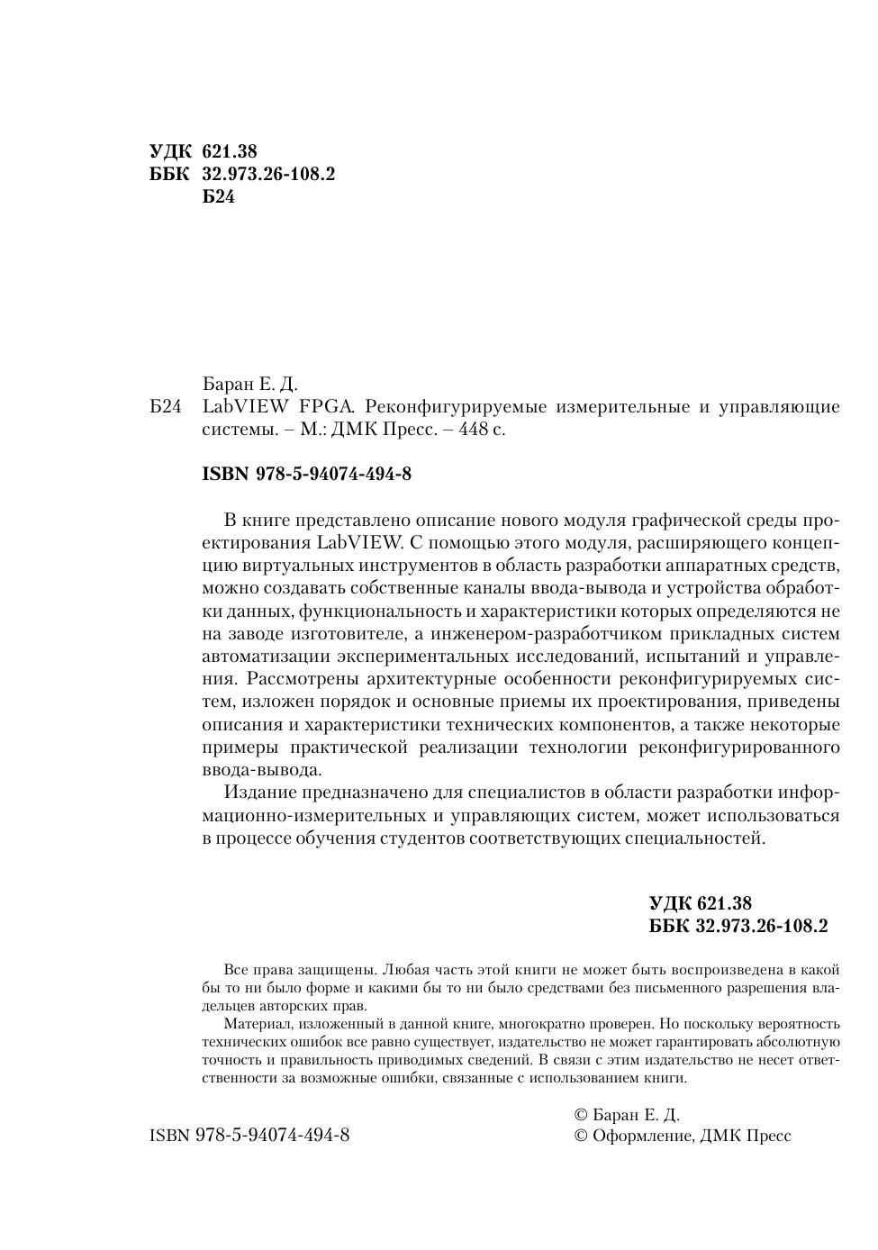 В книге представлено описание нового модуля графической среды проектирования LabVIEW. С помощью этого модуля, расширяющего концепцию виртуальных инструментов в область разработки аппаратных средств, можно создавать собственные каналы ввода-вывода и устройства обработки данных, функциональность и характеристики которых определяются не на заводе изготовителе, а инженером разработчиком прикладных систем автоматизации экспериментальных исследований, испытаний и управления. Рассмотрены архитектурные особенности реконфигурируемых систем, изложен порядок и основные приемы их проектирования, приведены описания и характеристики технических компонентов, а также некоторые примеры практической реализации технологии реконфигурированного ввода-вывода. Издание предназначено для специалистов в области разработки информационно измерительных и управляющих систем, может использоваться в процессе обучения студентов соответствующих специальностей.