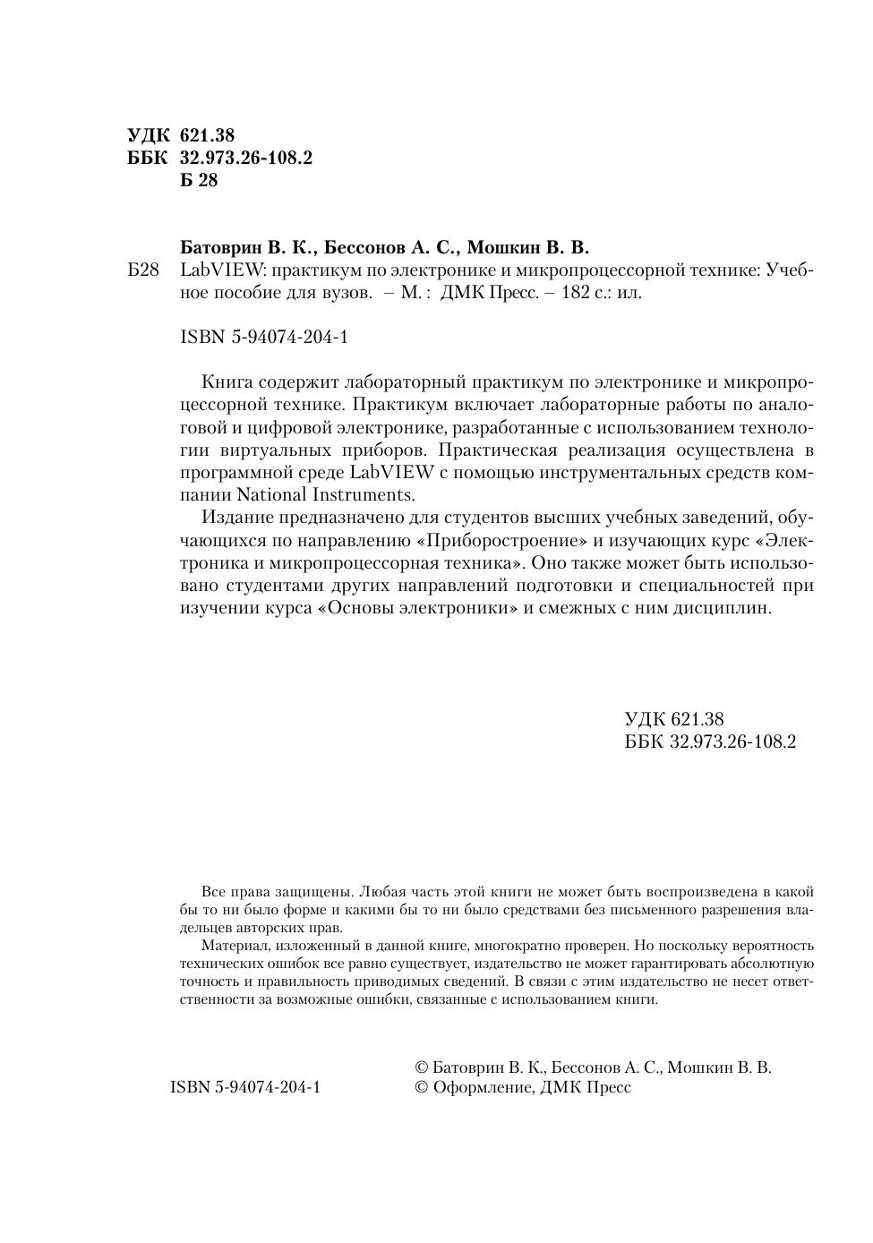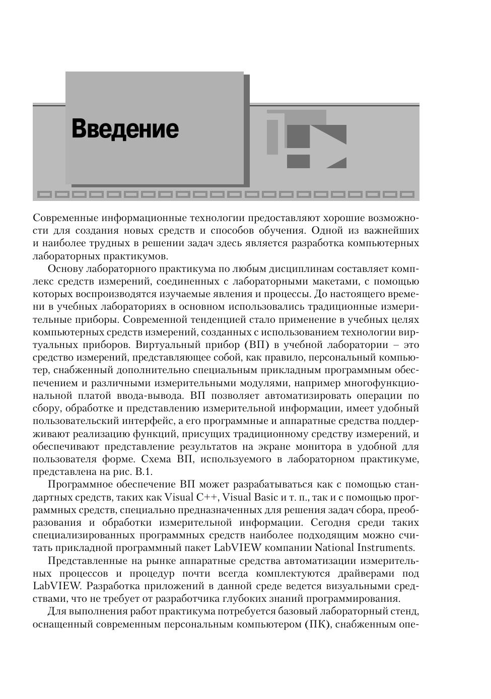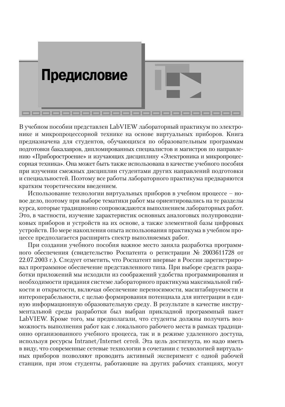 Книга содержит лабораторный практикум по электронике и микропроцессорной технике. Практикум включает лабораторные работы по аналоговой и цифровой электронике, разработанные с использованием технологии виртуальных приборов. Практическая реализация осуществлена в программной среде LabVIEW с помощью инструментальных средств компании National Instruments. Издание предназначено для студентов высших учебных заведений, обучающихся по направлению «Приборостроение» и изучающих курс «Электроника и микропроцессорная техника». Оно также может быть использовано студентами других направлений подготовки и специальностей при изучении курса «Основы электроники» и смежных с ним дисциплин.