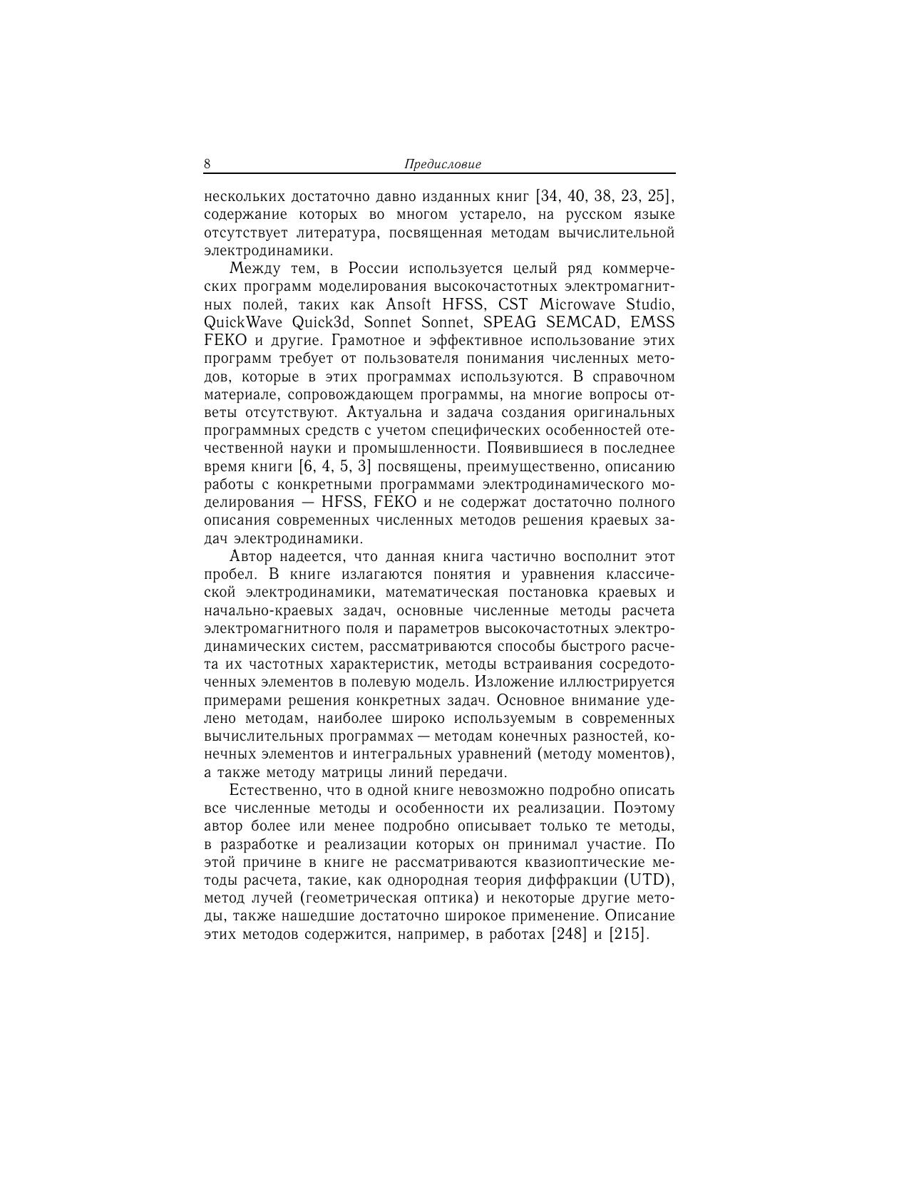 В книге рассматривается математическая постановка начальных и начально-краевых задач электродинамики, условия существования и единственности их решений. Изложены основные этапы и основные численные методы решения задач электродинамики: метод конечных разностей, метод конечных элементов, метод конечного интегрирования, метод моментов, метод матрицы линий передачи. Рассмотрены методы аппроксимации уравнений и граничных условий, методы расчета электромагнитного поля в ближней и дальней зонах, алгоритмы вычисления параметров электродинамических систем и антенн. Приводятся примеры расчета. Рассчитана на инженеров, научных работников и аспирантов, работающих в области вычислительной электродинамики, микроволновой электроники и техники.