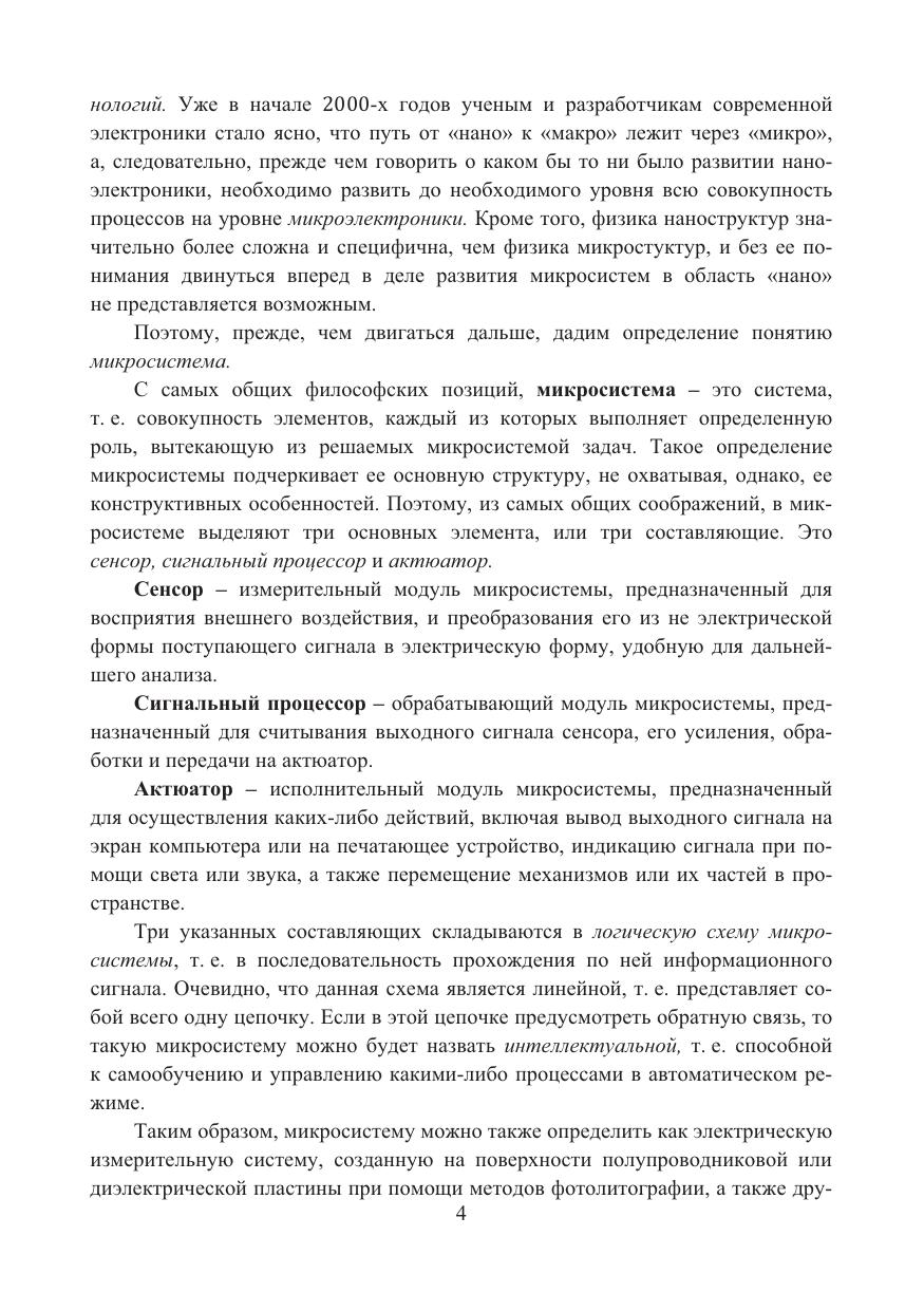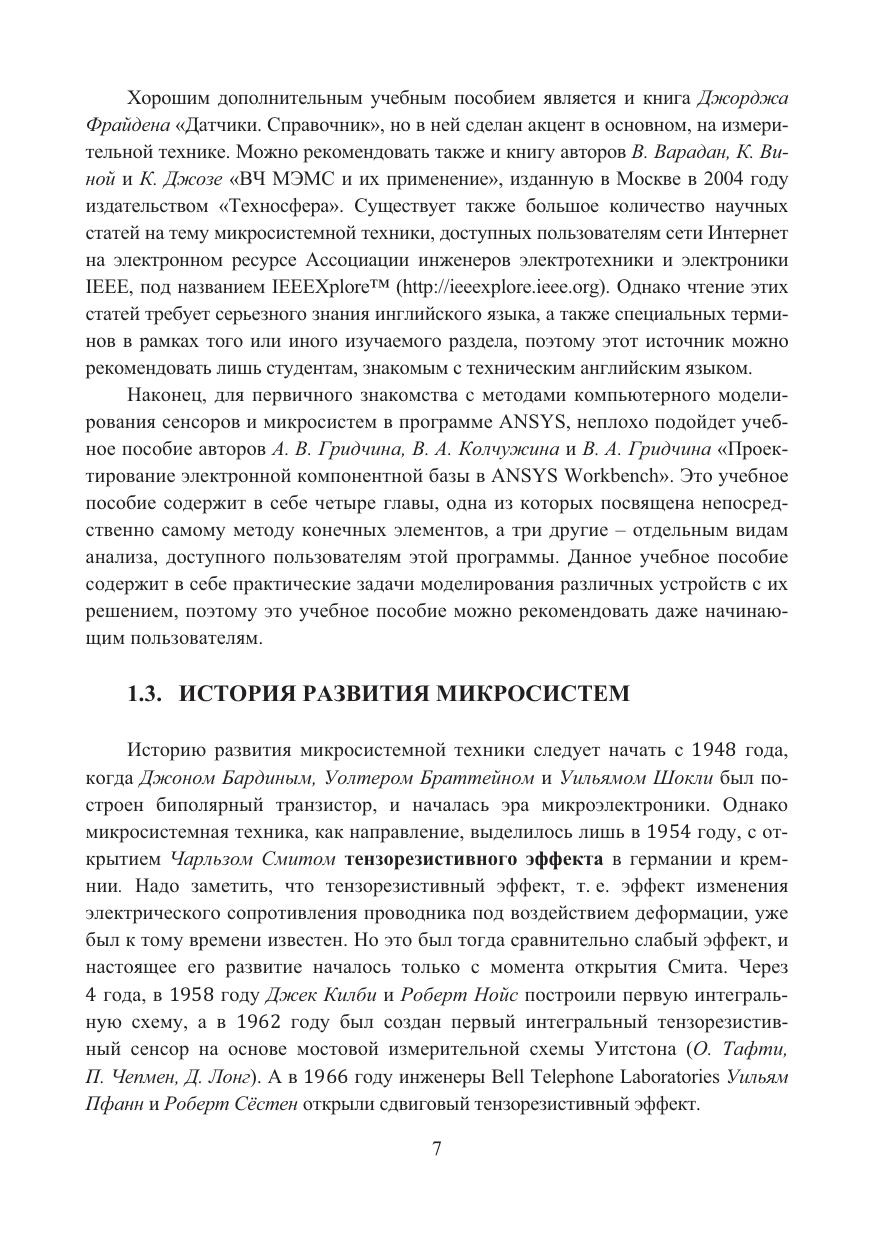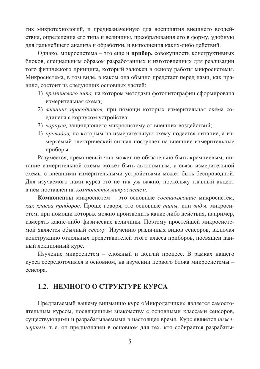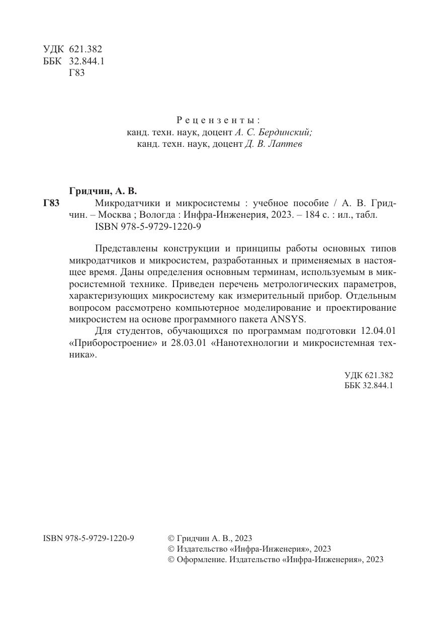 Представлены конструкции и принципы работы основных типов микродатчиков и микросистем, разработанных и применяемых в настоящее время. Даны определения основным терминам, используемым в микросистемной технике. Приведен перечень метрологических параметров, характеризующих микросистему как измерительный прибор. Отдельным вопросом рассмотрено компьютерное моделирование и проектирование микросистем на основе программного пакета ANSYS.