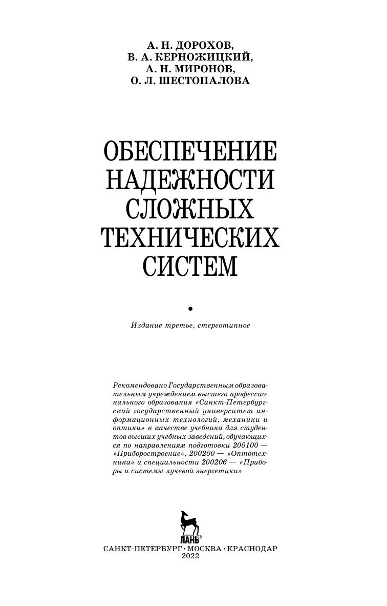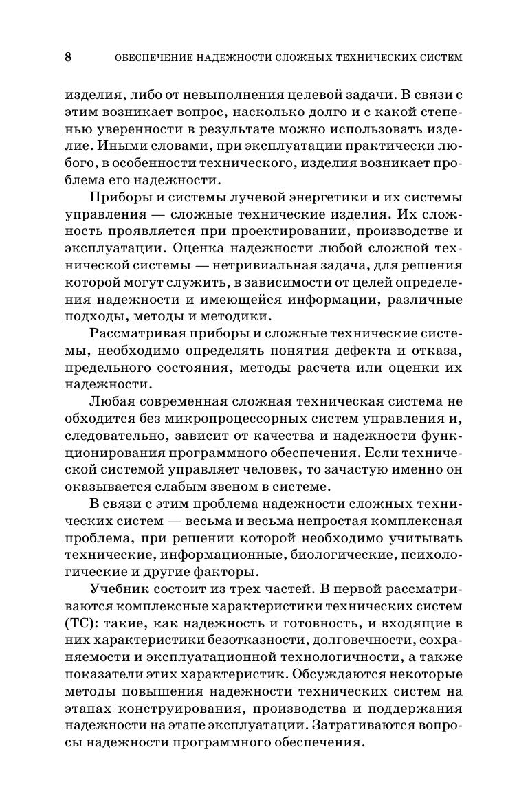 Рассматриваются комплексные характеристики сложных технических систем, используемые на различных этапах их жизненного цикла. Показываются подходы к определению и оценке технического состояния, приводятся некоторые методы его контроля, диагностирования и прогнозирования, получения информации о техническом состоянии и испытаниях систем. Рассматриваются вопросы обеспечения надежности технических систем на этапе эксплуатации. Предназначен для студентов, обучающихся по направлениям подготовки «Приборостроение», «Оптотехника», «Фотоника и оптоинформатика» и специальности «Приборы и системы лучевой энергетики». Будет полезен специалистам, аспирантам и научным работникам в области надежности сложных технических систем.