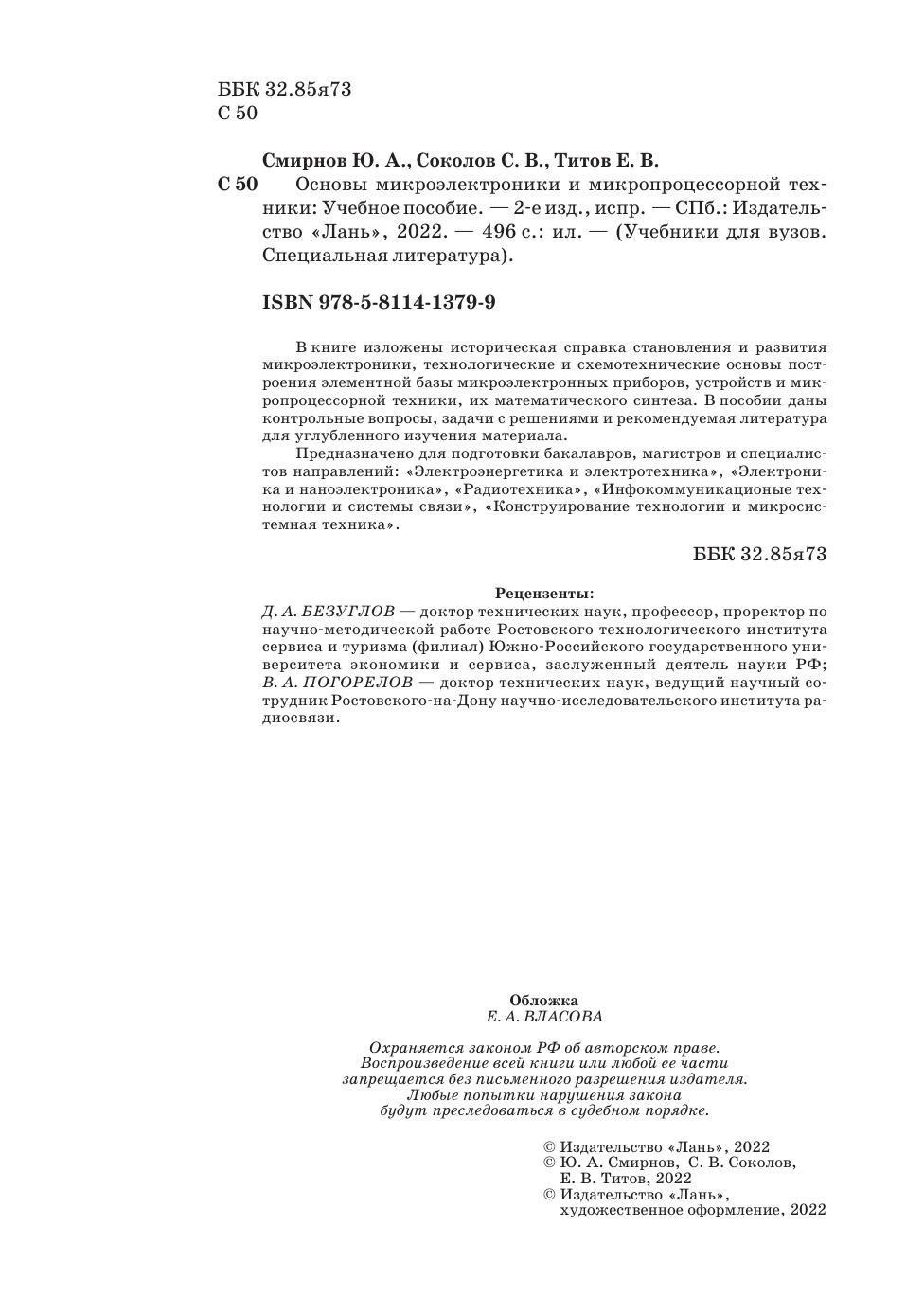 В книге изложены историческая справка становления и развития микроэлектроники, технологические и схемотехнические основы построения элементной базы микроэлектронных приборов, устройств и микропроцессорной техники, их математического синтеза. Пособие содержит контрольные вопросы, задачи с решениями и рекомендуемую литературу для углубленного изучения материала. Предназначено для подготовки бакалавров, магистров и специалистов направлений: «Электроэнергетика и электротехника», «Электроника и наноэлектроника», «Радиотехника», «Инфокоммуникационные технологии и системы связи», «Конструирование технологии и микросистемная техника».