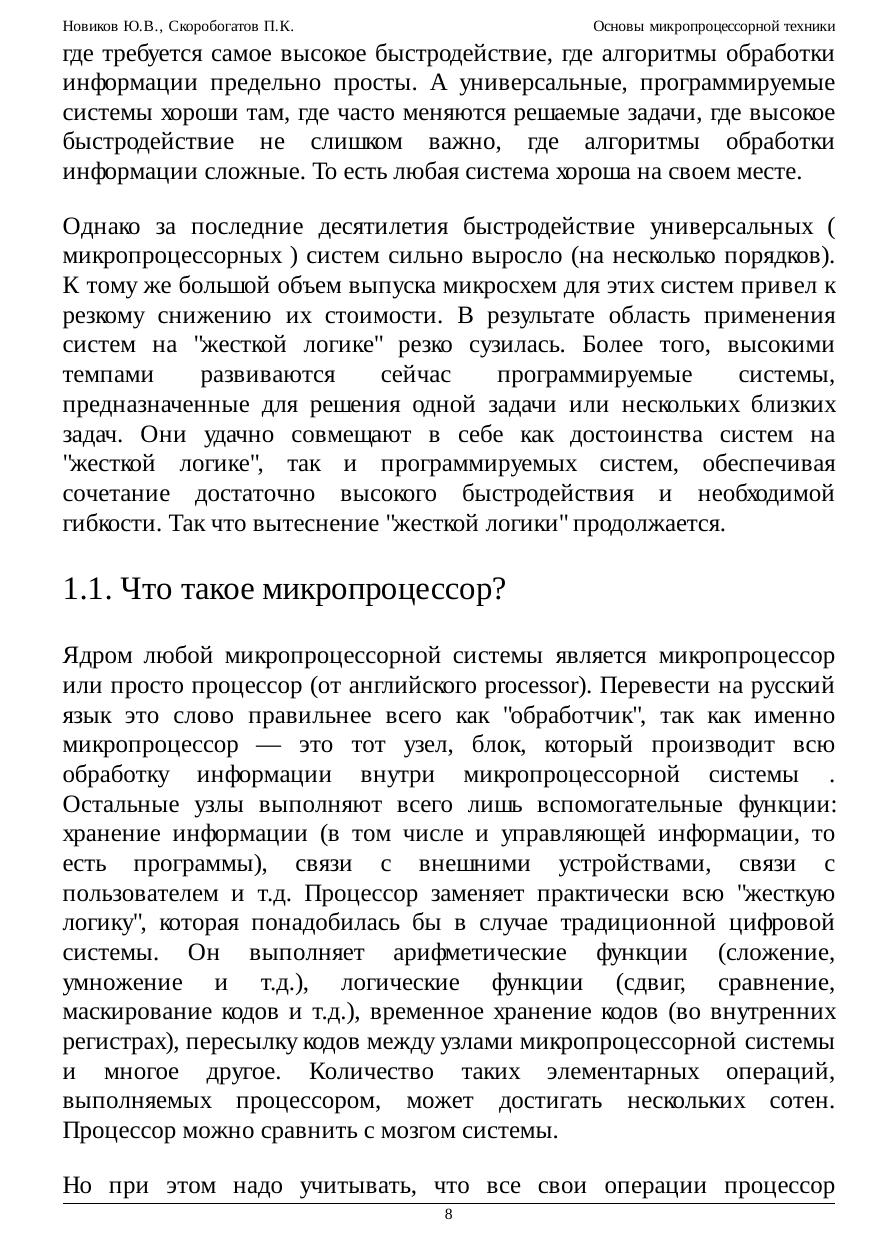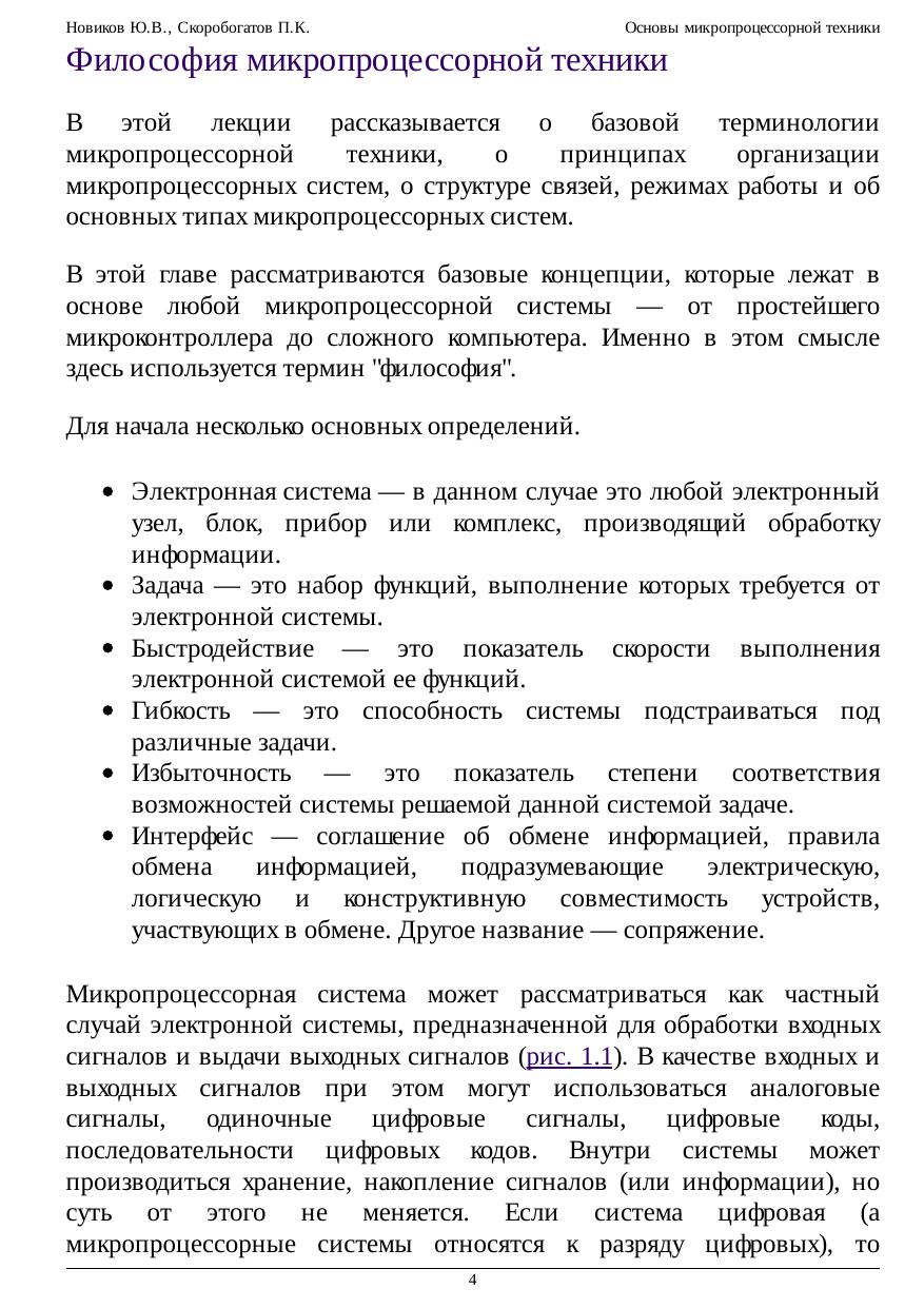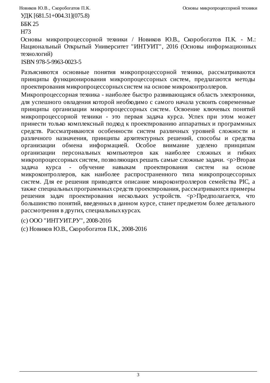 Разъясняются основные понятия микропроцессорной техники, рассматриваются принципы функционирования микропроцессорных систем, предлагаются методы проектирования микропроцессорных систем на основе микроконтроллеров. Микропроцессорная техника - наиболее быстро развивающаяся область электроники, для успешного овладения которой необходимо с самого начала усвоить современные принципы организации микропроцессорных систем. Освоение ключевых понятий микропроцессорной техники - это первая задача курса. Успех при этом может принести только комплексный подход к проектированию аппаратных и программных средств. Рассматриваются особенности систем различных уровней сложности и