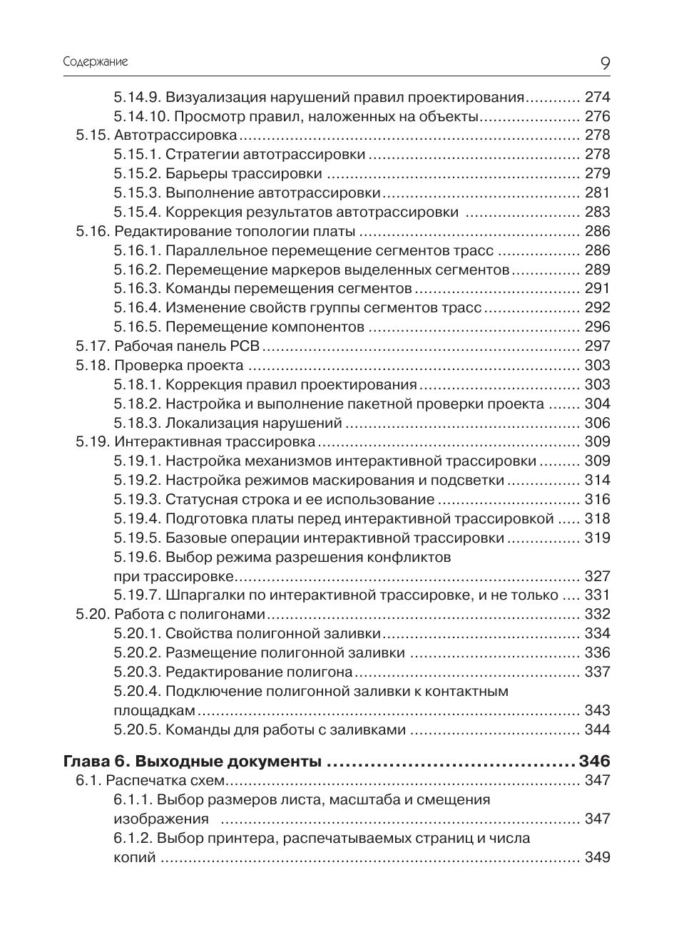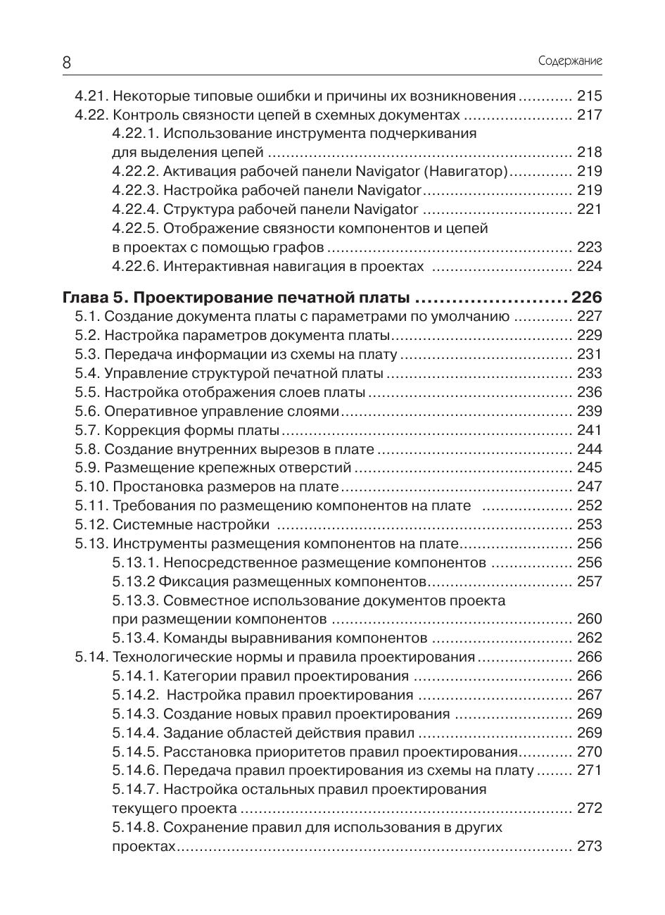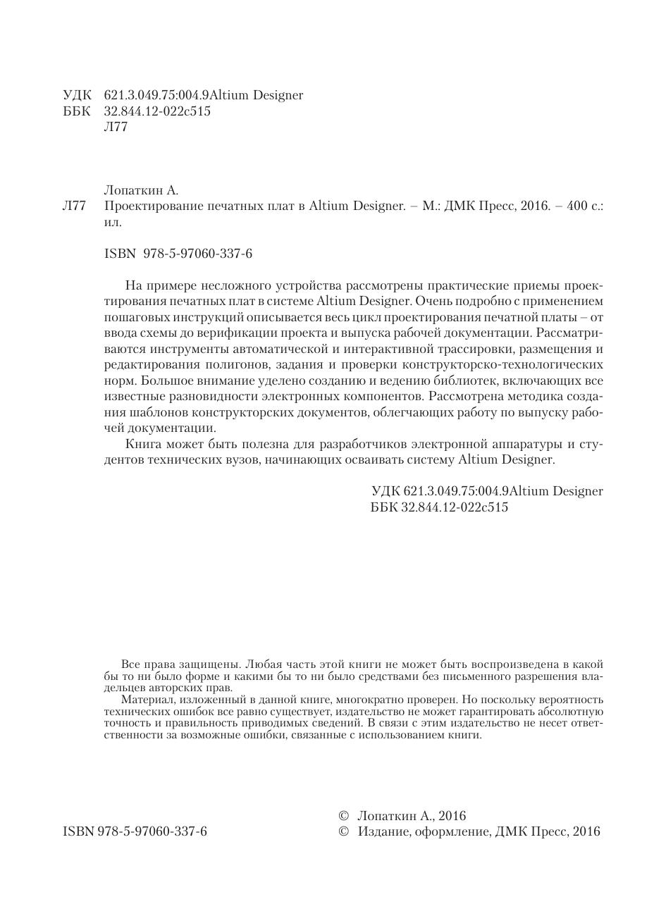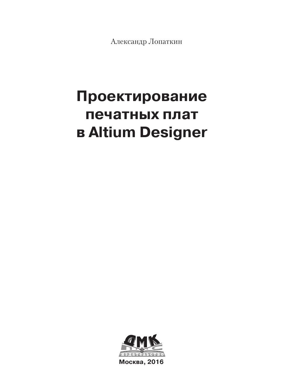 На примере несложного устройства рассмотрены практические приемы проектирования печатных плат в системе Altium Designer. Очень подробно с применением пошаговых инструкций описывается весь цикл проектирования печатной платы – от ввода схемы до верификации проекта и выпуска рабочей документации. Рассматриваются инструменты автоматической и интерактивной трассировки, размещения и редактирования полигонов, задания и проверки конструкторско-технологических норм. Большое внимание уделено созданию и ведению библиотек, включающих все известные разновидности электронных компонентов. Рассмотрена методика создания шаблонов конструкторских документов, облегчающих работу по выпуску рабочей документации. Книга может быть полезна для разработчиков электронной аппаратуры и студентов технических вузов, начинающих осваивать систему Altium Designer.